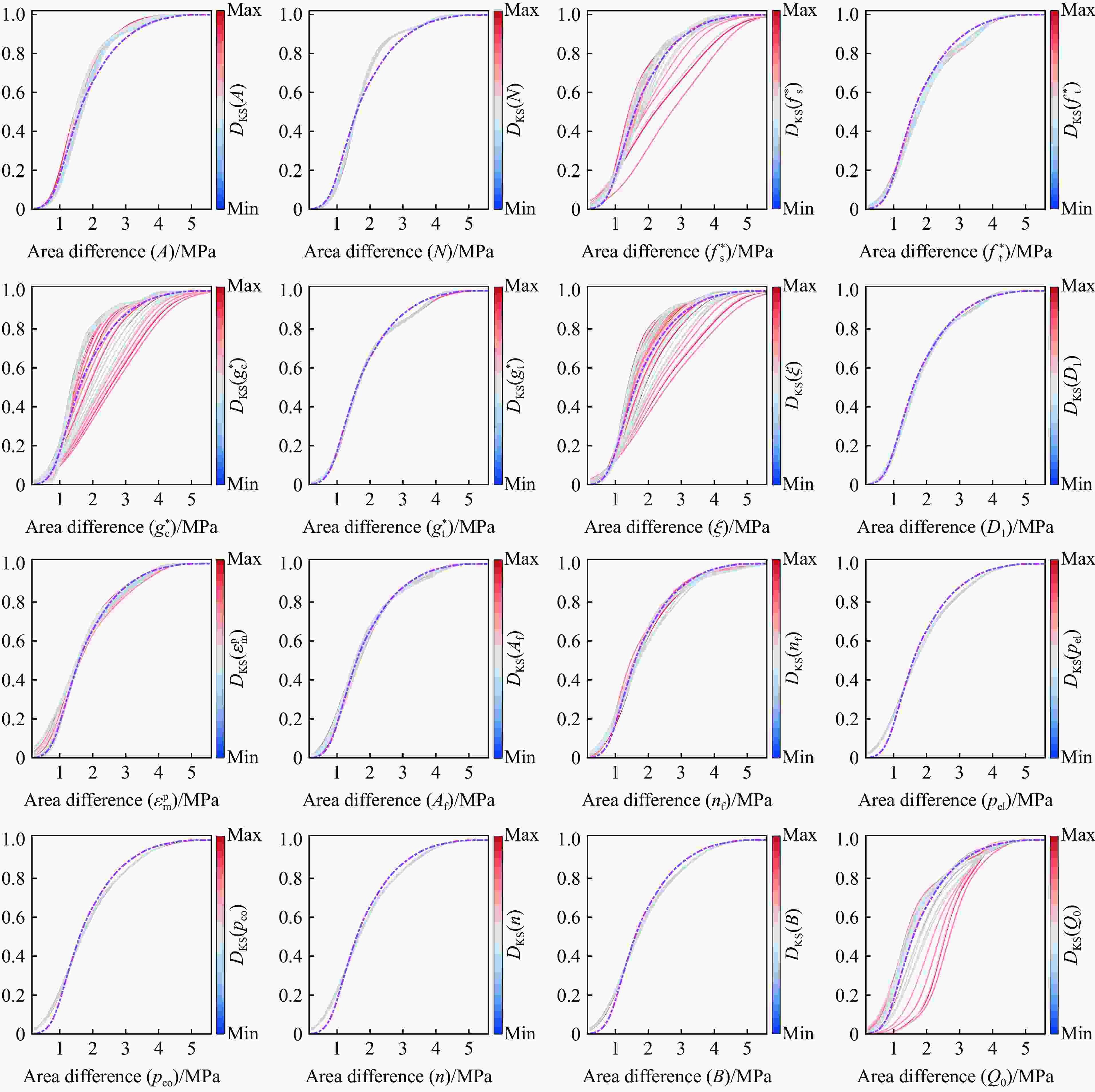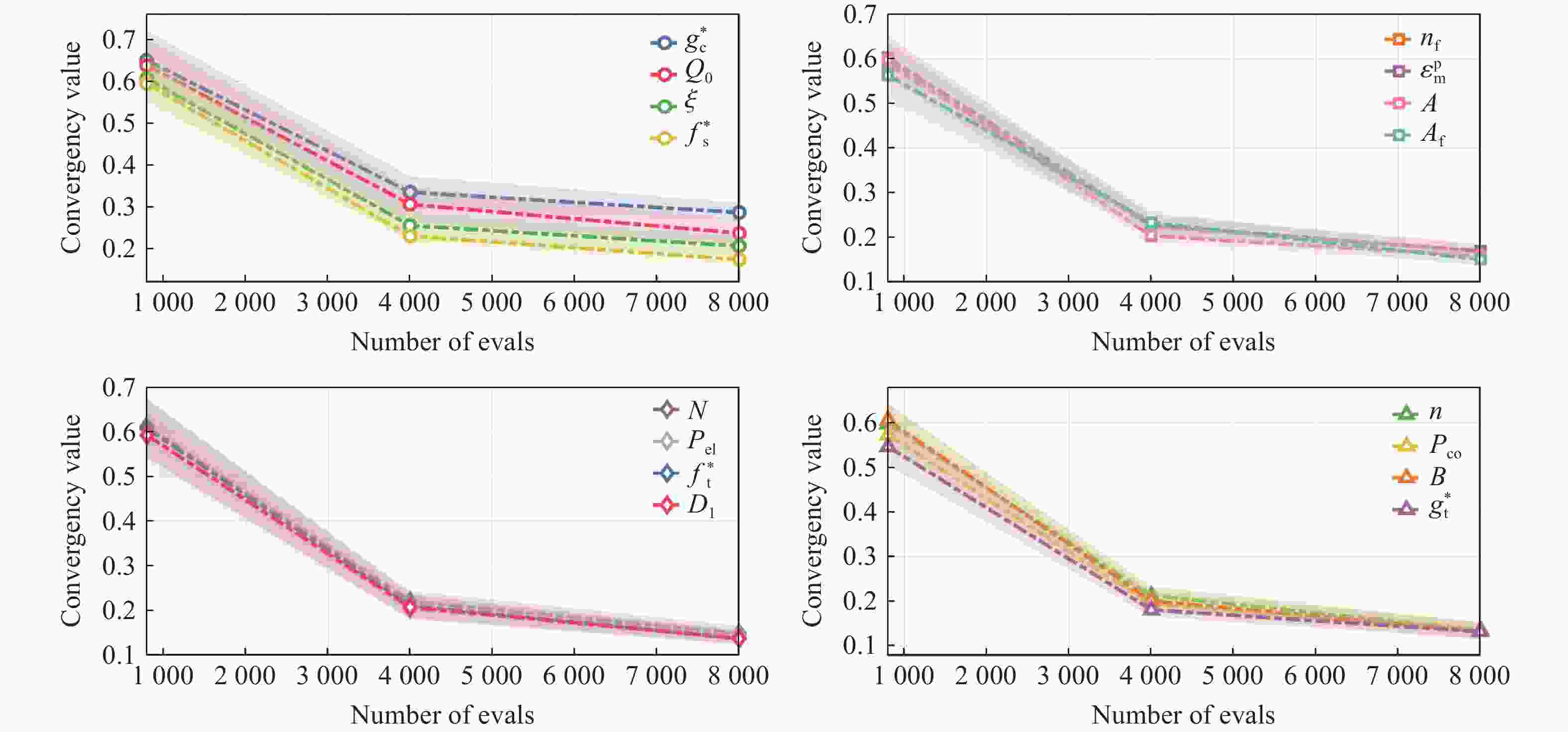 参数 范围 参数 范围 A [0.1, 3] Af [0.2, 3] N [0.4, 1] nf [0.2, 3] $ f_{\text{s}}^{\text{*}} $ [0.01, 0.95] $ \varepsilon _{\text{m}}^{\text{p}} $ [0.01, 0.05] $ f_{\text{t}}^{\text{*}} $ [0.01, 0.95] D1 [0.01, 0.05] $ g_{\text{c}}^{\text{*}} $ [0.1, 0.95] B [ 0.0021 ,0.0189 ]$ g_{t}^{\text{*}} $ [0.1, 0.95] Q0 [0.136, 1.224] $ \xi $ [0.1, 0.95] pco/GPa [1, 7] n [2, 5] pel/MPa [60, 300] 表 4 待反演参数上下限