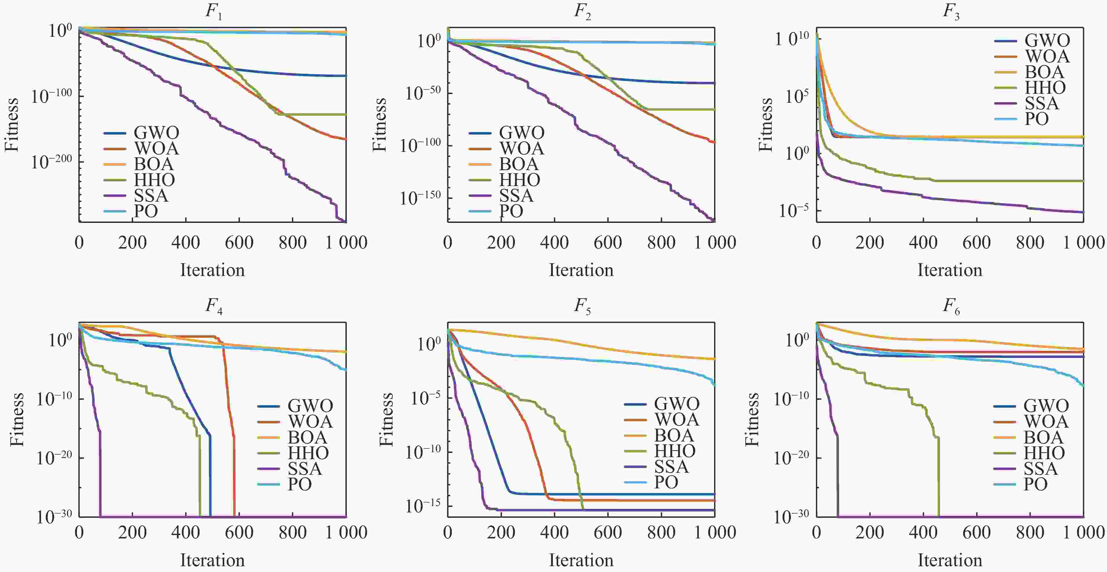 算法 参数 参数取值 算法 参数 参数取值 GWO 收敛因子τ 从2到0 HHO 搜索开发切换参数ε 2.0 协同系数向量(u) [−u,u] 围攻策略参数γ 1.5 协同系数向量(w) [0,2]区间随机取值 随机跳跃强度J 0.3 WOA 搜索因子g 从2到0 SSA 发现者比例 20% 螺旋形态参数k 1 警戒者比例 10% 随机向量M、N $ M\in[- a ,a] $;$ N\in $[0,2] 安全阈值 0.8 PO 社交权重ωs 0.5 BOA 感知概率$ \psi $ 0.7 探索概率η 0.7 扰动系数β 0.05 气味强度系数c 0.03 学习因子λ 0.3 表 7 各算法性能比较