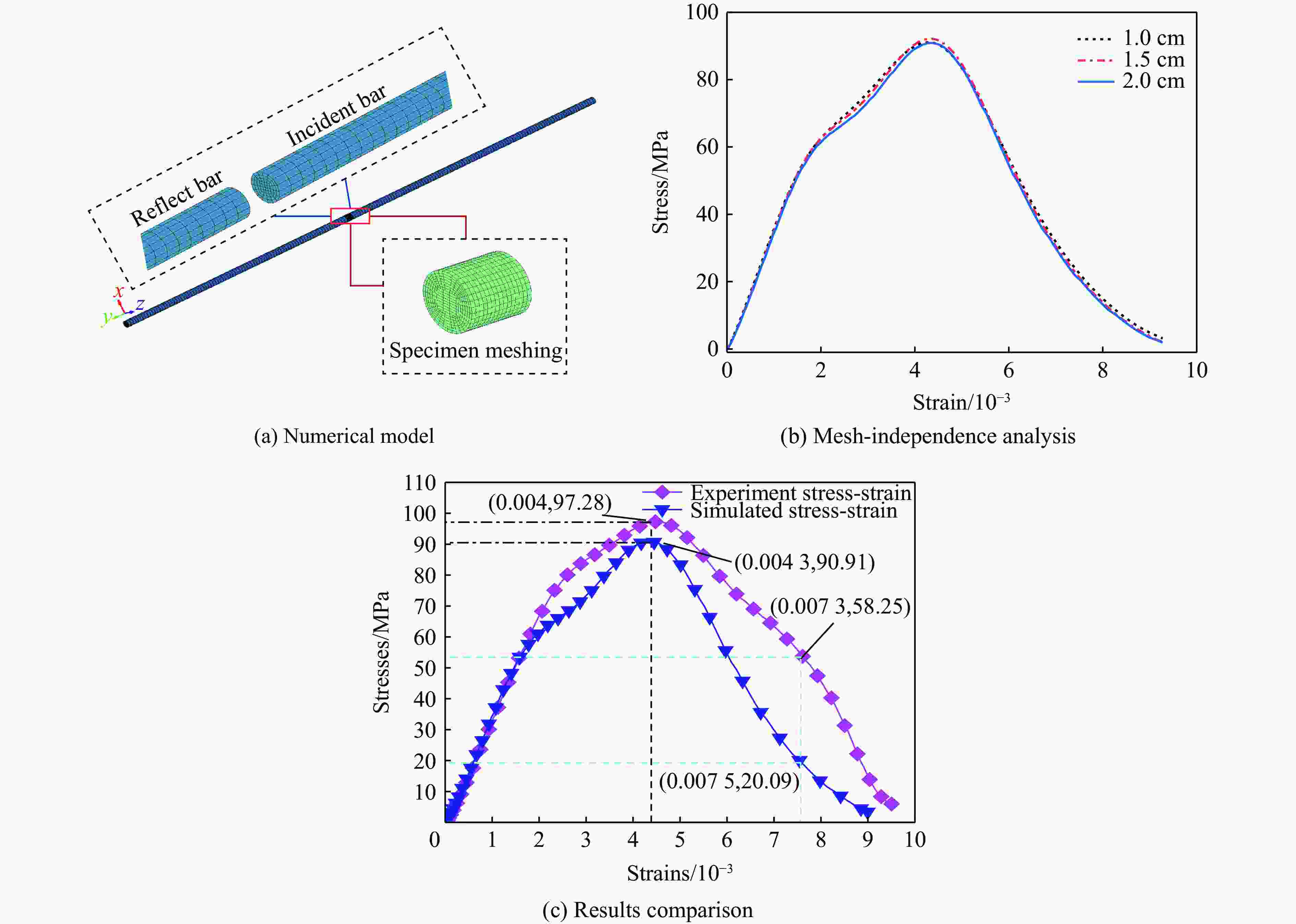 参数 取值 参数 取值 参数 取值 fc/MPa 259 Af 2.01 A1/GPa 32.95 ρ0/(g·cm−3) 2.63 nf 1.11 A2/GPa 47.45 A 2.09 $ \varepsilon _{\text{m}}^{\text{p}} $ 0.0138 A3/GPa 19.28 N 0.76 D1 0.048 B0 1.44 $ f_{\text{s}}^{\text{*}} $ 0.24 D2 1 B1 1.44 $ f_{\text{t}}^{\text{*}} $ 0.049 B 0.0105 βc 0.0072 $ g_{\text{c}}^{\text{*}} $ 0.647 Q0 0.272 βt 0.005 $ g_{\text{t}}^{\text{*}} $ 0.7 pel/MPa 172.6 pco/GPa 6 $ \xi $ 0.7 α0 1.06 n 3 -