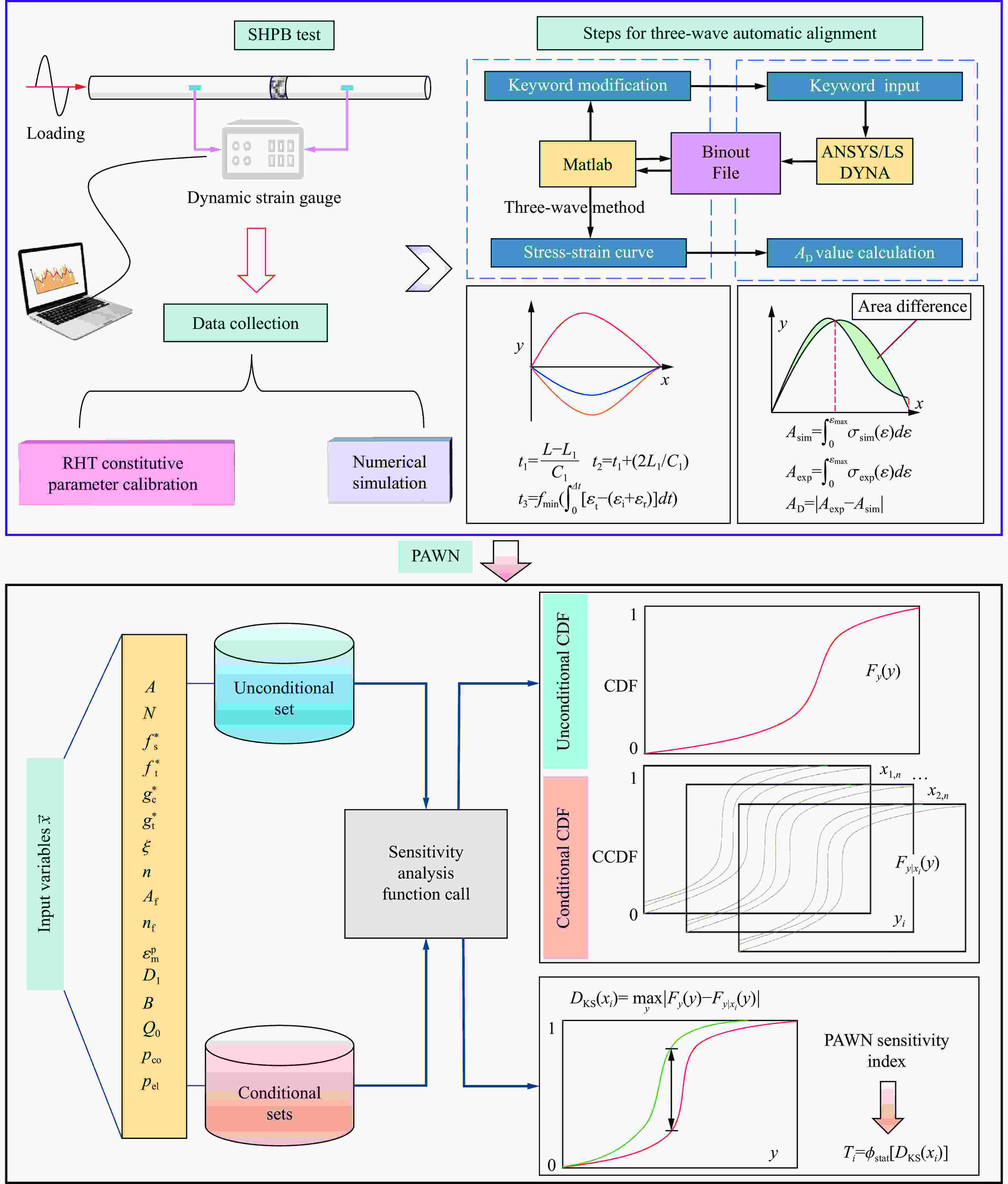 摘要: 针对Riedel-Hiermaier-Thoma (RHT)本构模型中16个难以标定的参数,基于Pianosi-Wagener (PAWN)全局敏感性分析方法与智能优化算法,联合Matlab与ANSYS/LS-DYNA仿真计算平台,引入应力-应变曲线面积差作为核心评价指标,开发了计算结果的批量提取与自动化三波对齐技术,构建了一套高效、可靠的RHT本构参数反演体系,首次实现了RHT模型关键参数的全局敏感性分析与自动化反演。结果表明,在16个难以标定参数中,仅有8个参数对模型响应具有显著影响;基于智能优化算法的参数反演相对误差控制在0.23%~9.28%之间,并通过半圆盘三点弯试验与缩尺爆破试验验证其可靠性。该方法显著提升了RHT本构参数的标定效率与准确性,不依赖于构建庞大的样本数据集,适用于多种荷载工况下的参数标定。相较于传统方法,仅需不到15次迭代即可满足反演精度,能满足计算效率与精度的双重需求,具有良好的工程适用性。Abstract: The Riedel-Hiermaier-Thoma (RHT) constitutive model has been widely applied in tunnel blasting, impact-resistant structural design, and underground protective engineering due to its strong capability to describe the mechanical behavior of brittle materials such as rock and concrete under high-strain-rate and high-pressure conditions. However, the model involves a large number of nonlinear parameters, some of which are difficult to determine experimentally because of the high cost of testing. These key parameters are often adjusted through trial-and-error methods, which limit both modeling efficiency and simulation accuracy. To overcome these limitations, a comprehensive parameter inversion framework was developed for 16 difficult-to-calibrate parameters of the RHT model. The framework integrated the PAWN (Pianosi-Wagener) global sensitivity analysis method with intelligent optimization algorithms and coupled MATLAB with the ANSYS/LS-DYNA simulation platform. The area difference of the stress-strain curve was introduced as the core evaluation metric, and a batch result-extraction and automated three-wave alignment technique was developed. Based on these developments, an efficient and reliable RHT parameter inversion system was established, achieving, for the first time, a global sensitivity analysis (GSA) and automated inversion of key parameters in the RHT model. The results show that, among the 16 parameters analyzed, only eight exert a significant influence on the model response. The intelligent optimization–based inversion achieved relative errors ranging from 0.23% to 9.28%, and the reliability of the calibrated parameters was verified through Semicircular Bend Split Hopkinson Pressure Bar (SCB-SHPB) tests and scaled blasting experiments. The proposed method significantly enhances both the efficiency and accuracy of RHT parameter calibration without the need to construct large sample datasets, and it is applicable to a wide range of loading conditions. Compared with traditional calibration approaches, the required inversion accuracy was achieved in fewer than 15 iterations, meeting the dual demands of computational efficiency and precision. Overall, the proposed framework provides a new and effective approach for sensitivity analysis and parameter calibration of dynamic constitutive models, demonstrating strong engineering applicability and practical value.