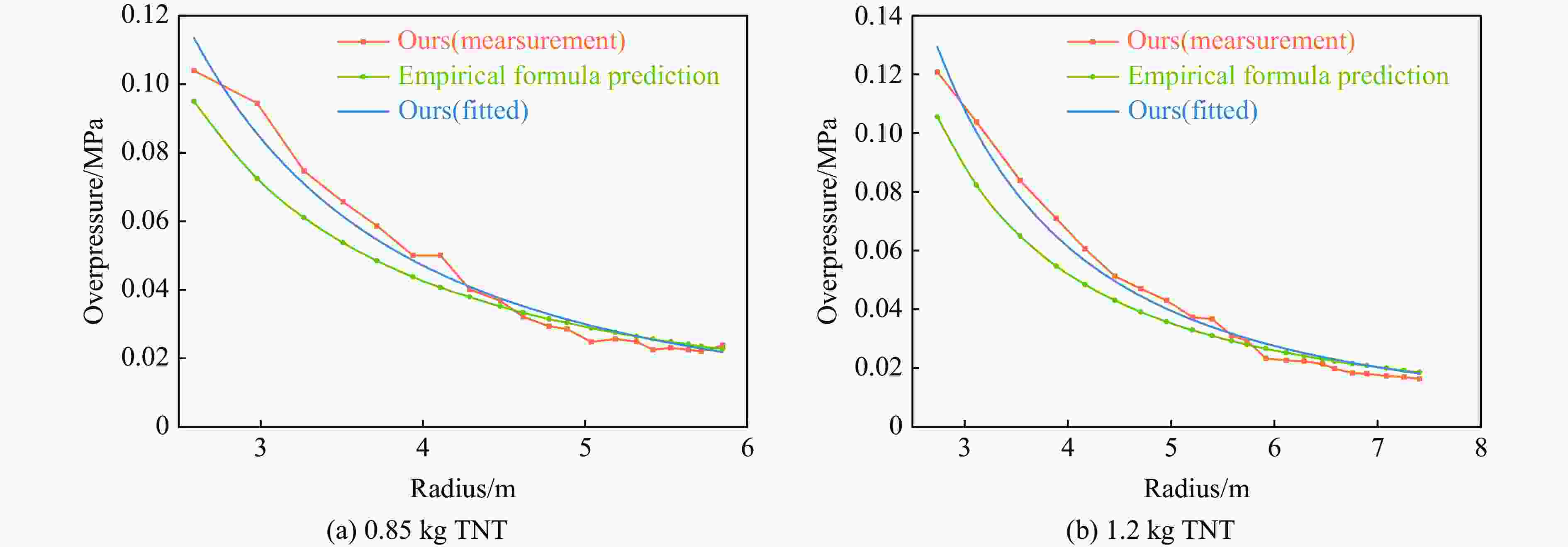 方法 平均绝对误差/pixels 均方误差/pixels $\mathrm{R}^2$ LSM 5.72 8.28 0.86 NSWPM-CFA 3.2 3.0 0.90 SWPM-CFA(Ours) 2.95 2.20 0.94 表 3 0.85 kg TNT 当量条件下本方法测量结果误差统计