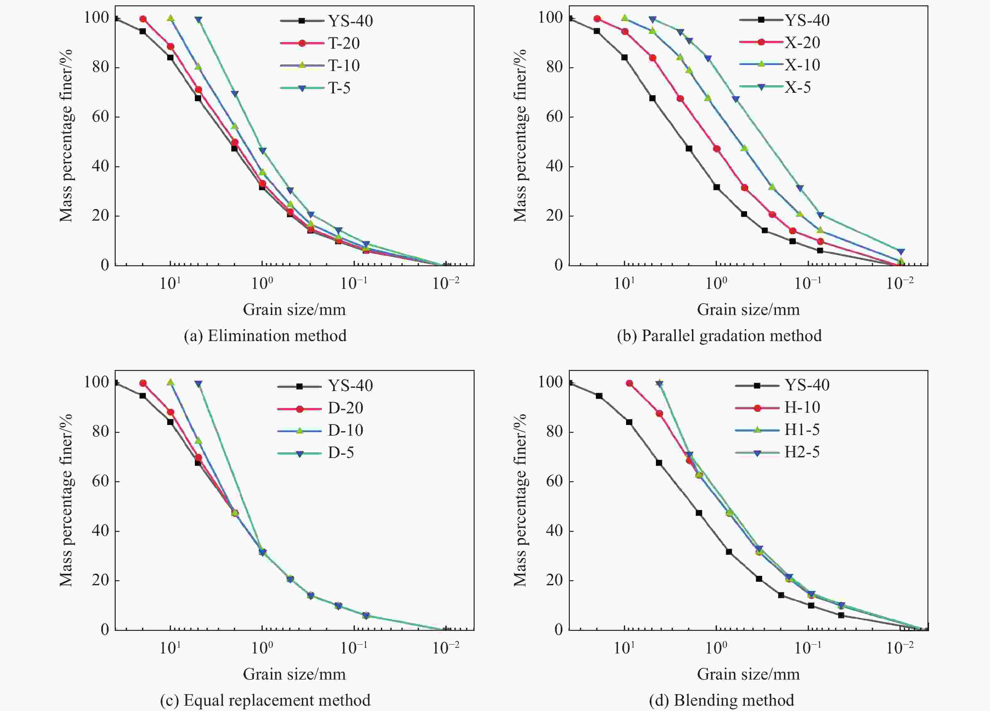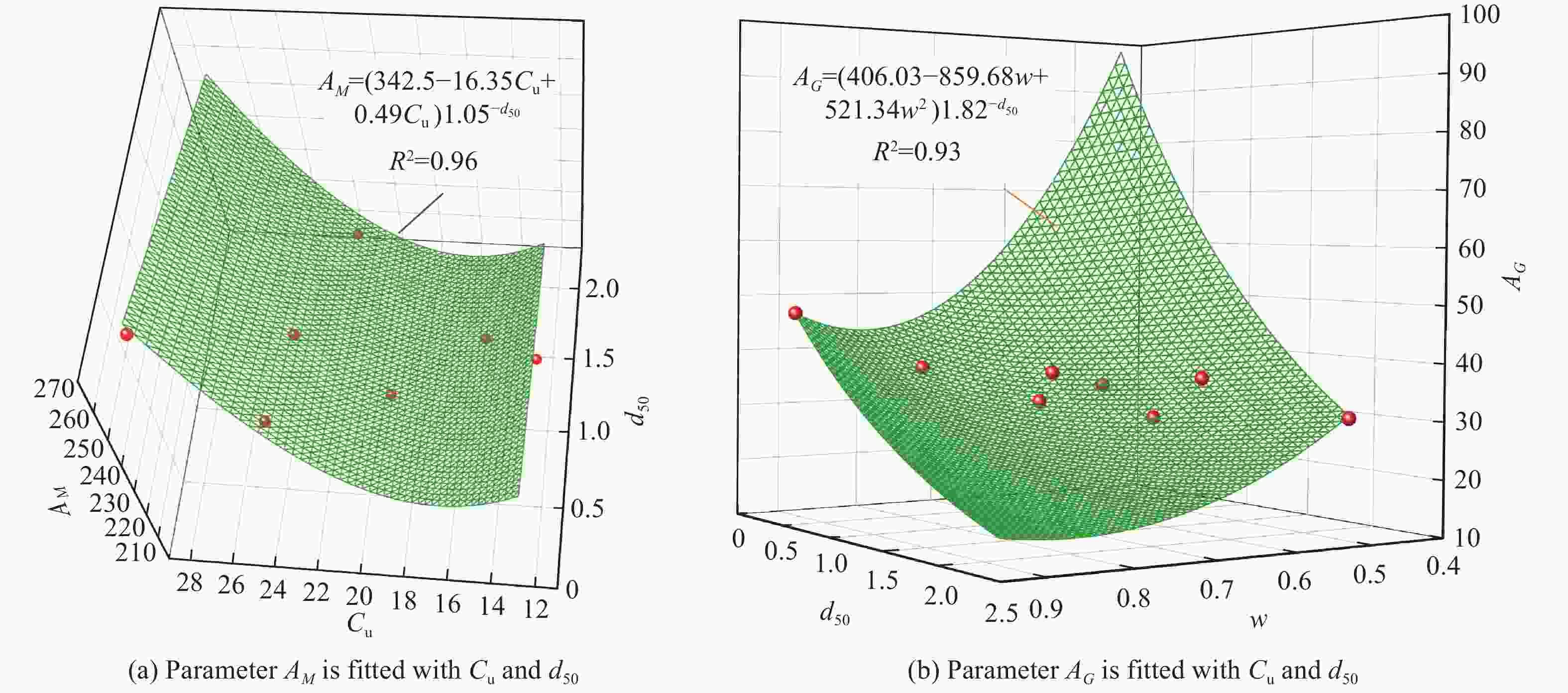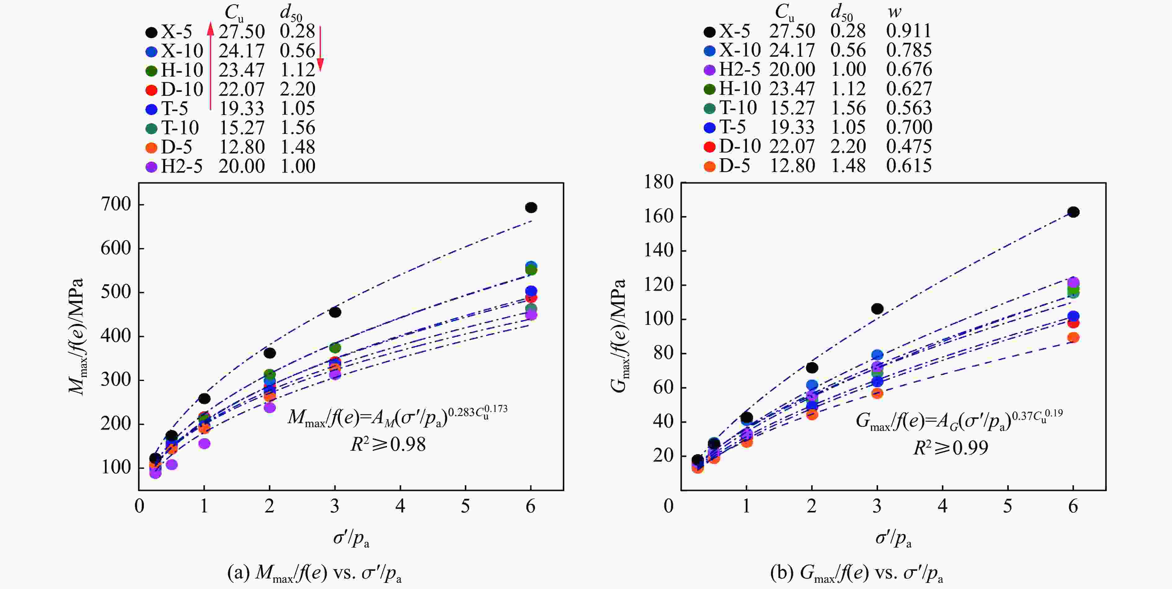 试样 dmax/mm w/% ρmax/(g·cm−3) ρmin/(g·cm−3) d50/mm Cu Cc Dr ρs/(g·cm−3) emax emin e0 YS-40 40 47.50 2.224 1.485 2.45 23.53 1.40 0.83 2.050 0.865 0.246 0.351 T-20 20 50.00 2.236 1.563 2.00 20.40 1.33 0.83 2.084 0.772 0.239 0.329 D-20 20 47.50 2.226 1.560 2.25 23.53 1.40 0.83 2.075 0.776 0.244 0.335 X-20 20 62.70 2.22 1.552 1.13 23.47 1.34 0.83 2.069 0.784 0.248 0.339 T-10 10 56.30 2.233 1.549 1.56 15.27 1.19 0.83 2.077 0.788 0.240 0.334 D-10 10 47.50 2.228 1.562 2.20 22.07 1.46 0.83 2.077 0.774 0.243 0.333 X-10 10 78.50 2.202 1.448 0.56 24.17 1.41 0.83 2.023 0.913 0.258 0.369 H-10 10 62.70 2.245 1.515 1.12 23.47 1.34 0.83 2.075 0.828 0.234 0.335 T-5 5 70.00 2.213 1.491 1.05 19.33 2.03 0.83 2.045 0.858 0.252 0.355 D-5 5 61.50 2.230 1.532 1.48 12.80 2.22 0.83 2.070 0.808 0.242 0.338 X-5 5 91.10 2.110 1.331 0.28 27.50 1.72 0.83 1.919 1.082 0.313 0.444 H1-5 5 65.00 2.213 1.493 1.10 22.13 1.42 0.83 2.045 0.855 0.252 0.354 H2-5 5 67.60 2.218 1.497 1.00 20.00 1.35 0.83 2.050 0.850 0.249 0.351 表 2 不同试样模型参数$A_G $、$A_M $与$R^2 $