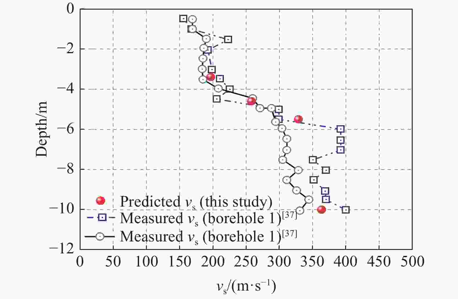 试样 AG nG R2 AM nM R2 T-10 36.29 0.621 0.99 202.62 0.477 0.99 D-10 30.33 0.666 0.99 206.11 0.490 0.99 X-10 37.15 0.678 0.99 224.62 0.500 0.99 H-10 34.49 0.67 0.99 224.85 0.495 0.99 T-5 31.78 0.641 0.99 207.93 0.486 0.99 D-5 29.45 0.606 0.99 200.15 0.462 0.99 X-5 46.98 0.708 0.99 269.72 0.508 0.99 H2-5 36.72 0.645 0.99 182.22 0.487 0.98 试样 深度/m ρd e w/% d50/mm Cu σ'/kPa G/MPa vs/(m·s−1) vs0/(m·s−1) S2-1a 3.19~3.39 1 500 0.832 100.00 0.16 1.8 49 58.20 196.9 185~211 S1-2a 4.49~4.69 2 340 0.159 65.00 2.00 147.0 69 156.10 258.2 226~263 S1-2c 5.38~5.58 2 450 0.100 40.00 4.00 300.0 88 230.20 328.7 294~327 S2-5a 9.90~10.10 2 240 0.214 57.80 0.94 141.2 137 295.86 363.4 331~400 表 4 离心模型比尺