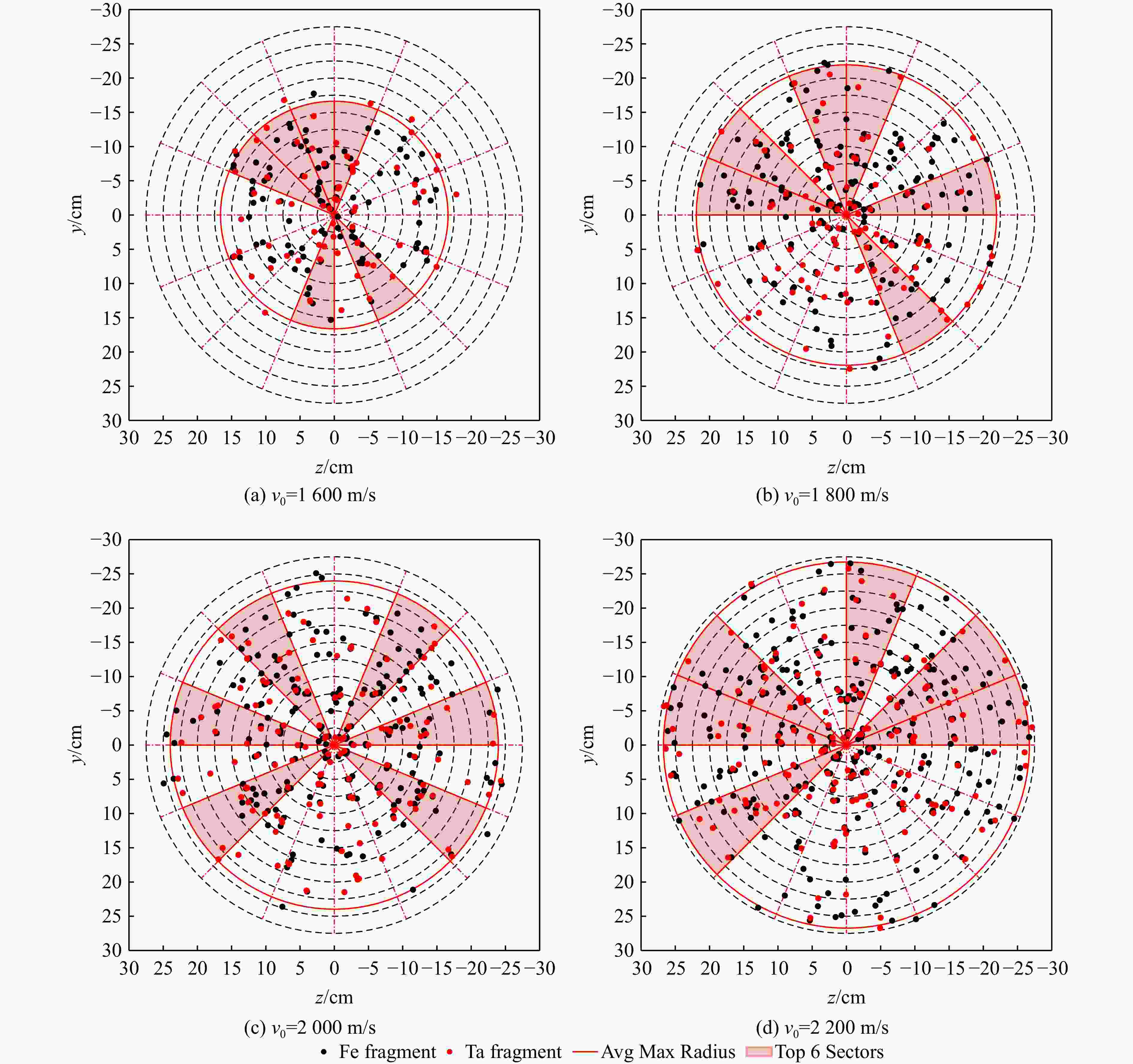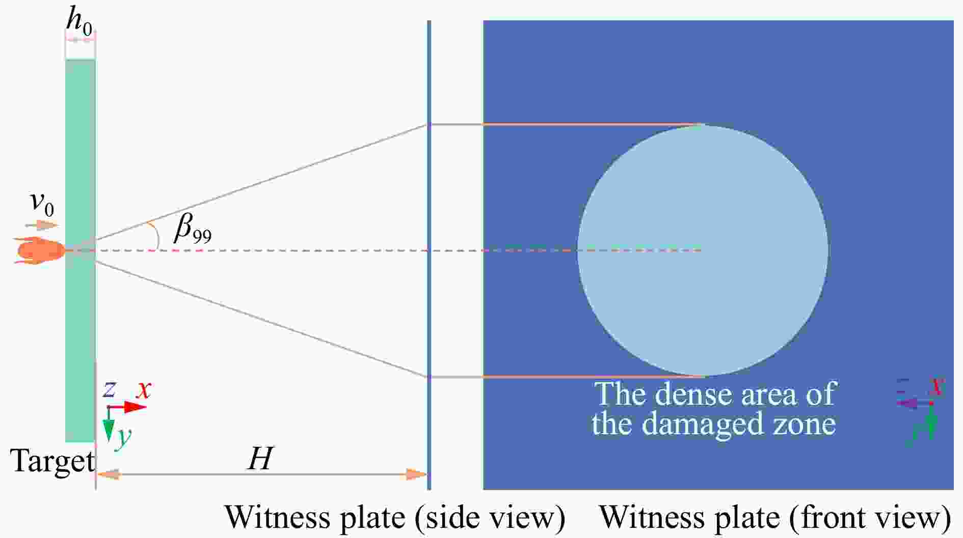 δ/%硬度 Ta_2.5W 223 354 50 130HV 45钢 ≥ 355 ≥ 600 ≥ 16 ≤ 229HBW 材料 ρ0/(g·cm−3) A/MPa B/MPa n c m D1 D2 D3 D4 D5 Ta_2.5W 16.70 211 381 0.75 0.068 0.38 1.355 1.833 -1.93 0.015 1.868 P1/GPa c0/(m·s−1) S1 S2 S3 a γ0 5.6 3410 1.2 0 0 0.42 1.67 表 4 靶后破片云形貌特征尺寸数值模拟与试验对比