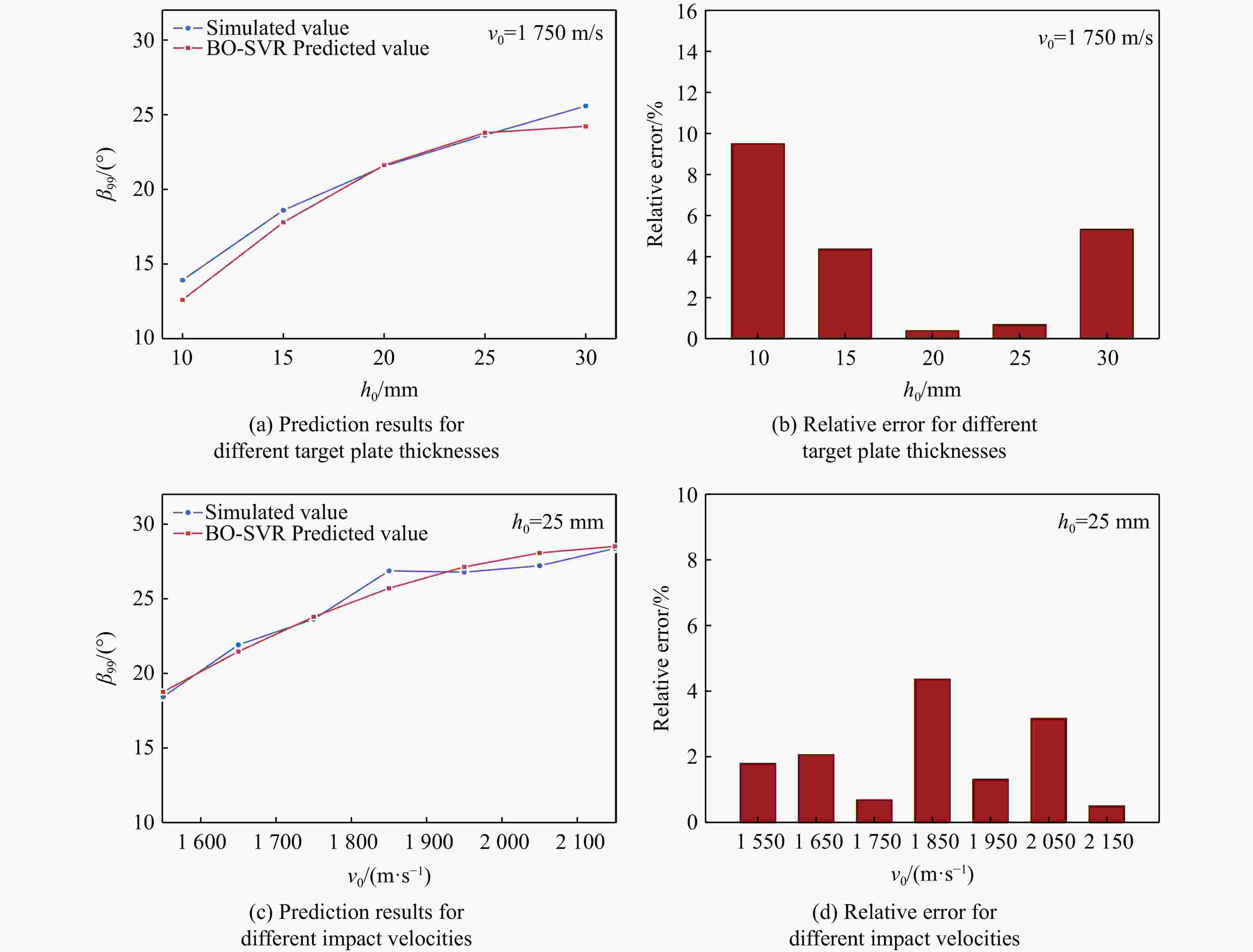 设计变量 变量值 工况数 v0/(m·s−1) 1500 ,1600 ,1700 ,1800 ,1900,2000,2100 ,2200 8 h0/mm 10,15,20,25,30 5 表 6 BO-SVR模型的预测性能