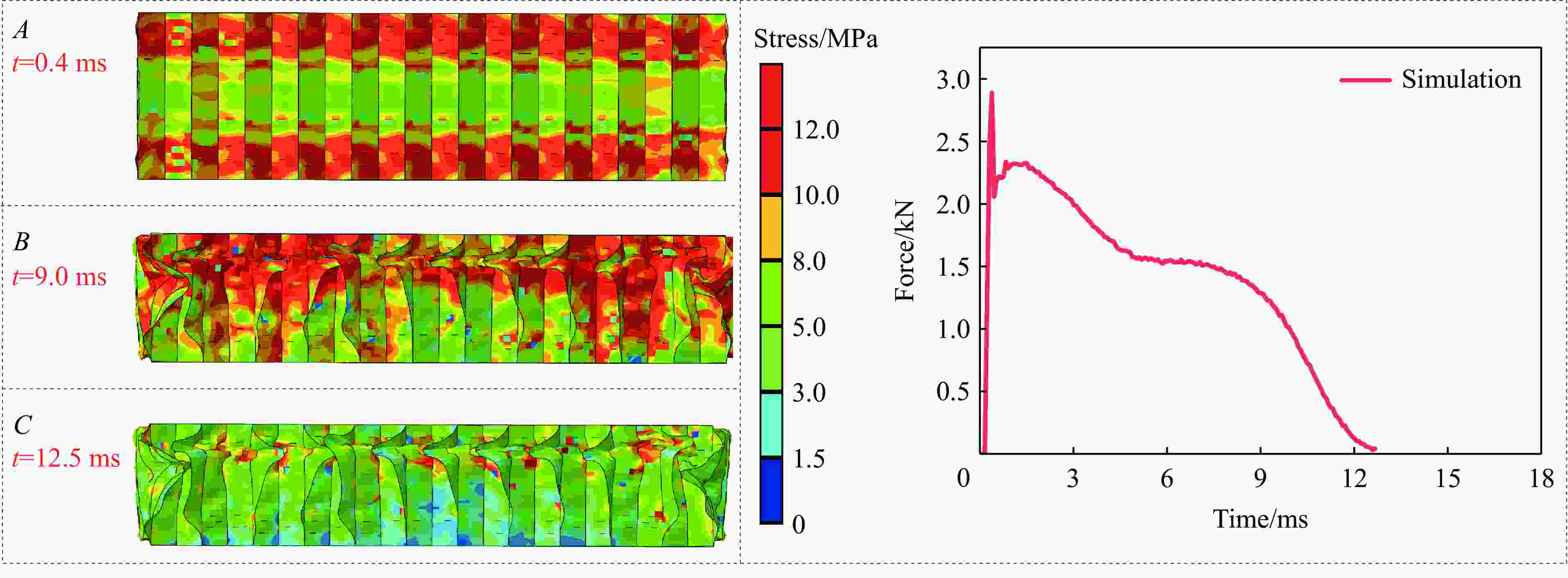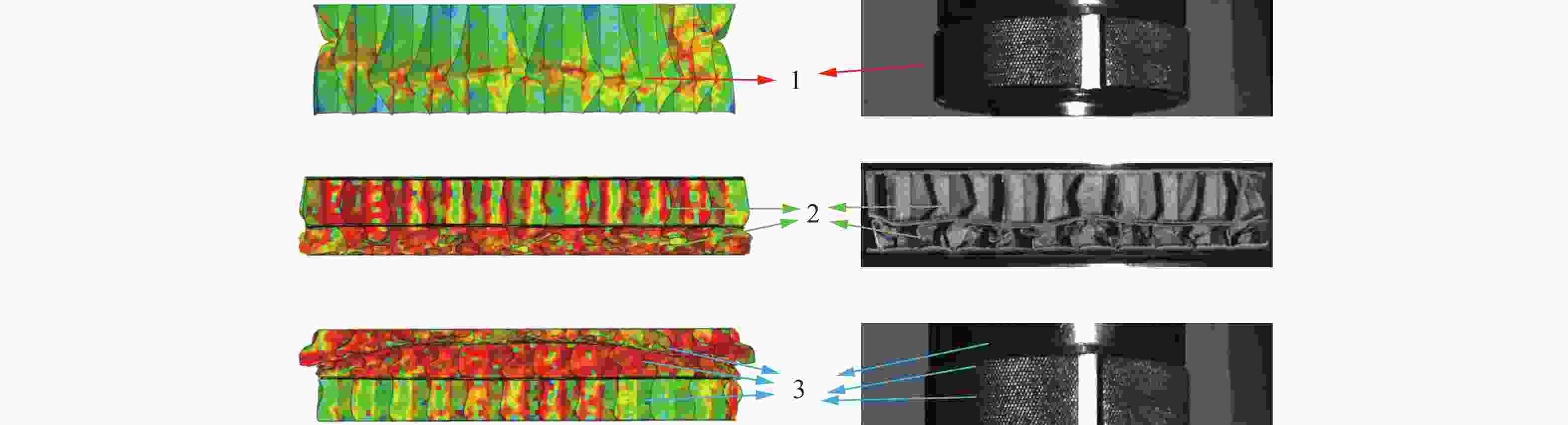 MPa蜂窝面纸 695 2.525 0.30 20.3 蜂窝芯纸(0.001 s−1) 520 0.800 0.32 7.3 蜂窝芯纸(50 s−1) 520 0.800 0.32 21.4 钢板 7 890 210.000 0.31 220.0 表 5 模拟与试验的结果对比