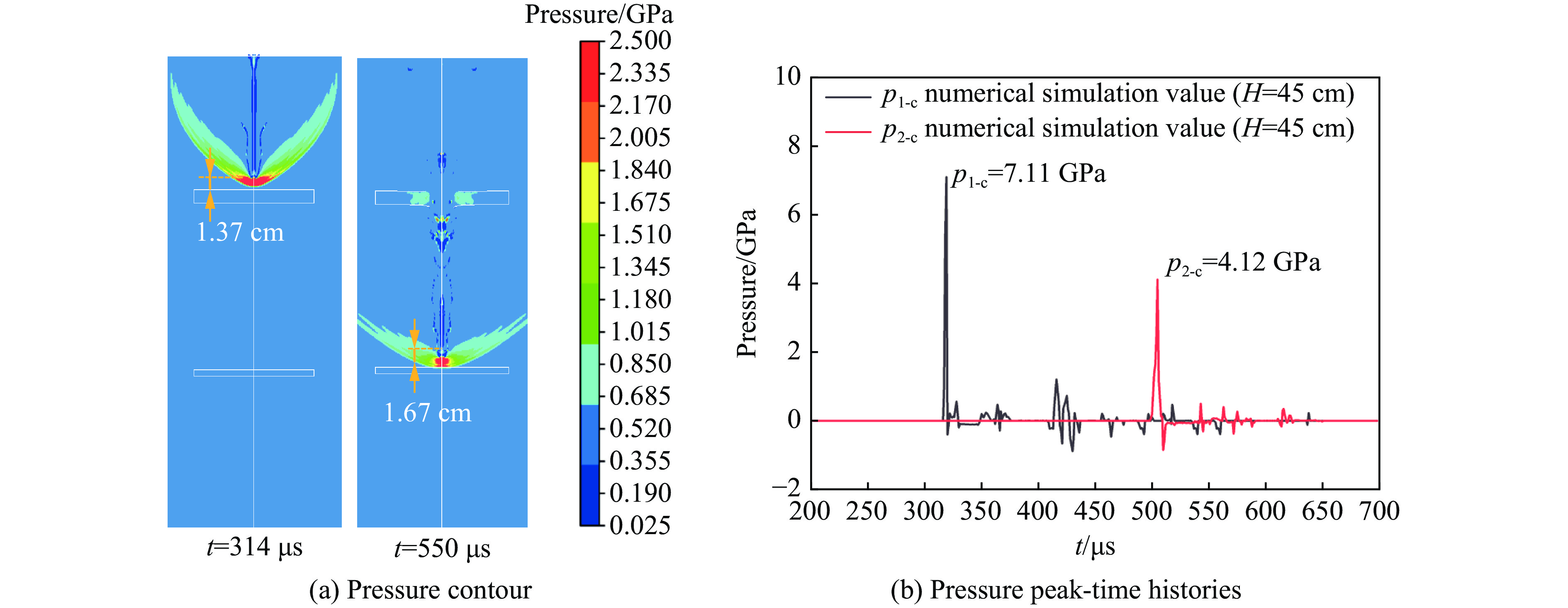 为了选择适合水中大距离非接触性侵彻毁伤的聚能装药结构,针对爆炸成型弹丸(explosively formed projectile, EFP)、杆式射流(jetting projectile charge, JPC)、聚能射流(shaped charge jet, SCJ)3种典型聚能装药结构,开展了不同侵彻体入水前、着靶前、穿靶后的速度测试及对水中双层间隔靶的侵彻试验。建立了靶前水介质长度在0~100 cm时的水中侵彻数值计算模型,分析了靶前水介质长度对聚能装药水中毁伤元时序特性、水中前向冲击波压力峰值、水中侵彻速度及水中双层间隔靶侵彻性能的影响。结果表明:3种聚能装药侵彻水中间隔靶时,前向冲击波均先于侵彻体到达靶板。随着水介质长度的增大,前靶板处的前向冲击波压力峰值呈线性下降,后靶板处的前向冲击波压力峰值呈非线性下降;EFP、JPC和SCJ速度呈非线性下降,其SCJ靶前速度约是JPC的2倍。在靶前水介质长度不大于25 cm时,EFP在前靶板上形成的最大穿孔直径达到了5 cm,是JPC穿孔直径的1.3倍,是SCJ穿孔直径的3倍;在靶前水介质长度不大于100 cm时,JPC和SCJ对双层间隔靶具有较好的侵彻效果,且JPC的侵彻性能要优于SCJ。