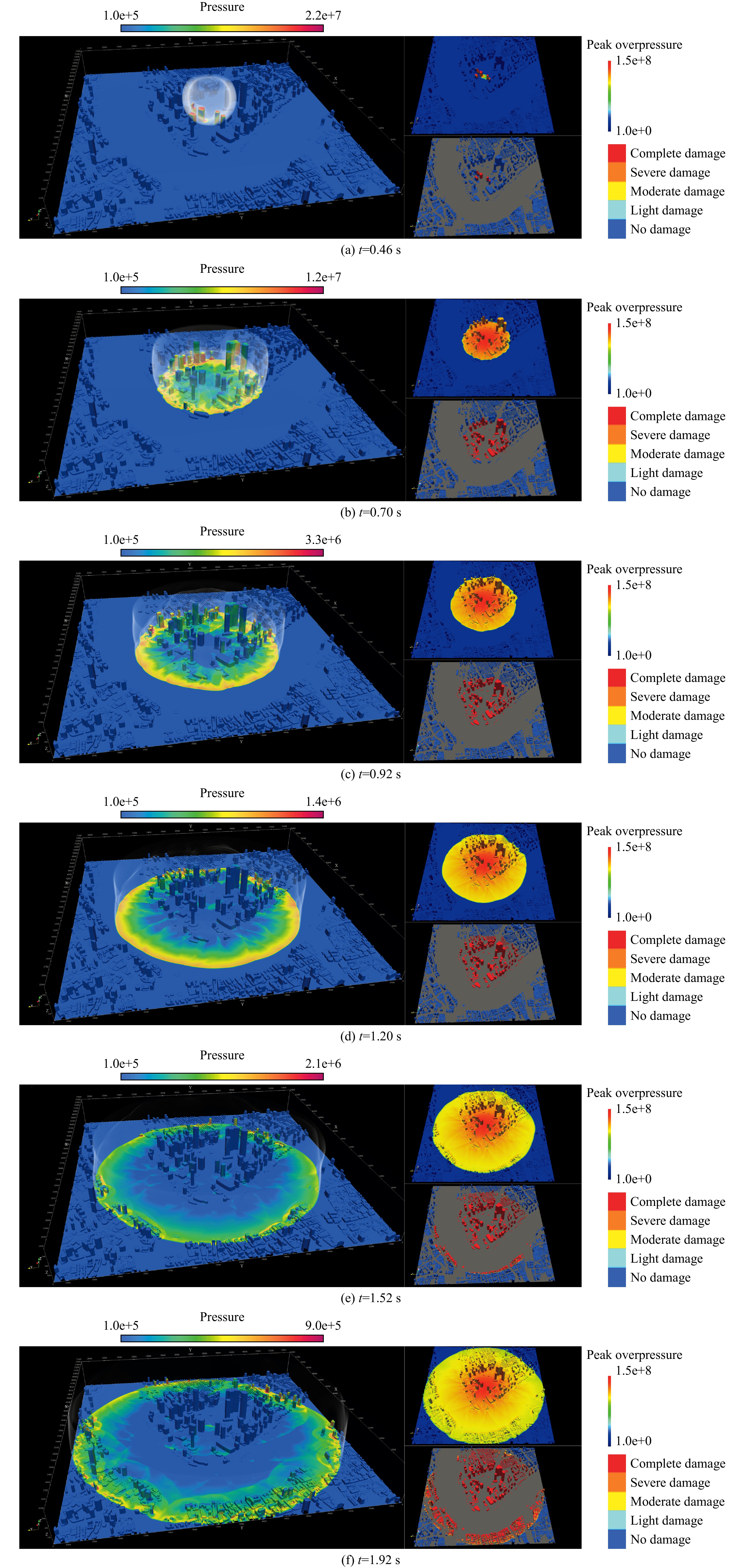 为实现大尺度复杂空间范围内强爆炸冲击波的高效数值模拟。基于扩散界面多组分模型,建立适用于极端条件、任意多介质相互作用的可压缩多相流数值方法,并结合人工智能技术,提出一种具有MUSCL-THINC-BVD特征的且兼具鲁棒性、低耗散、高效率重构方法。该方法能够在激波、接触间断和物质界面等关键区域自适应选择最优重构方式,实现全局数值耗散最小化,同时较传统BVD(boundary variation diminishing)框架下的格式具有更高的计算效率。进一步结合全球地理信息系统,发展了自动化几何建模与网格剖分技术、网格自适应及大规模并行计算方法,从而能够高效处理网格规模达数十亿、压力范围覆盖103~1015 Pa、模拟区域不小于10 km的大尺度复杂城市环境中的强爆炸冲击波问题。通过对复杂地形及真实城市建筑条件下冲击波传播过程的完整数值模拟,验证了数值方法可靠性。