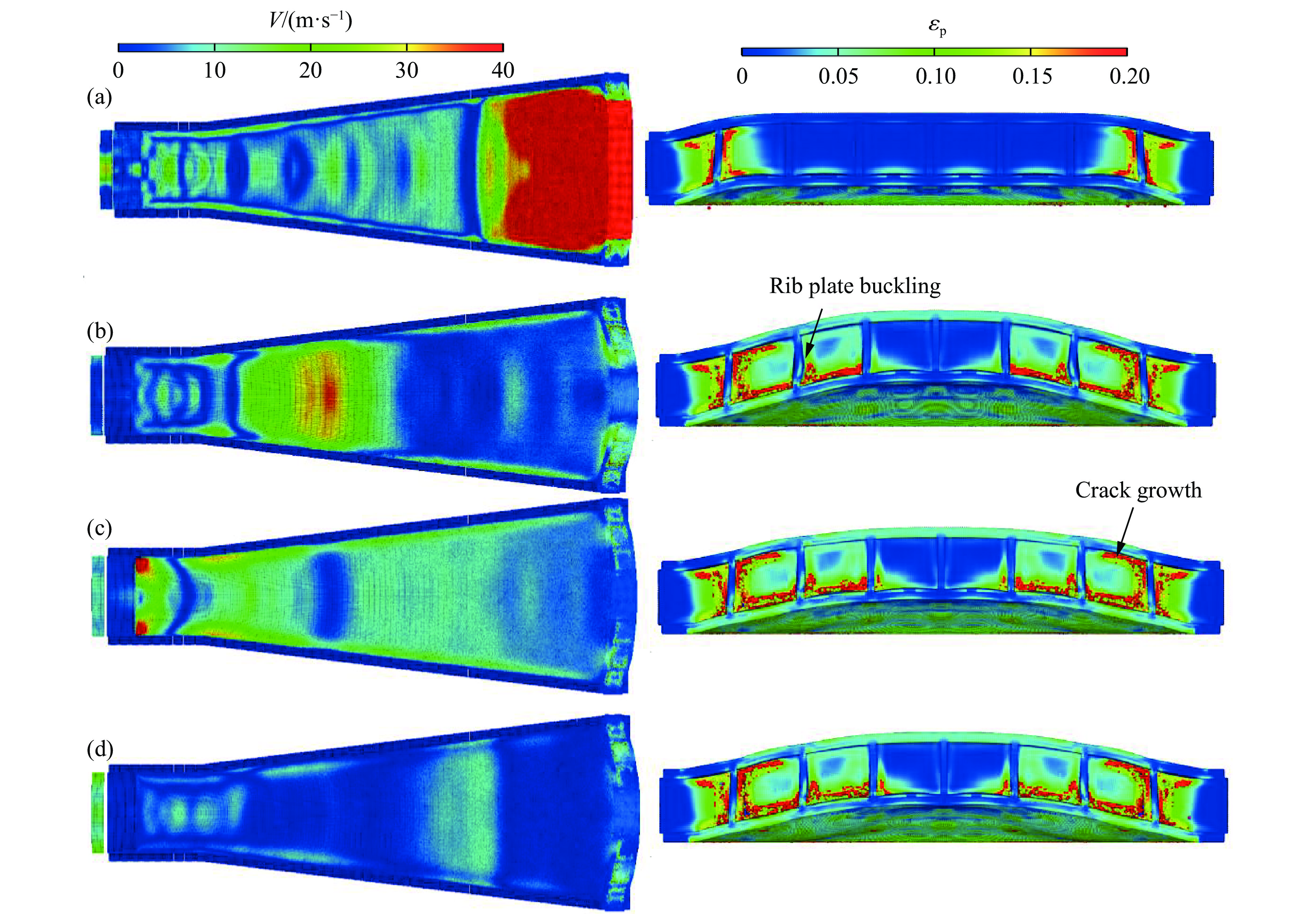 为探究水下接触和近场爆炸下沉箱码头的毁伤机理和荷载特性,基于沉箱码头缩尺模型试验,采用有限元数值模拟开展对比研究,分析了沉箱码头内冲击波荷载的传播、衰减规律以及沉箱码头的破坏过程和毁伤机理。研究结果表明:水下接触和近场爆炸下,沉箱码头的毁伤区域和破坏特征基本一致,码头迎爆外墙和面板为主要破坏区域,迎爆外墙呈爆坑、破口的破坏现象,面板呈现管沟连接处横向通长裂缝、纵向裂缝并掀飞的破坏现象,沉箱码头侧墙和仓格内纵横隔墙毁伤相对轻微。水下接触和近场爆炸下,沉箱码头内冲击波在仓格的隔墙和填砂界面发生反射和透射现象,码头迎爆外墙、侧墙、板均受到冲击载荷,冲击波荷载在沉箱内的衰减速度由陡至缓,沉箱码头的毁伤特征在水下爆炸冲击波阶段基本形成,毁伤形成时间略大于2倍的冲击波在沉箱码头内的传播时长。