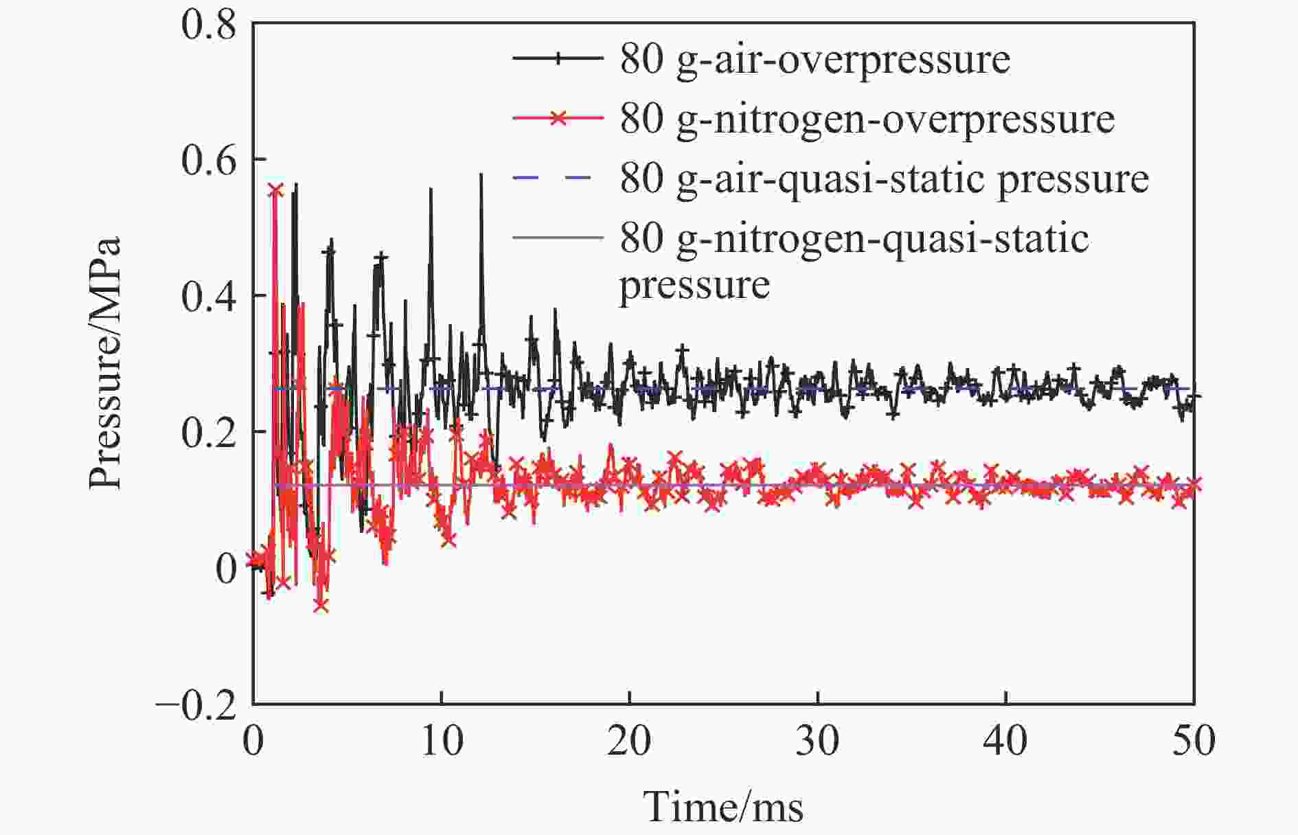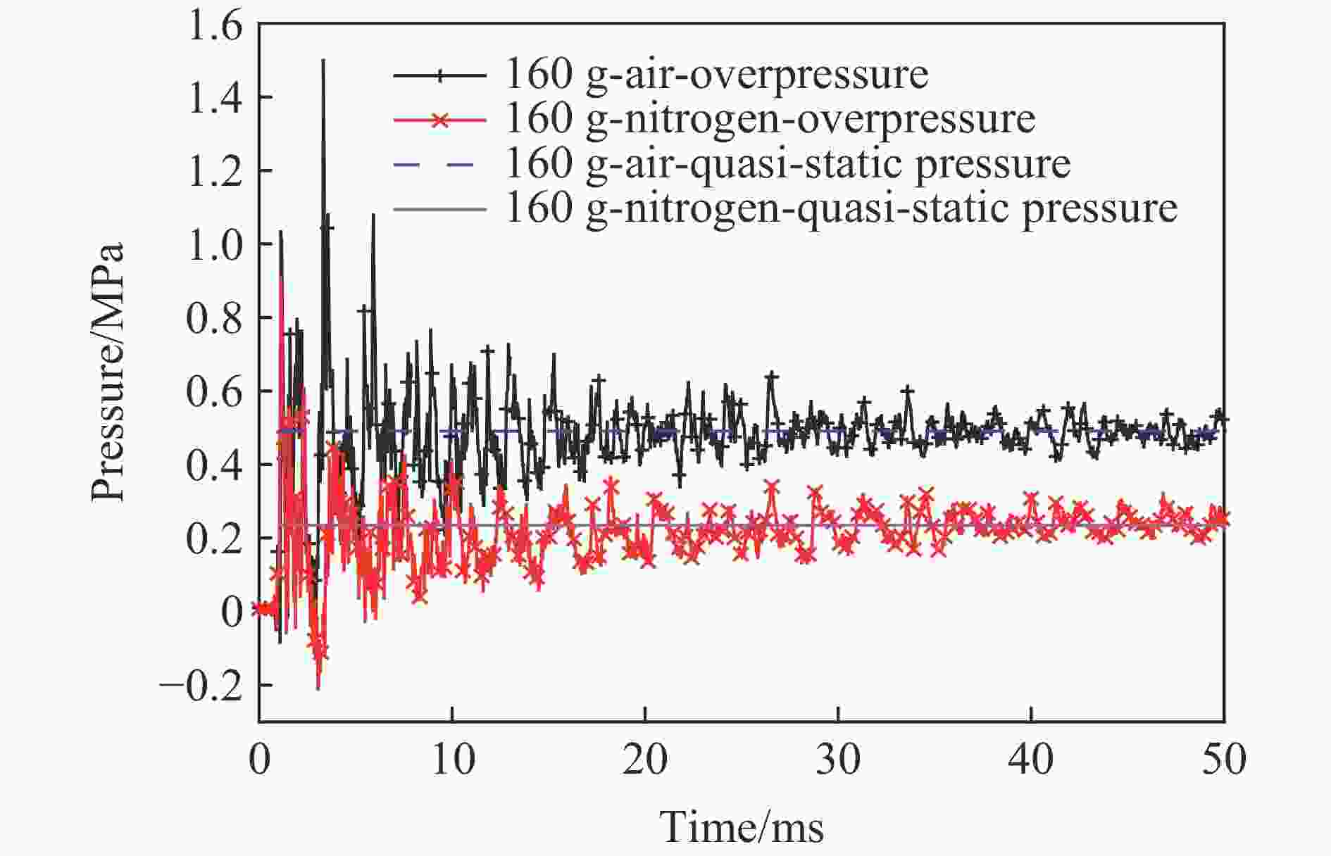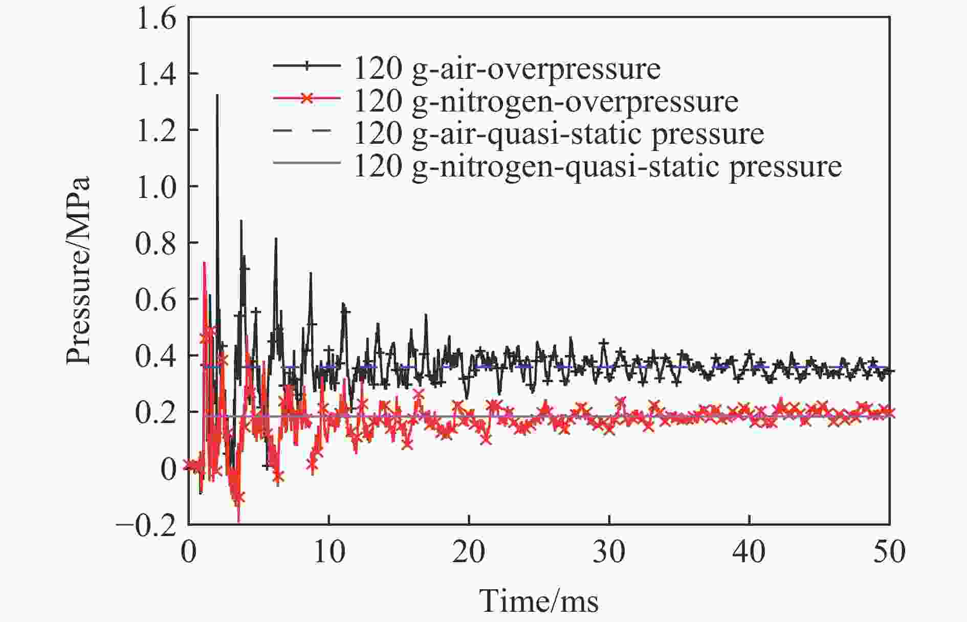 TNT质量/g 舱内环境 首冲击波峰值/kPa 准静态压力峰值/kPa 准静态压力降低率/% 等效能量/(kJ·kg−1) 80 空气 546.7 262.8 53.8 9461.0 氮气 554.7 121.5 4375.6 120 空气 722.6 358.3 48.9 8600.1 氮气 728.6 183.0 4392.2 160 空气 1033.1 490.6 52.3 8831.3 氮气 908.8 234.2 4215.8 表 7 氮气工况下箱内气体属性