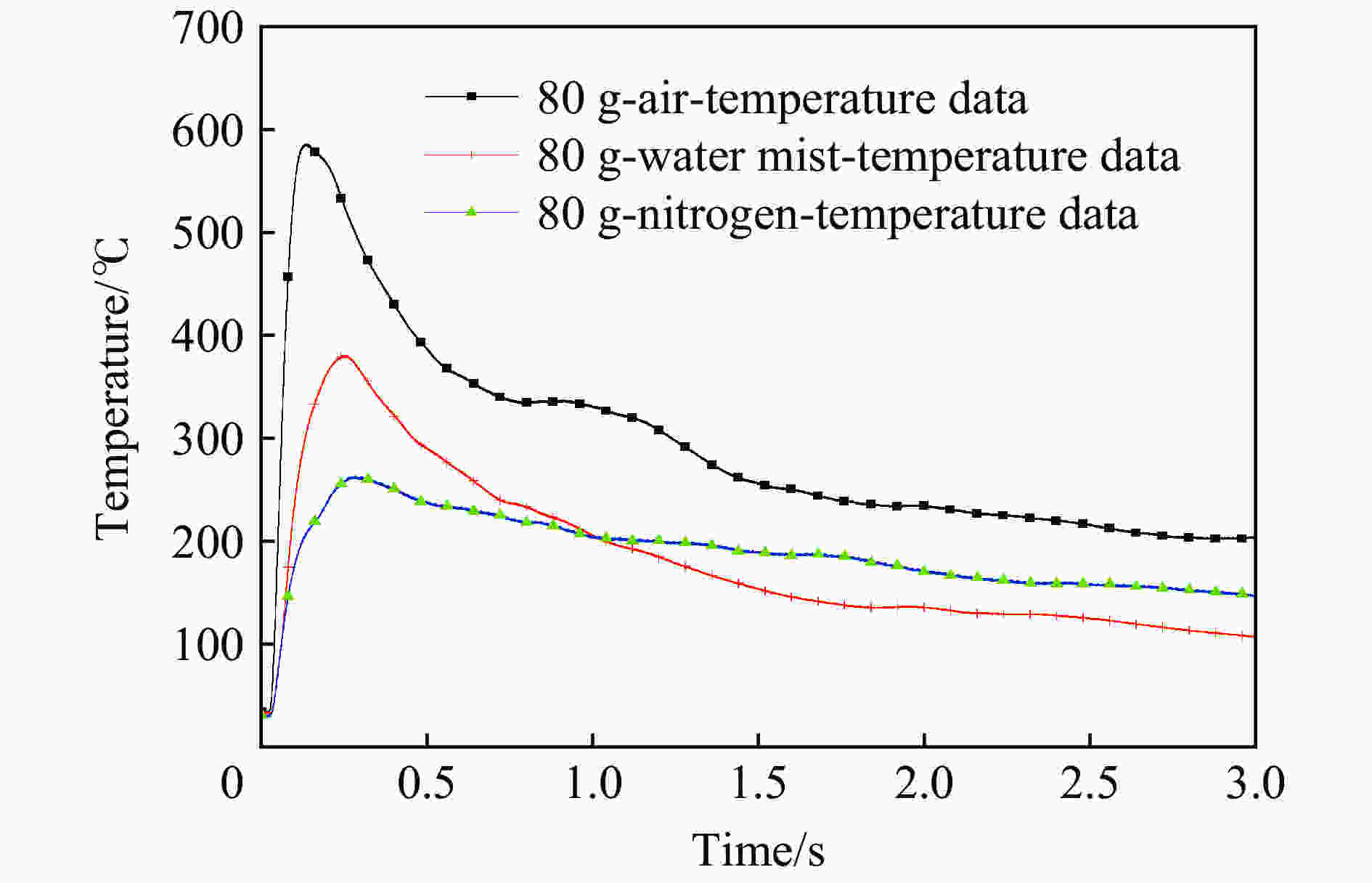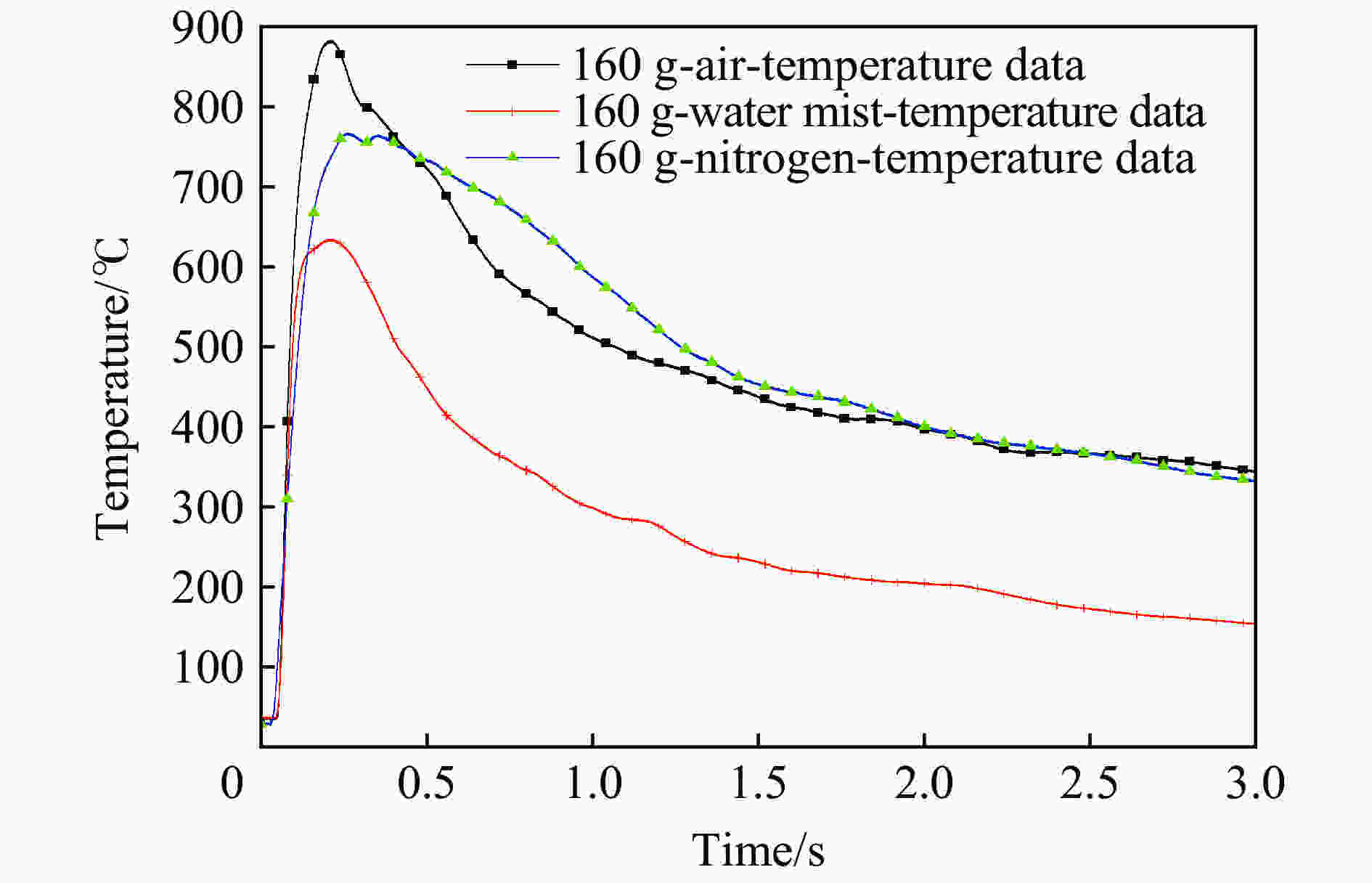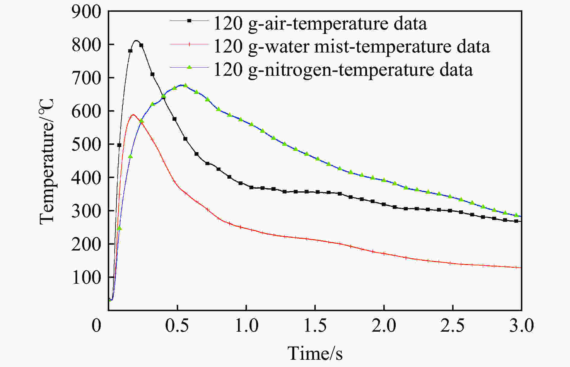 TNT质量/g T1、T3、T5点温度平均值降低比例/% T2、T4点温度平均值降低比例/% 整体温度峰值平均值降低比例/% 80 29.5 52.1 40.8 120 31.0 48.0 39.5 160 38.5 56.5 47.5 表 11 氮气和空气环境工况下不同测点位置的温度峰值平均值
