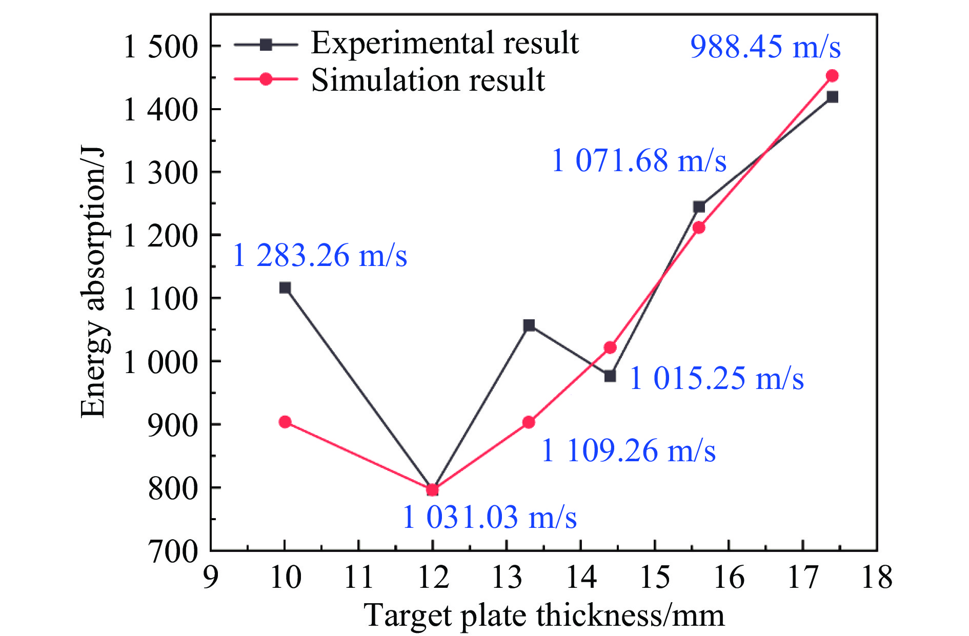 Ultra-high molecular weight polyethylene (UHMWPE) fibers are widely used in explosive fragment protection due to their high modulus, high strength, and low density. To study the effect of UHMWPE backplate thickness on the penetration resistance effect of aluminum composite panel, the digital image correlation method (DIC) and computed tomography (CT) were used to obtain the dynamic response and local failure of UHMWPE. A finite element model of a tungsten ball penetrating an Al/PE composite plate with different speeds (500, 1000, and 1500 m/s) was established, and the simulated results were found to be in good agreement with the experimental results. The influence of PE backplate thickness on the energy absorption performance and strain of the composite target plate was mainly studied, and the thickness of the backplate was 1.6-20 mm. The results demonstrate that the aluminum plate undergoes adiabatic shear failure under the impact, and the fiber layers are laid orthogonally to produce fiber bulges and bifurcated strain bands under tension. The fiber bulge and cross-shaped strain band bifurcation phenomenon occur when the fragments penetrate the orthogonally laid fibers. With the increase of the PE plate thickness, the main failure of the fiber layers changes from shear failure to tensile failure, and the strain band of the fiber layers changes from cross shape to X shape. Increasing the thickness of the PE plate hinders the movement of the plug body of the aluminum block, thereby increasing the time and kinetic energy consumption of the fragment penetrating the aluminum plate. When the impact velocity is 500, 1000 and 1500 m/s, the optimal areal density absorption energy thickness respectively is 6.4, 12, and 16 mm, and the surface density energy absorption respectively is 14.55, 49.51 and 98.07 J·(kg·m2). The influence of PE composite plate thickness on energy absorption performance first rises rapidly to the threshold and then slowly decreases, this result shows that increasing the PE plate thickness is limited in improving its energy absorption performance after reaching a certain thickness.