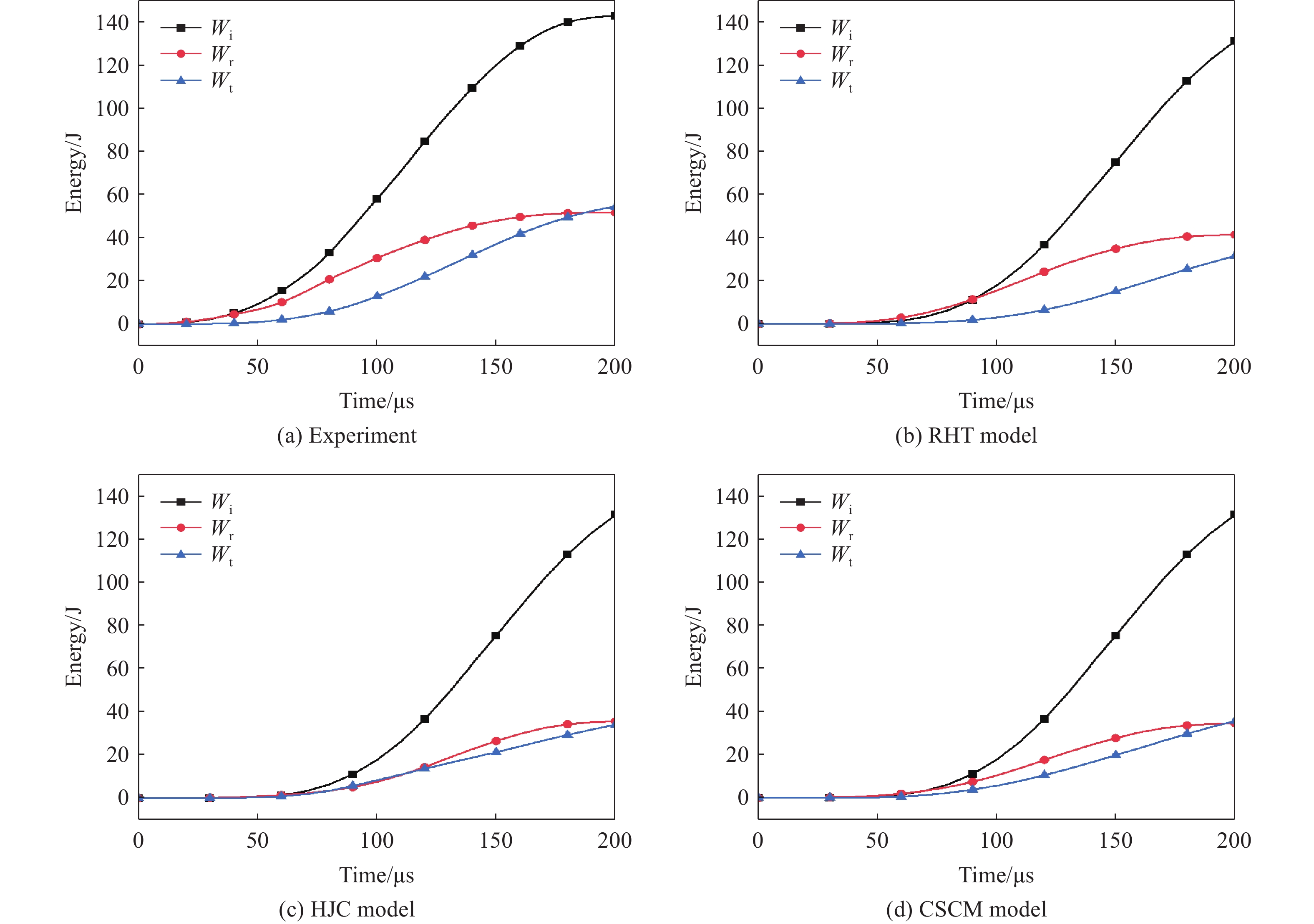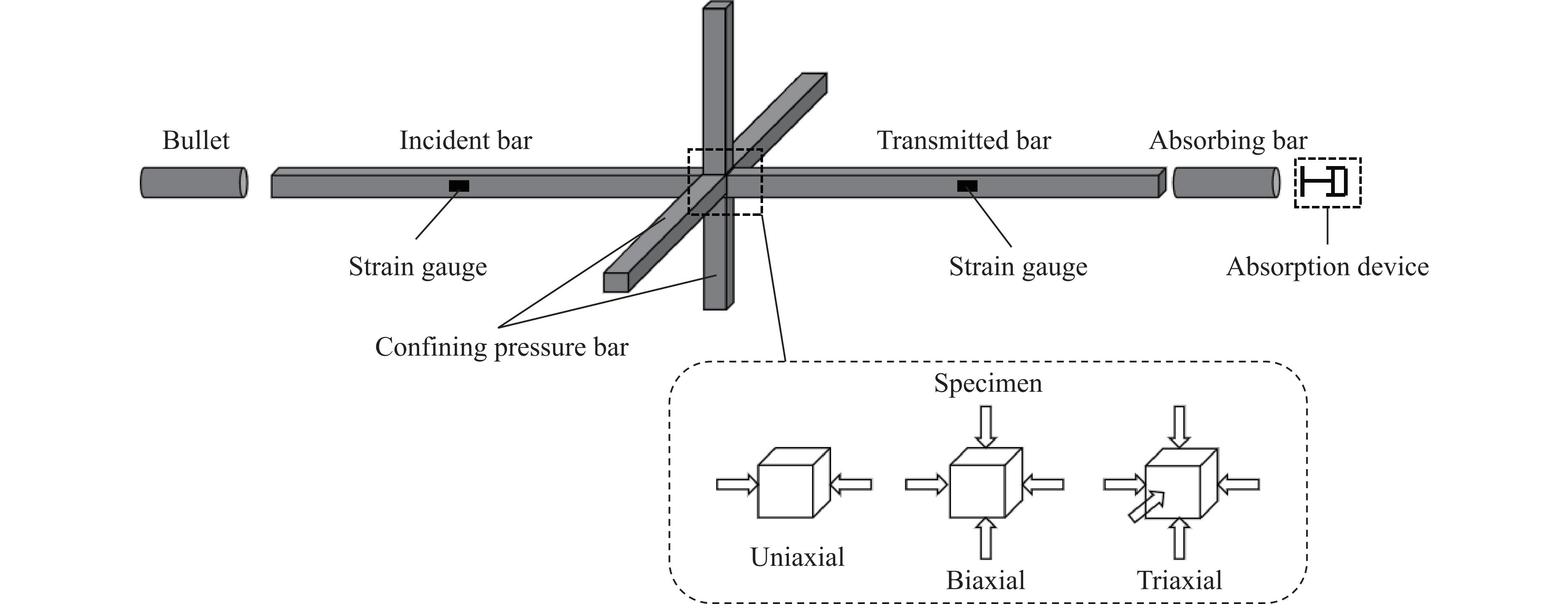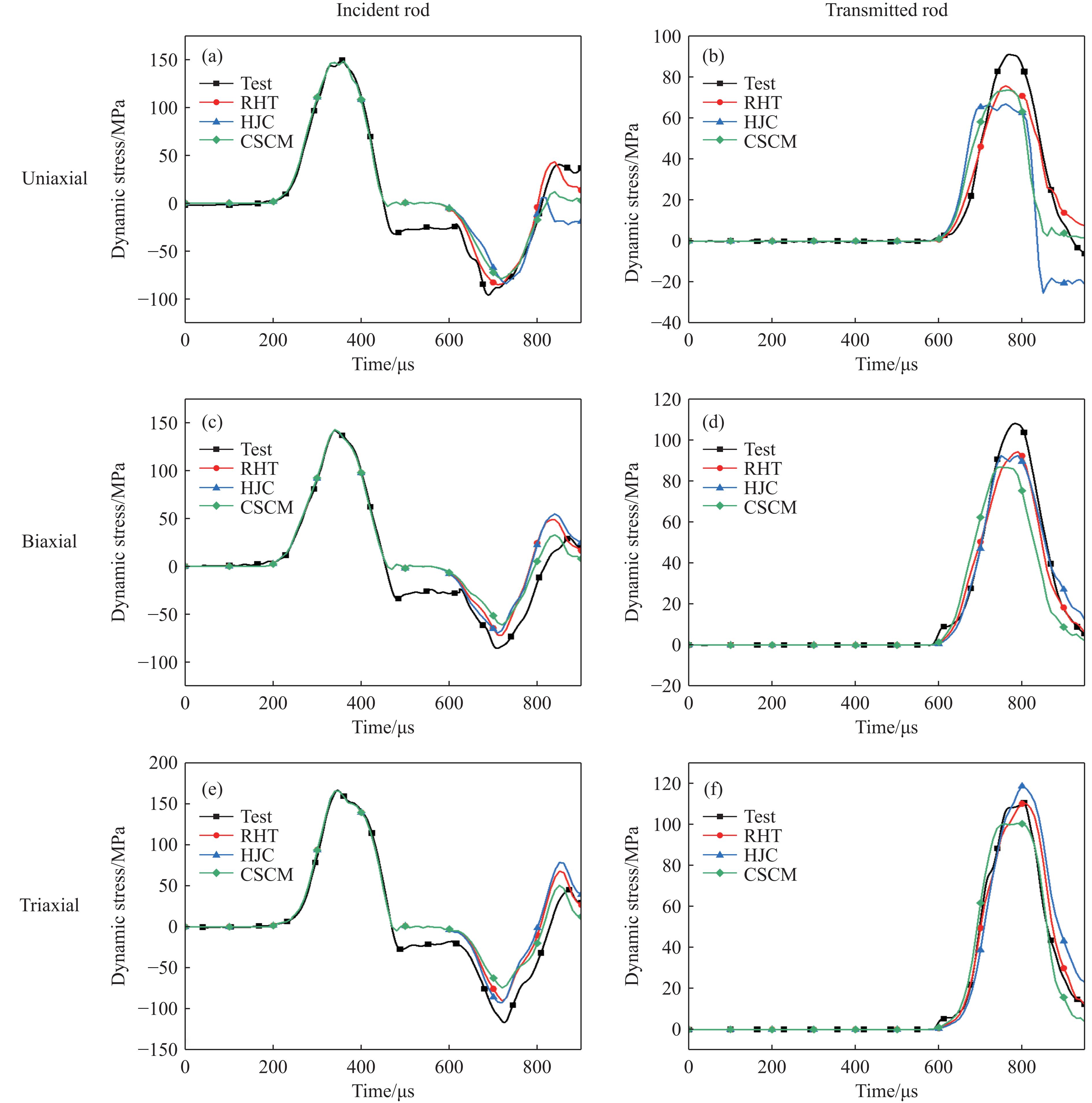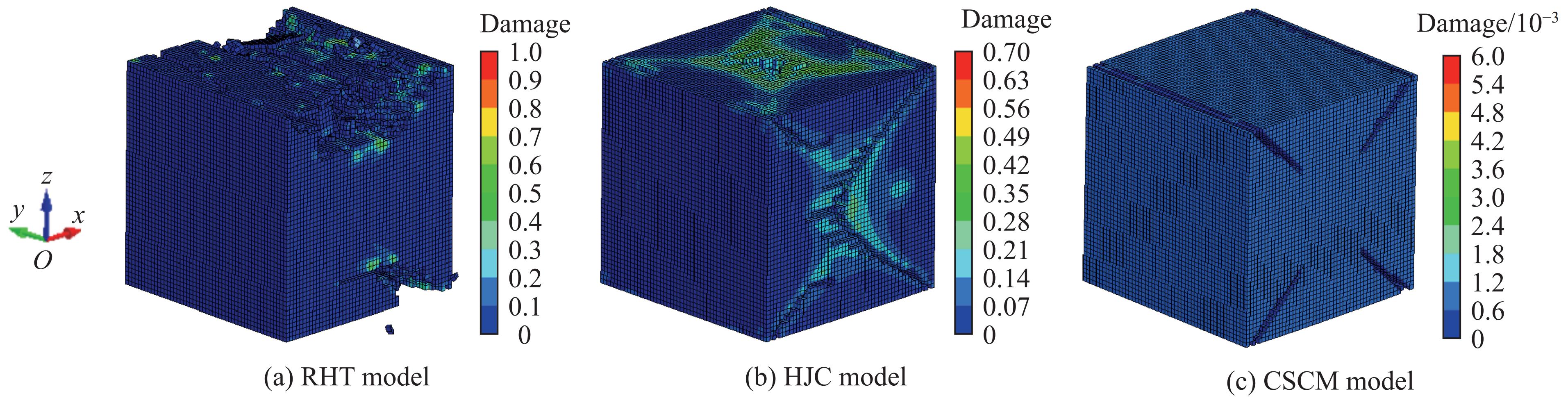The dynamic mechanical properties of deep rocks are critical to understanding geological processes and optimizing resource extraction. Accurately understanding the dynamic mechanical properties of deep rocks not only provides insights into the geological processes and evolution of the earth’s interior, but also offers a theoretical basis for the effective extraction of deep minerals and energy. In this study, the dynamic mechanical behavior of white sandstone from a coal mine was experimentally and numerically analyzed under uniaxial, biaxial, and triaxial stress conditions. Numerical simulations based on three constitutive models consisting of the Riedel-Hiermaier-Thoma (RHT) model, the Holmquist-Johnson-Cook (HJC) model, and the continuous surface cap model (CSCM), were validated by using experimental results from three-dimensional Hopkinson bar experiments. The results indicate that the shear failure damage of white sandstone specimens decreases with the increasing prestress, with triaxial stress conditions yielding significantly lower damage than uniaxial or biaxial conditions. Among the three models, the RHT constitutive model demonstrates the closest agreement with the experimental results in terms of stress waveforms, peak stress, peak strain, and damage degree. Compared with the experimental data, the RHT model exhibits a stress peak deviation ratio of 3.5% and 13.6% for the reflected wave under uniaxial and biaxial conditions, respectively, while the stress peak deviation ratio for the transmitted wave is the lowest. Additionally, the peak stress and strain values predicted by the RHT model are numerically closer to the experimental results. The damage state predicted by the RHT model also aligns well with the experimental observations: under uniaxial loading, the damage exhibits a U-shaped pattern, whereas the HJC model showed a larger V-shaped damage pattern and fracture, and the CSCM model displayed surface damage with a smaller affected area. In terms of energy absorption and dissipation, the simulation results based on the three constitutive models shows minimal differences. The incident, reflected, and transmitted energy values are nearly identical across all three models. In addition, the damage degree of the white sandstone specimens increases with the impact velocity. The damage simulation results of the three constitutive models also show an increasing trend with the impact velocity, while retaining the damage characteristics.