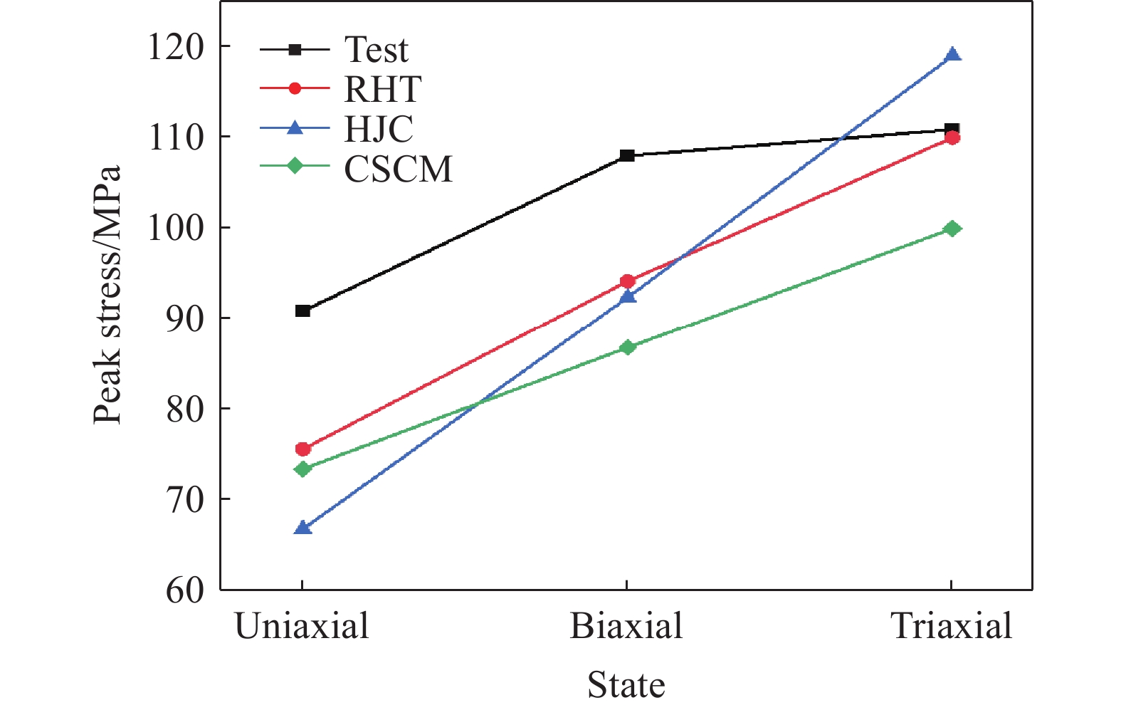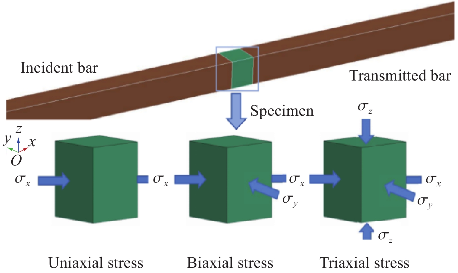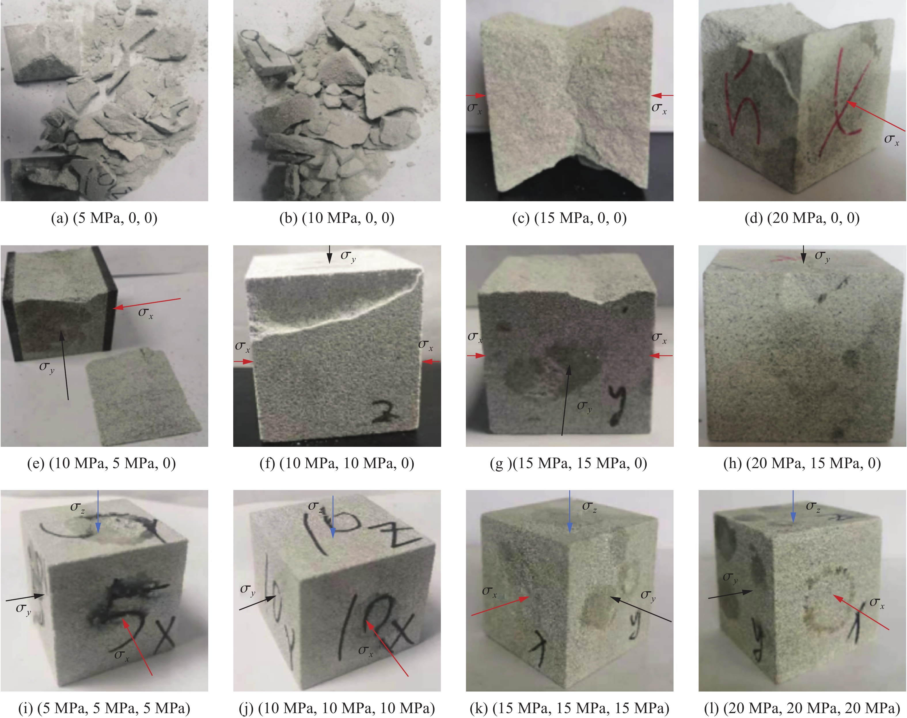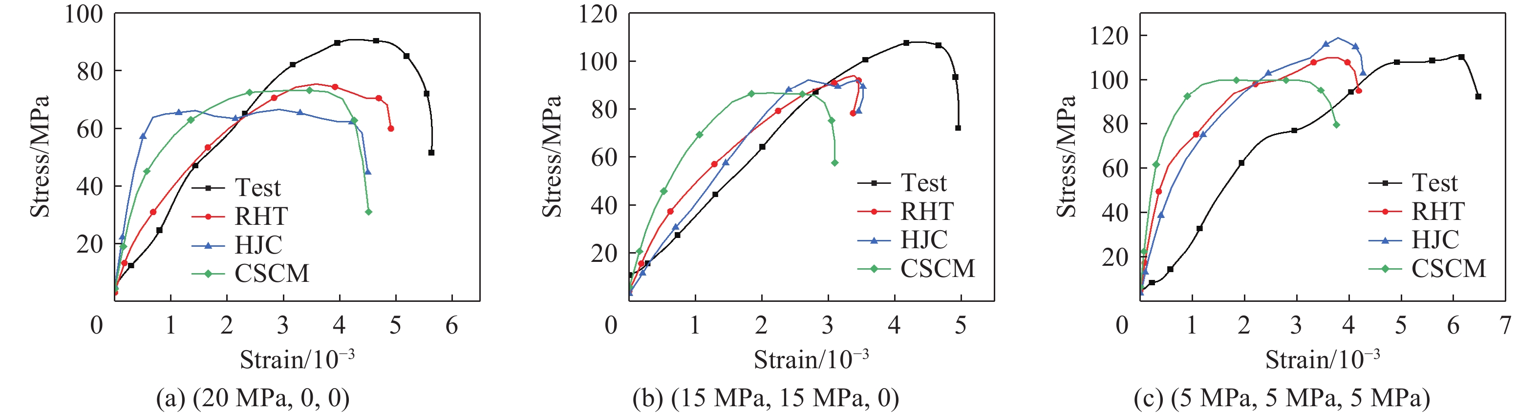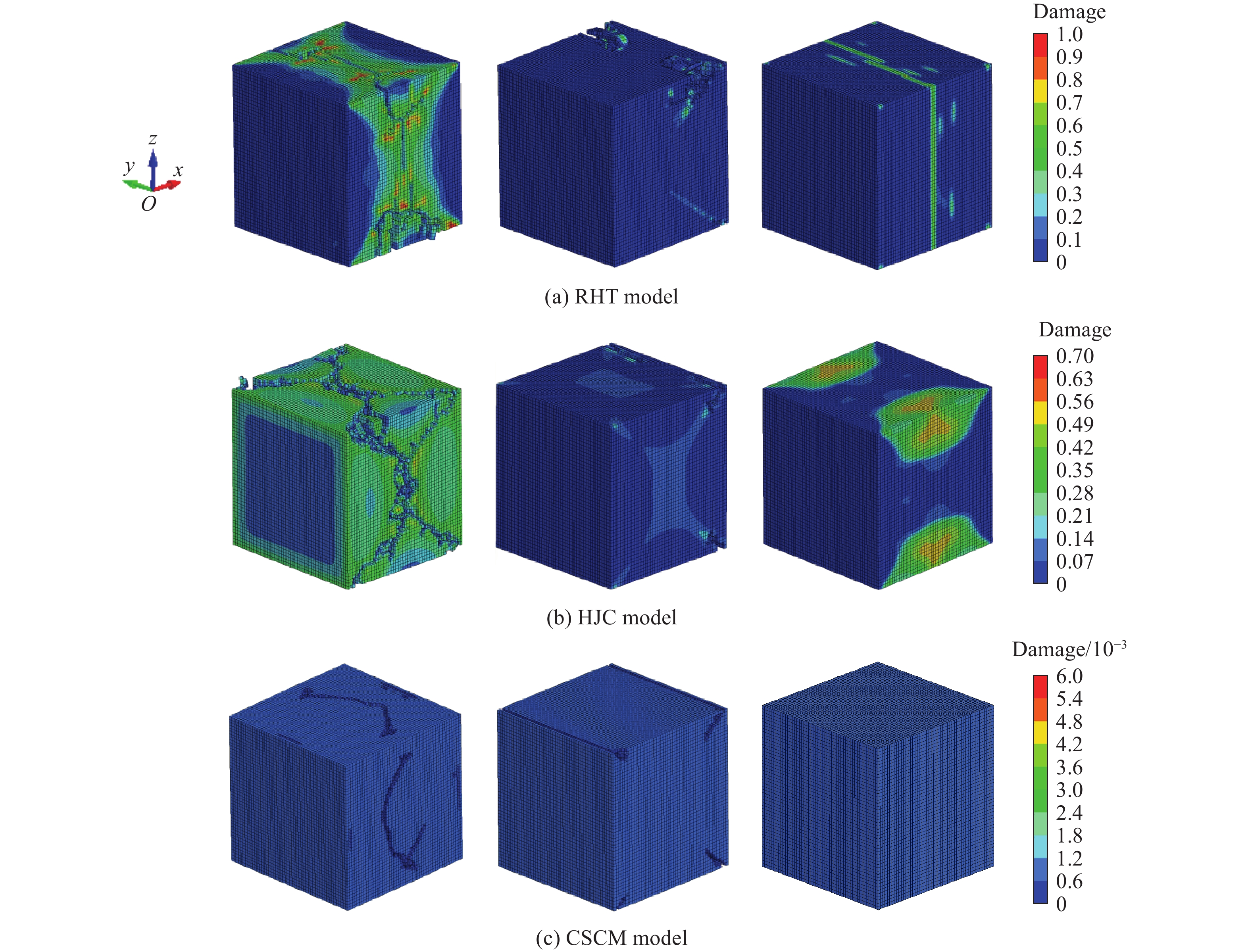 The dynamic mechanical properties of deep rocks are critical to understanding geological processes and optimizing resource extraction. Accurately understanding the dynamic mechanical properties of deep rocks not only provides insights into the geological processes and evolution of the earth’s interior, but also offers a theoretical basis for the effective extraction of deep minerals and energy. In this study, the dynamic mechanical behavior of white sandstone from a coal mine was experimentally and numerically analyzed under uniaxial, biaxial, and triaxial stress conditions. Numerical simulations based on three constitutive models consisting of the Riedel-Hiermaier-Thoma (RHT) model, the Holmquist-Johnson-Cook (HJC) model, and the continuous surface cap model (CSCM), were validated by using experimental results from three-dimensional Hopkinson bar experiments. The results indicate that the shear failure damage of white sandstone specimens decreases with the increasing prestress, with triaxial stress conditions yielding significantly lower damage than uniaxial or biaxial conditions. Among the three models, the RHT constitutive model demonstrates the closest agreement with the experimental results in terms of stress waveforms, peak stress, peak strain, and damage degree. Compared with the experimental data, the RHT model exhibits a stress peak deviation ratio of 3.5% and 13.6% for the reflected wave under uniaxial and biaxial conditions, respectively, while the stress peak deviation ratio for the transmitted wave is the lowest. Additionally, the peak stress and strain values predicted by the RHT model are numerically closer to the experimental results. The damage state predicted by the RHT model also aligns well with the experimental observations: under uniaxial loading, the damage exhibits a U-shaped pattern, whereas the HJC model showed a larger V-shaped damage pattern and fracture, and the CSCM model displayed surface damage with a smaller affected area. In terms of energy absorption and dissipation, the simulation results based on the three constitutive models shows minimal differences. The incident, reflected, and transmitted energy values are nearly identical across all three models. In addition, the damage degree of the white sandstone specimens increases with the impact velocity. The damage simulation results of the three constitutive models also show an increasing trend with the impact velocity, while retaining the damage characteristics.