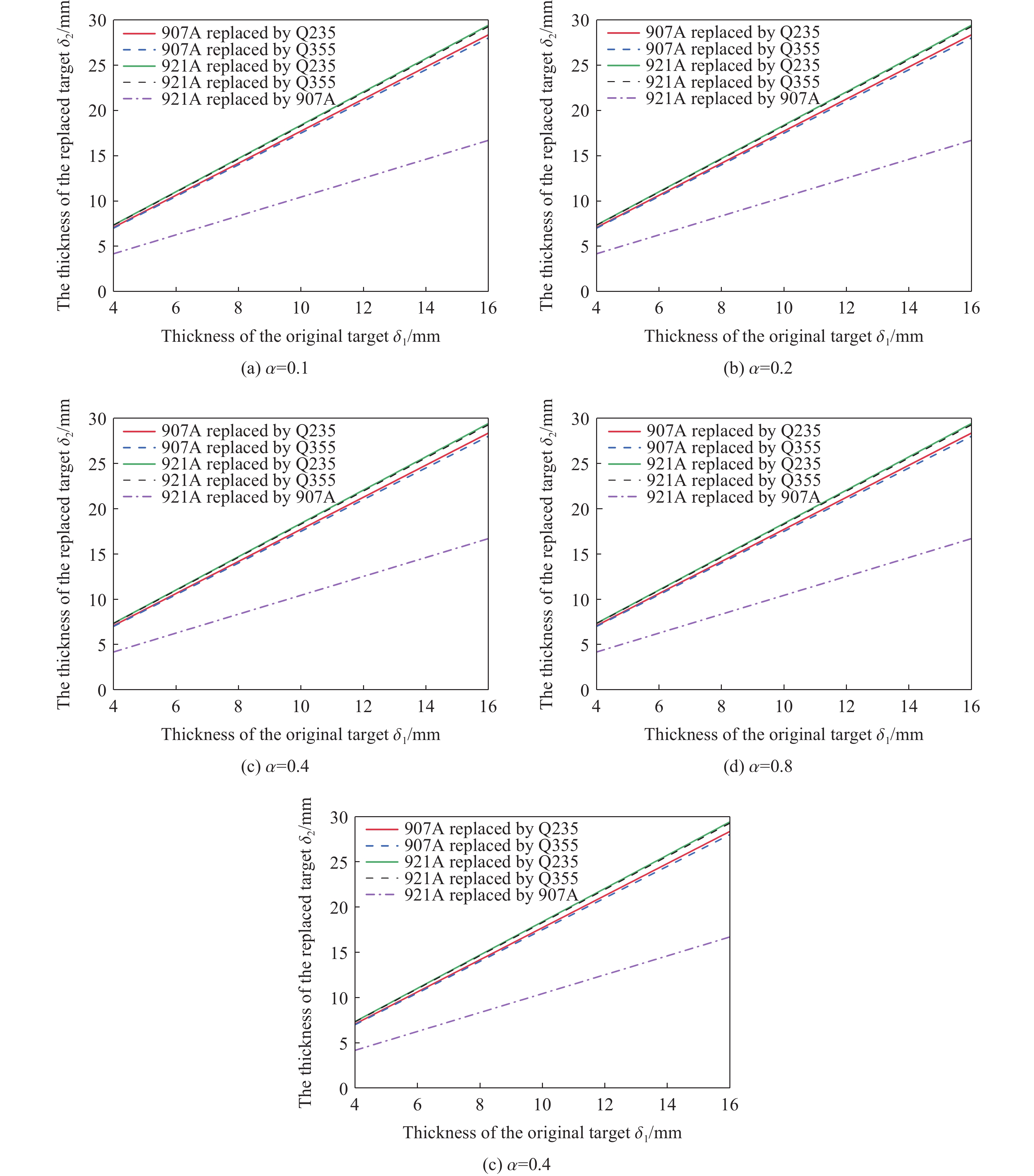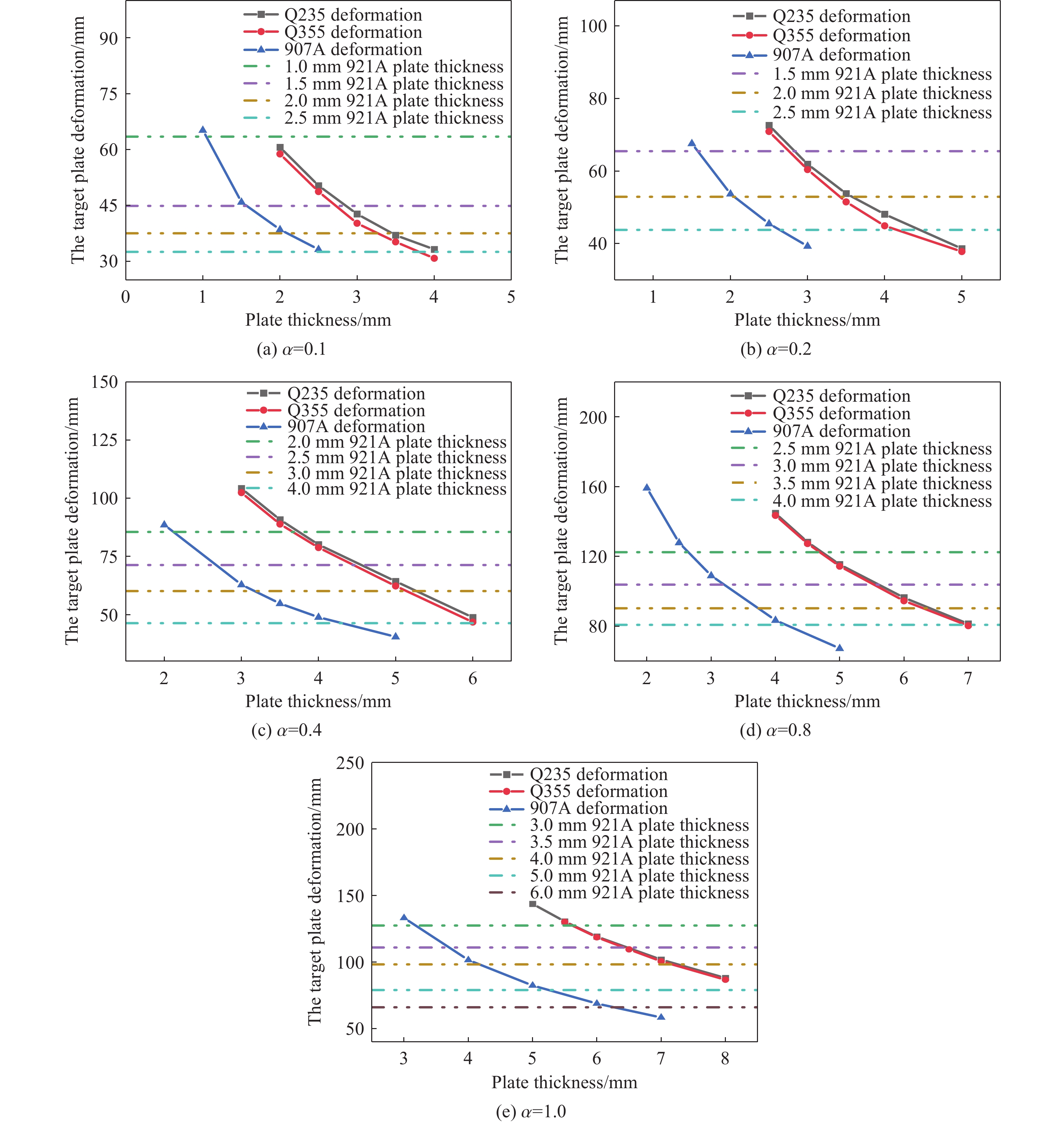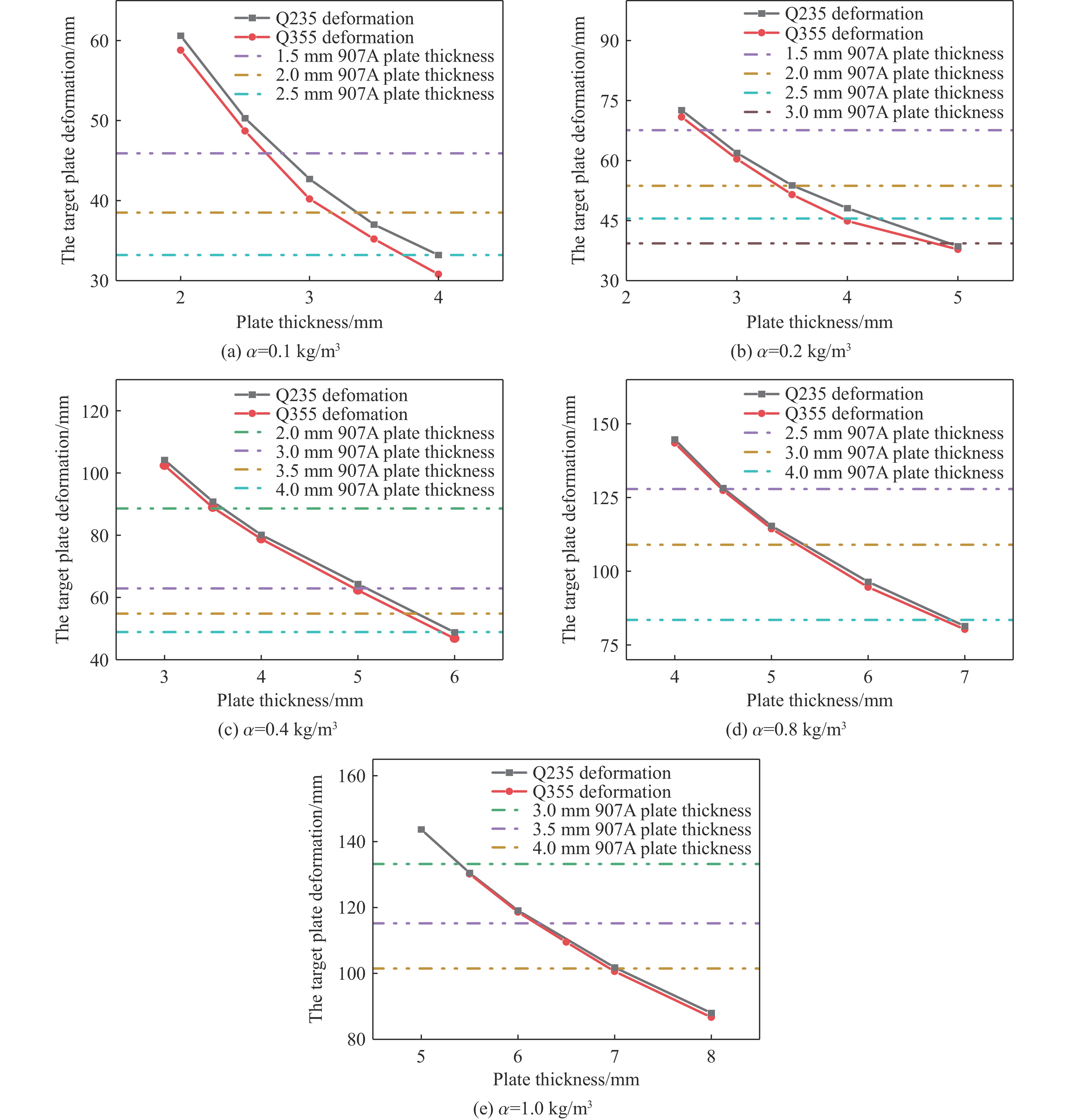 Experimental investigation of internal explosion effects on ship structures still faces fundamental challenges. The prohibitively high costs of specialized naval steel plates impose disproportionate financial burdens on experimental budgets. Additionally, the restricted availability of standardized thickness variants has dimensional scaling conflicts during reduced-scale internal explosion experiments. This research proposes an equivalent substitution method for scaled model testing. The methodology enables a strategic replacement of naval steel with conventional steel while maintaining response similitude during the internal explosion of ship structures. The primary research objective focuses on validating the equivalent substitution method for conventional steel as a replacement for specialized naval steel without degrading the accuracy of the recorded data. According to the principle of central deformation similarity, the equivalence relationship among target plates of different grades was established under the assumption of structural integrity during the explosion. Based on the theory of large deflection of thin plates, the relationship between plate thickness and deformation was clarified thoroughly. An equivalence substitution method for different plate grades was explained, and an equivalence substitution method for different plates was proposed. It provides a theoretical foundation for substituting specialized naval steel with conventional steel. Comprehensive numerical simulations were conducted using the finite element analysis software AUTODYN to validate the proposed method. The simulations modeled the dynamic response of four different grades of steel target plates (921A steel, 907A steel, Q235 steel, and Q355 steel) under internal blast loading. The maximum deviation between the simulation results and experimental data is only 5.6%, thereby fully confirming the accuracy and reliability of the numerical model. The equivalence relationships among grades under internal blast loading with different charge volume ratios (0.1, 0.2, 0.4, 0.8, and 1.0) were further explored through extensive numerical simulations involving four plates grades (Q235, Q355, 907A, and 921A) with various thicknesses. A fitting analysis of equivalent plate thickness was conducted. By integrating empirical formulas correlating equivalent plate thickness with dynamic yield strength, the substituted target plate showed less than 10% deviation in central deformation compared to the original plate. The proposed equivalence method for steel target plates of different grades under internal explosion loads has been demonstrated to be both rational and practically applicable. This provides a theoretical foundation and empirical reference for substituting specialized naval steel with ordinary steel in internal explosion experiments.