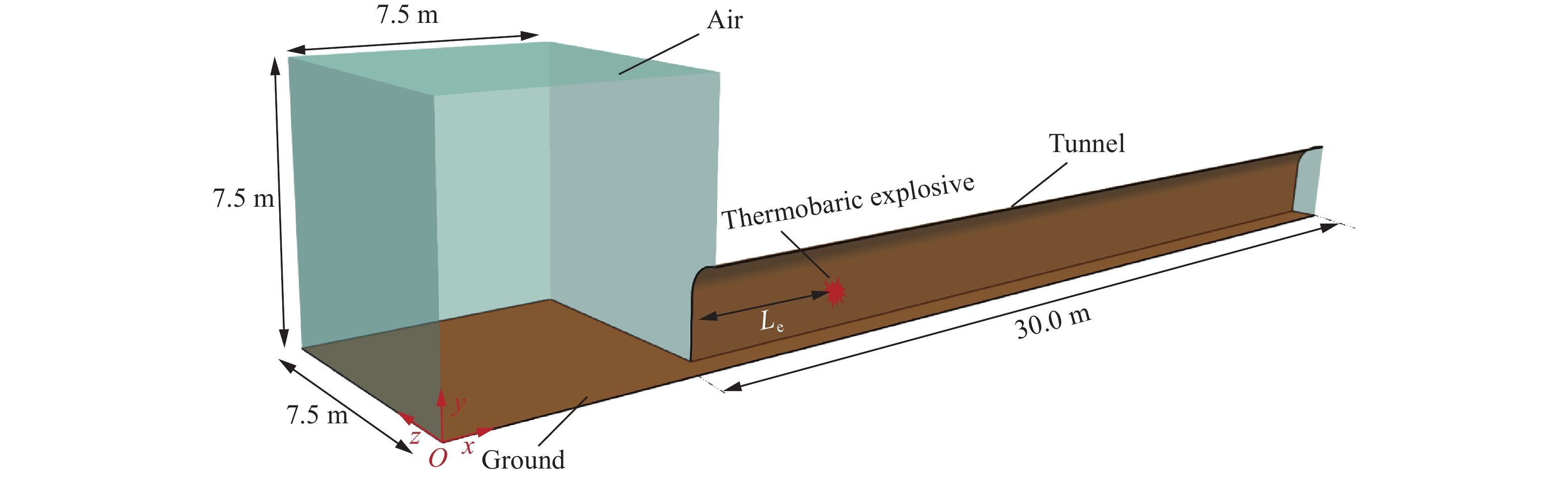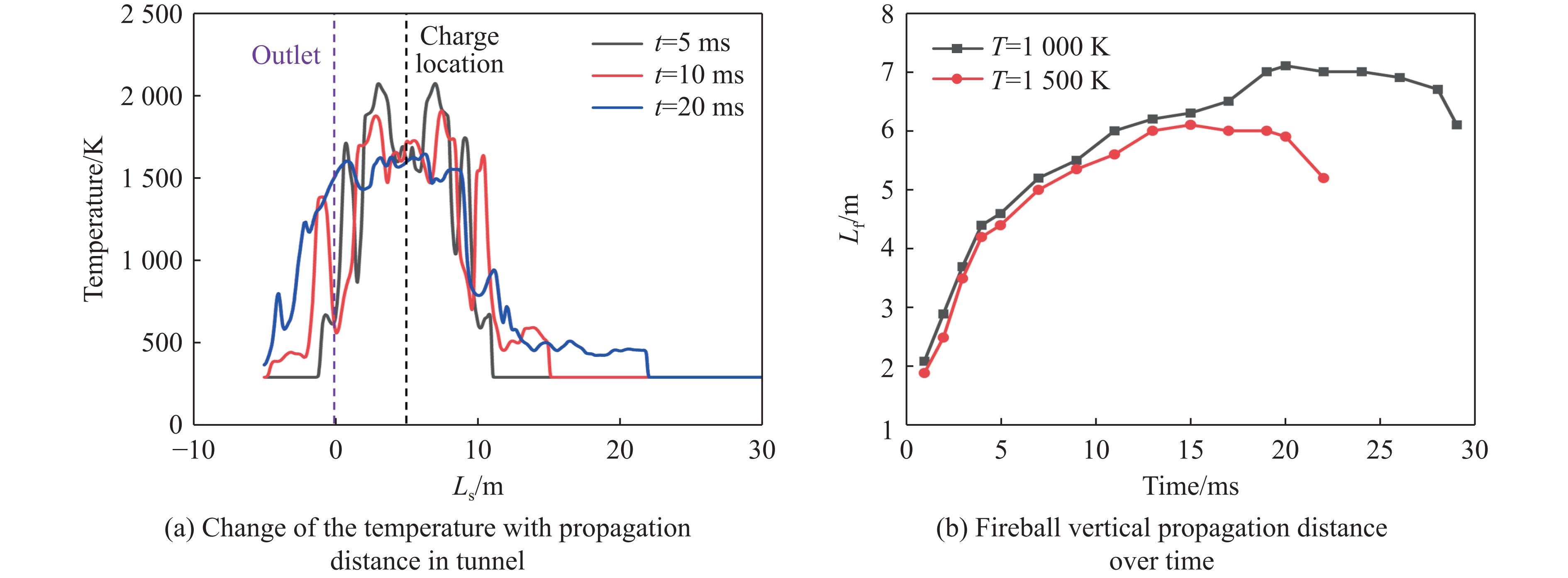 To investigate the propagation characteristics of blast shock waves and the thermal effects of fireballs in tunnel explosions involving thermobaric explosives, numerical simulations were conducted using OpenFOAM. The simulation accuracy was validated through comparative analysis with experimental data from tunnel explosion tests. The effects of axial distance along the tunnel and explosive mass on shock wave propagation characteristics and fireball thermal effects were systematically studied. The results demonstrate that under identical charge mass conditions when the axial distance exceeds 1/3 of the equivalent tunnel diameter, the attenuation of shock wave overpressure peak and planar wave formation distance remain independent of axial position. After planar wave formation, the impulse increases with axial distance before stabilizing. At the same axial explosion distances, the planar wave formation distance increases with explosive mass. Post planar wave formation, the attenuation pattern of the shock wave overpressure peak remains unaffected by charge mass. In contrast, the impulse exhibits a growth trend proportional to the increase in charge mass. Under the influence of the tunnel portal energy dissipation effect (tunnel effect), explosion-induced fireballs exhibit a consistent propagation tendency toward the proximal tunnel portal. The confinement imposed by tunnel walls restricts the lateral expansion of the fireball perpendicular to the tunnel axis while facilitating the formation of a high-temperature tip along the longitudinal axis. Especially, the temperature distribution along the tunnel axis maintains axial symmetry despite directional propagation biases. A fitting formula was established to characterize the relationship between the maximum axial propagation distance of explosion fireballs at different temperatures and the explosive mass, enabling the prediction of axial spread limits for fireballs at specific temperatures in typical thermobaric explosive detonations within tunnel-confined environments.