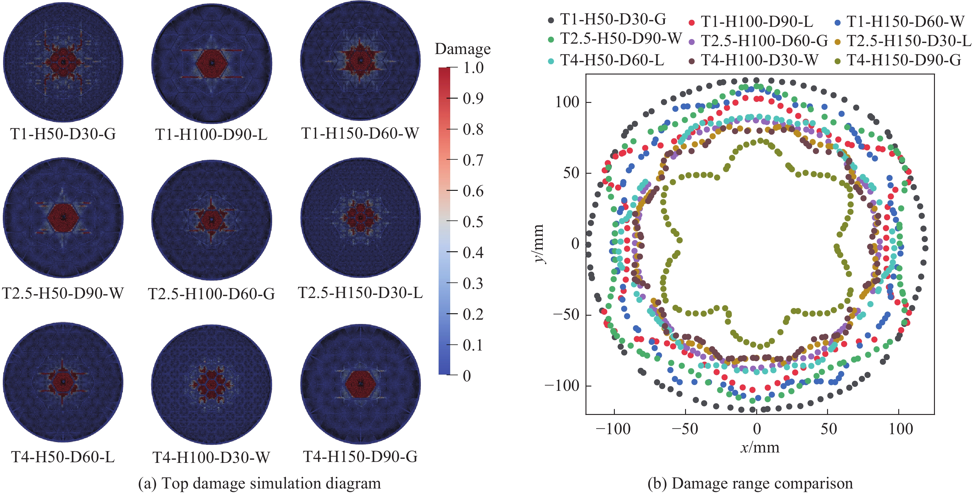To investigate the penetration resistance of metal honeycomb tube-confined concrete structures under hypervelocity impact, penetration experiments were conducted using a two-stage light gas gun with projectile velocities near1500 m/s. The material point method (MPM) was employed to simulate the penetration process and validate the parameters of target and projectile. This method was further used to analyze the effects of honeycomb tube parameters, including wall thickness, height, diameter, and material, on the penetration resistance of the target structure. Numerical simulations showed that MPM can accurately simulate high-velocity penetration processes, with simulation results deviating from experimental data by less than 10%. Through orthogonal analysis, the factors influencing penetration depth were ranked in descending order as follows: characteristic tube depth, characteristic inner diameter, characteristic wall thickness, and material. For the cratering effect, the primary influencing factors were identified as characteristic wall thickness, characteristic tube depth, material, and characteristic inner diameter. For the projectiles tested in this study, optimization results indicated that a combination of 4 mm wall thickness, 150 mm height, 30 mm incircle diameter, and tungsten alloy demonstrated the best penetration resistance, reducing penetration depth by 25.1% compared to plain concrete. A combination of 4 mm wall thickness, 150 mm height, 90 mm incircle diameter, and aluminum exhibited superior resistance to the cratering effect, decreasing crater radius by 28.7% compared to plain concrete. Multi-objective optimization analysis determined the optimal overall configuration to be: 4 mm wall thickness, 150 mm height, 30 mm mm incircle diameter, and aluminum.