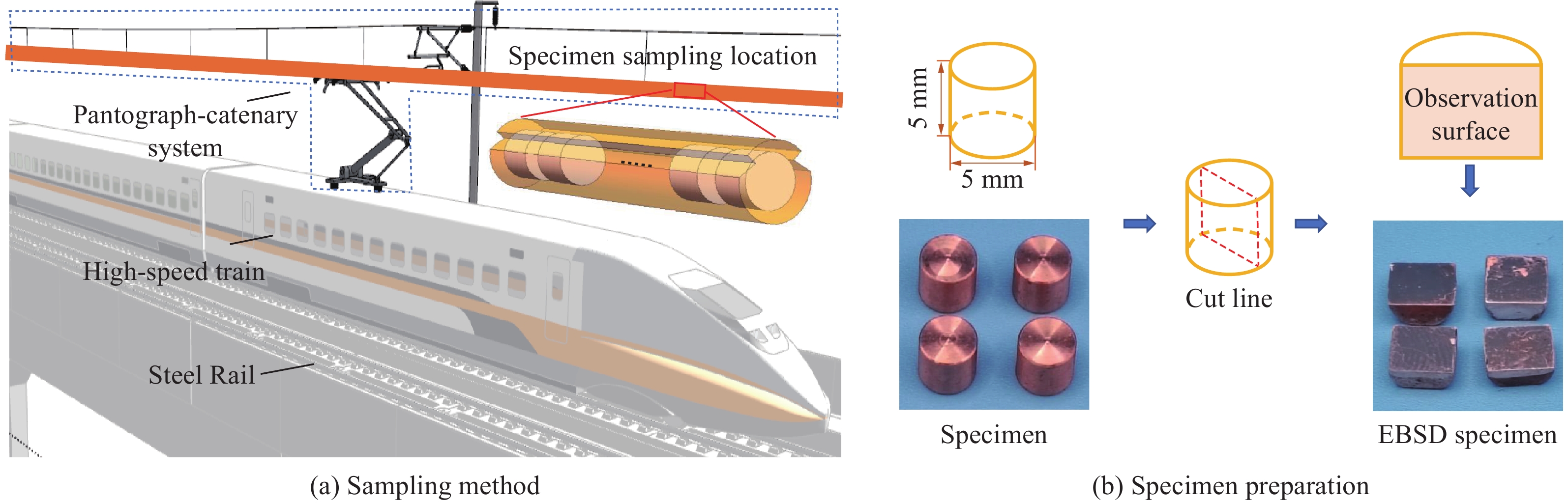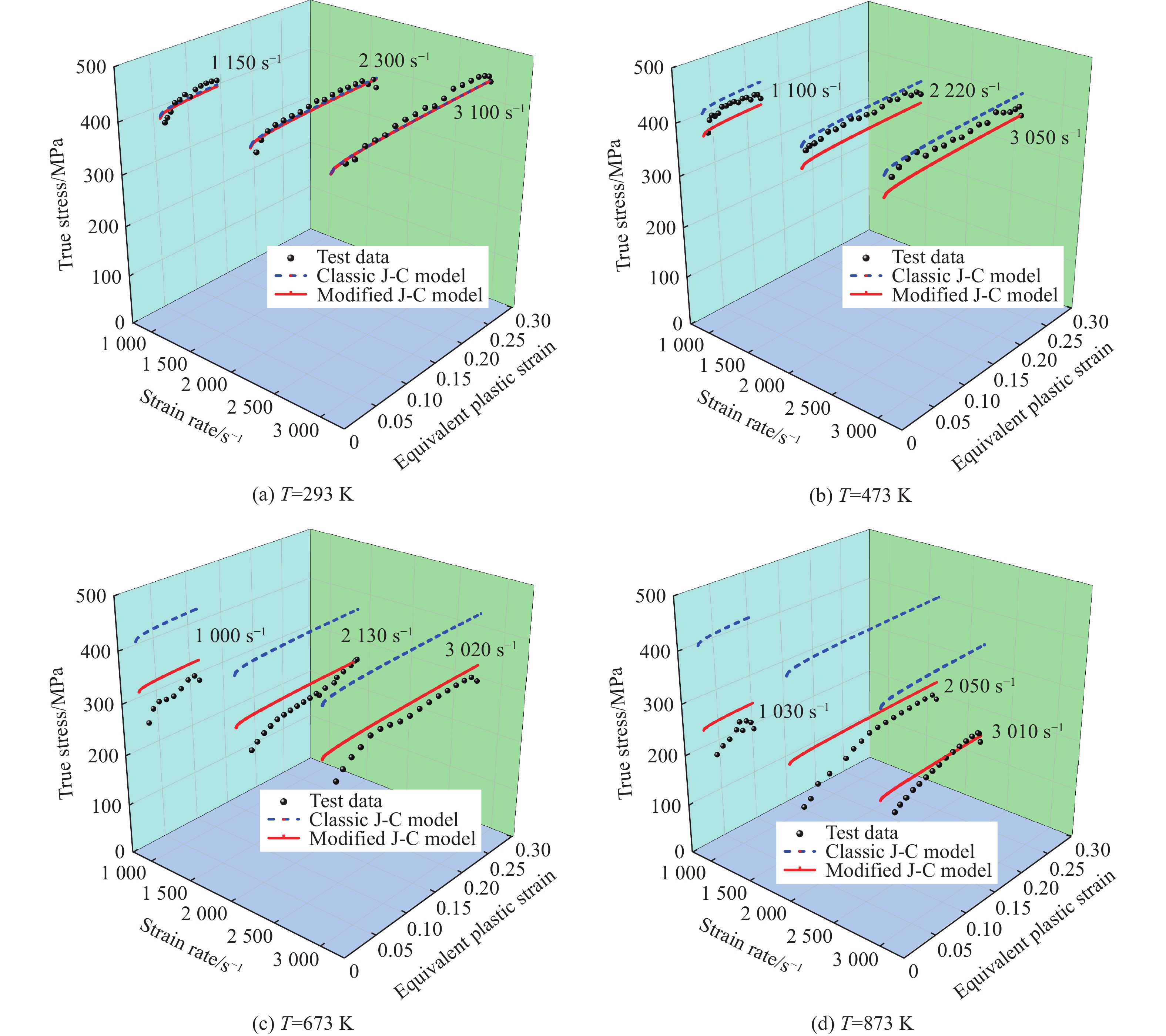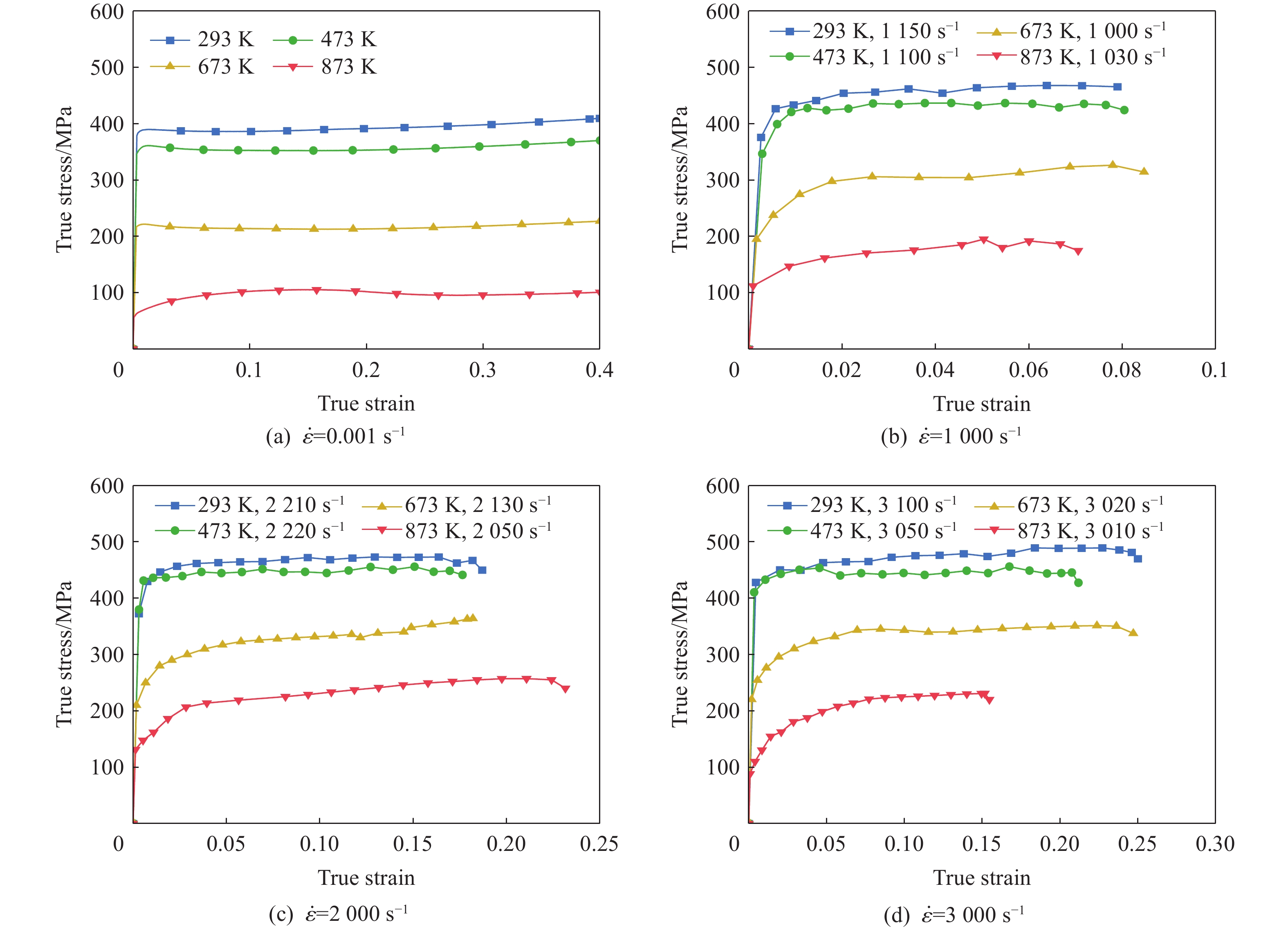 With the increasing speed of trains, the impacts of mechanical shock, arc heat, and Joule heat on the high-speed railway catenary system have become increasingly significant. The coupling effect of high temperature and impact load has emerged as a key limiting factor for the safe operation of the pantograph-catenary system. This study focuses on copper-magnesium alloy materials used in the catenary system to address the challenges of dynamic impact and friction-induced heat generation in high-speed railways. To investigate the mechanical properties of the high-speed railway pantograph-catenary system under service conditions such as dynamic impact and frictional temperature rise, a DF14.205D electronic universal testing machine and a split Hopkinson pressure bar were employed. The uniaxial compression mechanical properties of the copper-magnesium alloy in the catenary were tested over a strain rate range of 0.001 s−1 to3000 s−1 and a temperature range of 293 K to 873 K. The strain-rate effect and temperature sensitivity of the stress-strain response were carefully analyzed. The study also revealed the compression deformation mechanism and the evolution law of the alloy’s microstructure under the combined influence of strain rate and temperature. Furthermore, a dynamic constitutive model was established to accurately describe the plastic flow behavior of the material. The findings indicate that during compression, the copper-magnesium alloy materials exhibit significant strain-rate strengthening and temperature softening effects. These effects result from the combined action of work hardening, strain rate, and temperature softening. When the temperature exceeds 473 K, temperature softening becomes the dominant factor in material deformation, and the elevated temperature can stimulate dynamic recovery and dynamic recrystallization processes. The modified Johnson-Cook model was found to be capable of accurately predicting the plastic flow stress-strain response. These research outcomes provide valuable guidance and references for the safety design and evaluation of the high-speed train pantograph-catenary system during its service.
