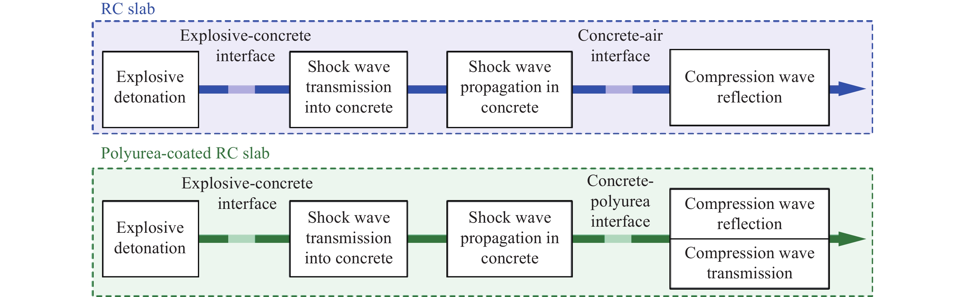 In recent years, polyurea-coated reinforced concrete (RC) slabs have been extensively studied both experimentally and numerically for structural strengthening against contact explosions. However, theoretical investigations remain limited, particularly concerning the impact of polyurea on the local damages of the RC substrates. In this paper, an analytical model based on stress wave propagation theory was proposed to investigate the reflection of compression waves at the backside of the RC substrate slab and predict the spalling depth. Utilizing this analytical model, a quantitative and detailed discussion was presented regarding the effect of the polyurea on the critical spalling and breach of the RC substrate slab. Furthermore, the applicability of the empirical breach prediction, originally developed for uncoated RC slabs, was validated through existing experiments to predict the breach of polyurea-coated RC substrate slabs. The results indicate that polyurea affects the spalling process of the RC substrate slabs. Specifically, the net stress wave adjacent to the concrete-polyurea interface is a compression wave, while it transitions to a tensile wave in the deeper concrete. Polyurea primarily impacts the first spall of the RC substrate slab; subsequent spalling processes after the first spall align with those observed in uncoated RC slabs. Upon the occurrence of critical spalling, polyurea enhances the critical spalling resistance of RC slabs, although it significantly increases the spalling depth. Conversely, when a breach occurs, polyurea reduces the number of spalls but minimally affects on the total spalling depth. Based on these findings, the empirical method for predicting breaches of uncoated RC slabs can effectively be applied to predict the breach of RC substrate slabs coated with polyurea. The test results from more than twenty contact explosion experiments are consistent with the predicted outcomes, thereby validating the effectiveness of the analytical model and providing a method for estimating the breach of polyurea-coated RC substrate slabs.
