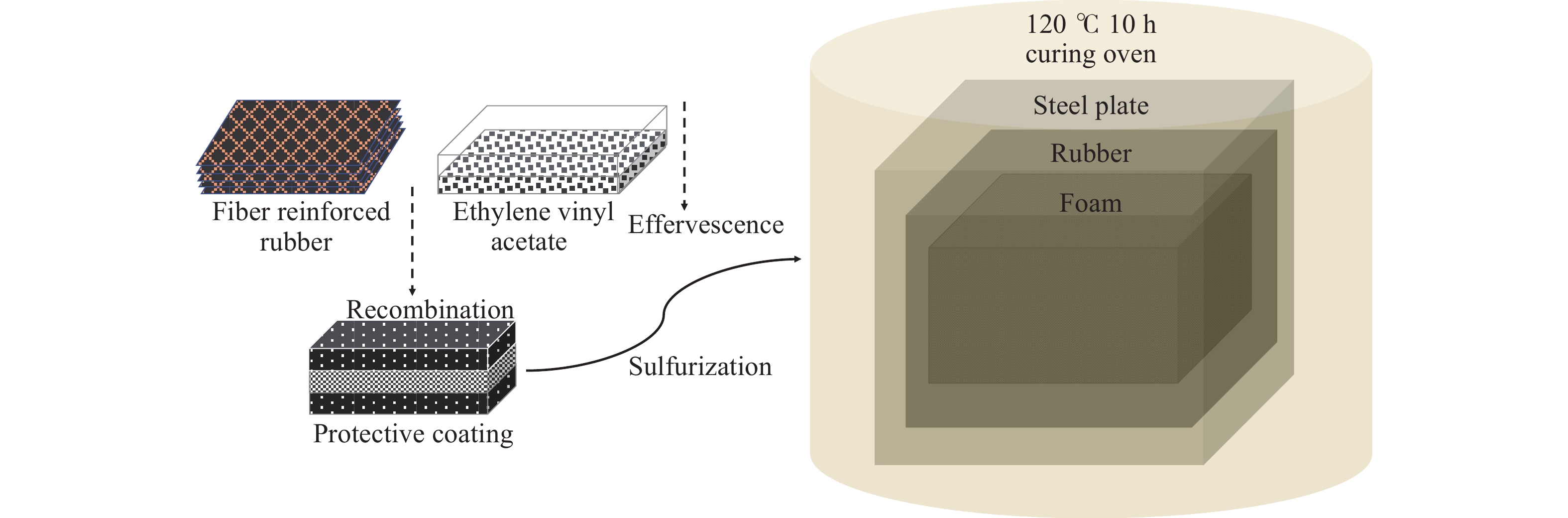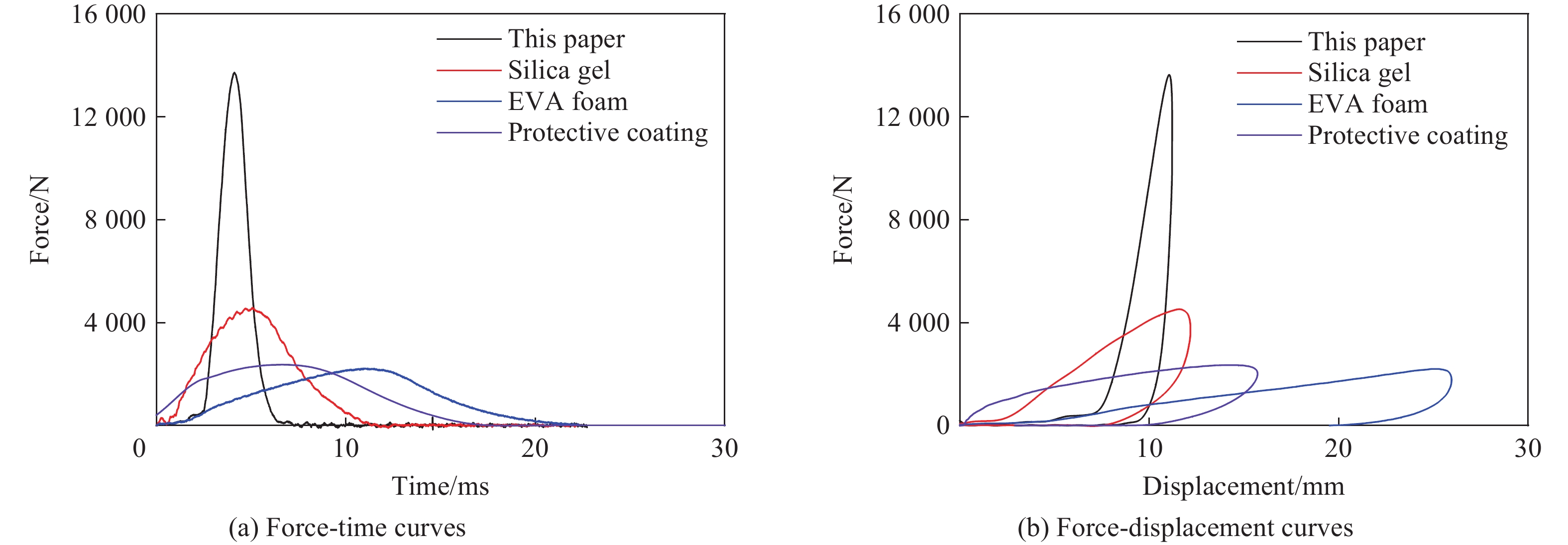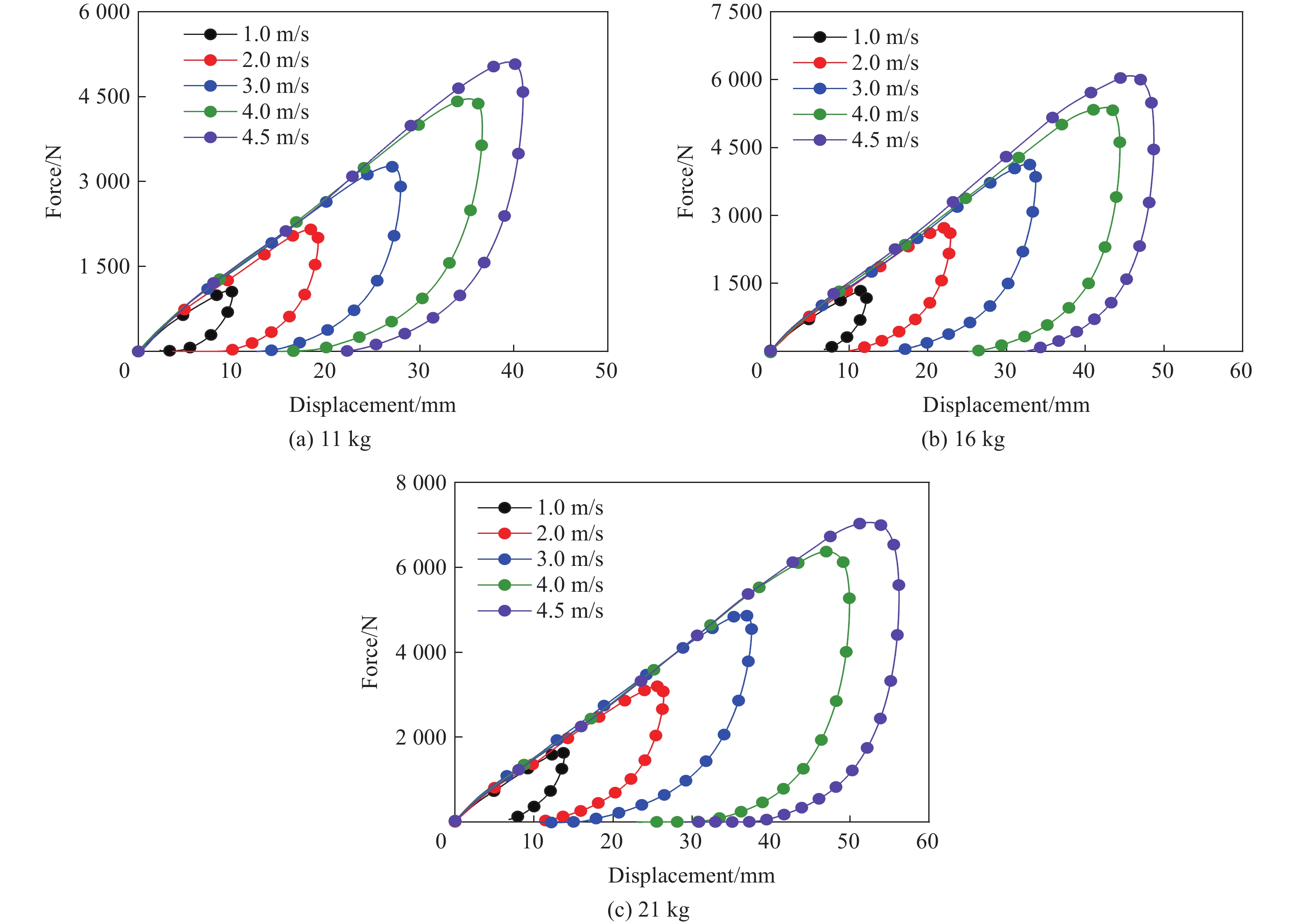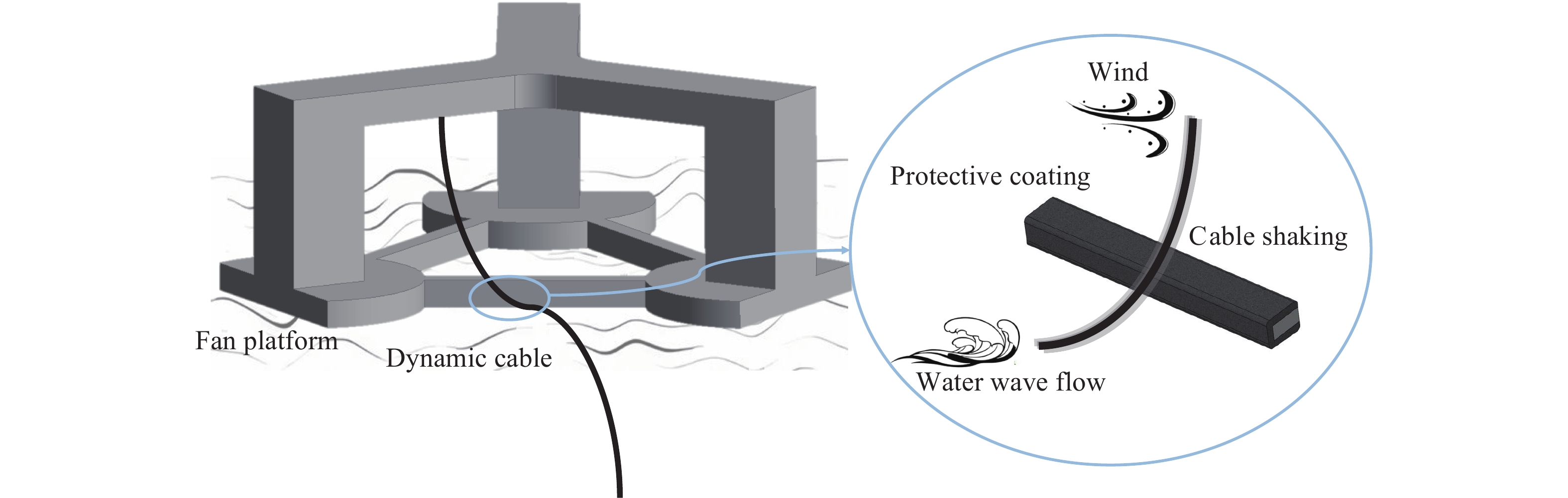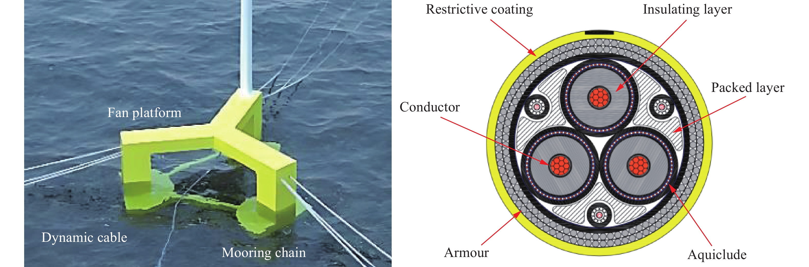 To address the fracture problem of dynamic submarine cables and their protective sheaths caused by friction and collision with wind turbine platforms under harsh sea conditions, a multi-impact resistant composite protective layer was designed using ethylene vinyl acetate (EVA) foam and rubber as the main materials, which possess high elasticity and excellent cushioning properties. Mechanical property tests were conducted on EVA foam materials with various relative densities under different loading conditions using a universal testing machine and drop hammer. Energy absorption efficiency, densification strain, plateau stress and maximum specific energy absorption were introduced to characterize the mechanical properties of EVA foam. The effects of relative density, strain rate and repeated loading on the energy absorption characteristics of EVA foam were revealed. Based on the matching relationship between the energy absorption per unit volume of EVA foam and the kinetic energy of dynamic submarine cables to be absorbed, the optimal thickness of the protective layer was determined, and composite protective layer specimens were fabricated. Subsequently, drop hammer impact tests were performed to compare the cushioning and energy absorption characteristics of the composite protective layer with other materials, preliminarily verifying its high energy absorption efficiency. Further drop hammer impact tests were conducted to investigate the effects of impact energy and loading cycles on the cushioning and energy absorption characteristics of the composite protective layer. The experimental results displayed that: (1) under single impact, the peak force and maximum displacement of the composite protective layer showed a linear positive correlation with the drop hammer mass and impact velocity, with energy absorption efficiency reaching 85%; (2) under multiple impacts, the mechanical properties of the composite protective layer exhibited remarkable stability-the maximum displacement in the fourth impact increased by only 5.5% compared with the first impact, with fluctuations in energy absorption value and instantaneous rebound rate remaining below 5%. The composite protective layer demonstrates unique mechanical properties that provide effective long-term protection for dynamic submarine cables under harsh marine conditions.