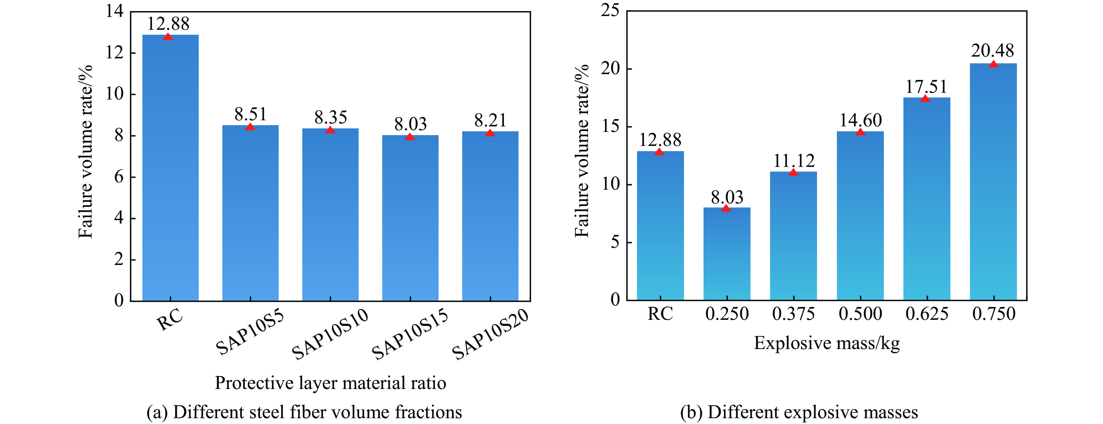 In order to explore the underwater anti-explosion protection effect of steel fiber reinforced cellular concrete materials, the damage process of reinforced concrete slabs under underwater contact explosion was reproduced by the coupling method of smoothed particle hydrodynamics and finite element method (SPH-FEM). The validity of the simulation method was verified by comparing with the experimental results. On this basis, a three-dimensional refined simulation model of water-explosive-protective layer-reinforced concrete slab was established by the SPH-FEM coupling method. The damage evolution process, failure mode and failure mechanism of protective layer of steel fiber reinforced cellular concrete (SAP10S5, SAP10S10, SAP10S15 and SAP10S20) with different fiber ratios and explosive mass were studied, and the prediction curve of damage level of reinforced concrete slabs was constructed. The results show that the numerical simulation results are in good agreement with the experimental results, which verifies the effectiveness of the simulation method. Under the underwater contact explosion, the addition of protective layer of steel fiber reinforced cellular concrete can effectively reduce the damage degree of protected reinforced concrete (RC) slab, and its influence on the damage degree of RC slab decreases first and then increases with the increase of steel fiber volume fraction in the protective layer. Among them, the anti-explosion protection effect of protective layer of SAP10S15 ratio is the best. When the amount of explosive increases within a certain range, the protective layer of SAP10S15 ratio can still maintain a high proportion of energy consumption and effectively reduce the damage degree of the RC plate. When the amount of explosive is 0.25 kg, the damage index of RC slabs strengthened with protective layer of SAP10S15 has the most obvious attenuation compared with the unprotected scheme, which is 42.5%, and the damage level is reduced from serious damage to moderate damage. The prediction curve of constructed damage level can directly evaluate the influence of steel fiber volume fraction/explosive amount on the damage degree of RC panel. The above research results can provide reference for the anti-explosion protection design of wading concrete structures.