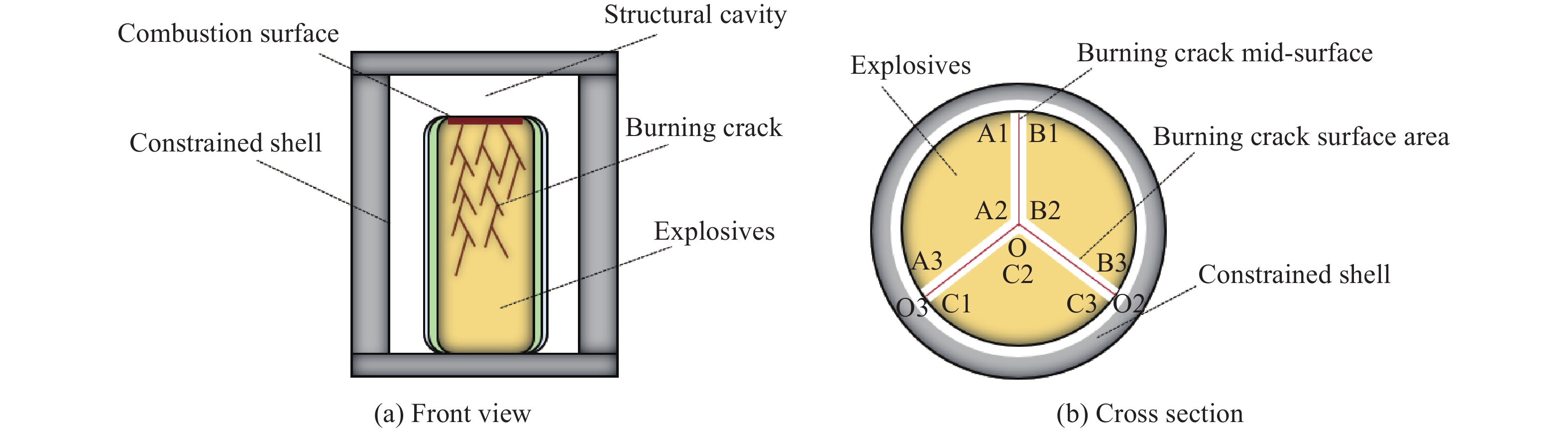 To develop an engineering model based on the physical mechanism of the non-shock initiation reaction of structural charge, which can be used to describe the reaction evolution process and quantify the reaction intensity for evaluating weapons and ammunition safety. Considering the cavity expansion volume, a constrained charge combustion reaction evolution model was established in this paper, with fracture toughness and reaction pressure as the main parameters based on the main control mechanism of charge reaction crack propagation, which can describe the combustion gaseous product pressurization and shell constraint strength during combustion evolution. Relevant details for the control model establishment process were given. The model reliability of confined charge reaction combustion evolution was verified via the experiments of PBX-3 (87% HMX) explosive combustion reaction evolution under mass inertial confinement. The mass velocity time was recorded by PDV (photonic Doppler velocimetry) transducers, the pressure-time profiles were recorded via pressure transducers, and the experimental process was captured via a high-speed camera. The experimental results were compared with calculated results from the control model proposed in this work. The results show that the reaction pressurization process calculated via the model is roughly consistent with the pressure-increasing trend in the experiment (calculated by the mass velocity). The control model considering the structural venting effect can reflect the competition mechanism between combustion gas pressurization and venting in the pressure-increasing process, and the relationship between the pressure-increasing trend and the vent coefficient is in line with the mechanism analysis expectation. The results can support deepening the understanding of the accidental explosive combustion reaction evolution mechanism.