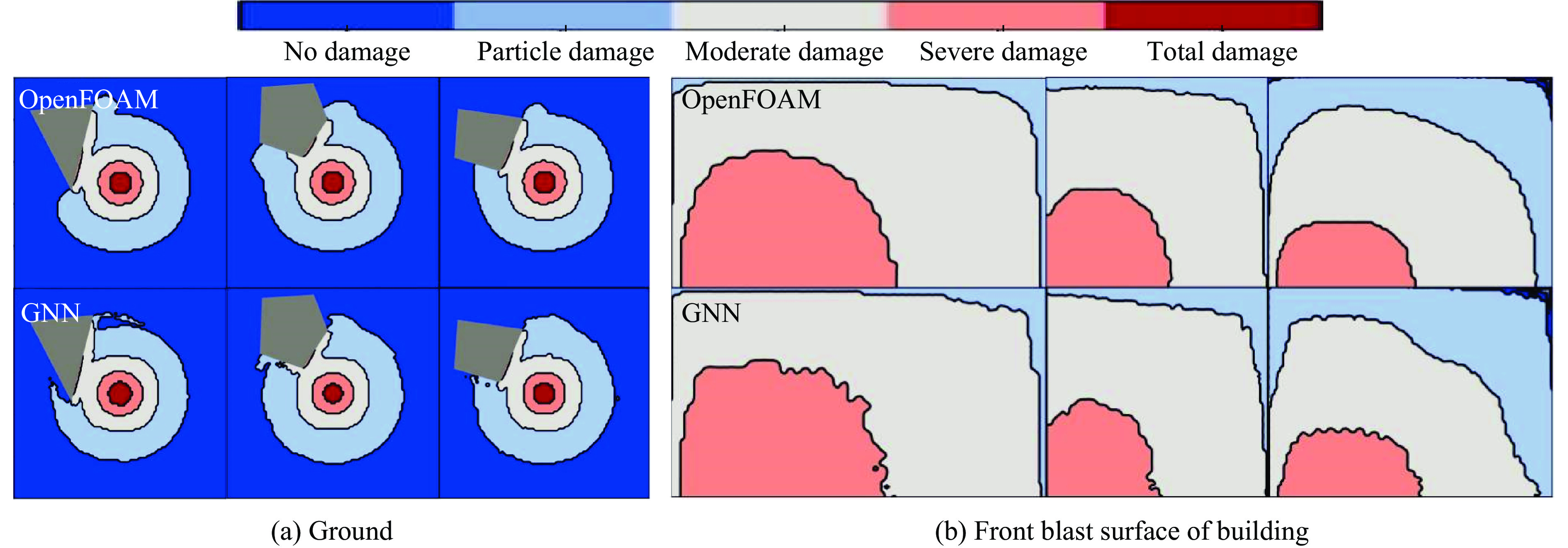 To accurately predict the explosion power fields in buildings, solving the failure of traditional empirical formulas often failing to account for complex environmental factor due to their inability to account for complex environmental factors, and that of numerical simulations inefficient for large-scale urban scenarios and do not meet the needs of rapid damage assessment. Addressing this challenge, an innovative prediction model for explosion power fields based on graph neural networks (GNN) was constructed using an end-to-end strategy. This model enabled rapid and precise forecasting of three-dimensional physical fields, including peak overpressure, peak impulse, and shock-wave arrival times on building surfaces. Compared with numerical simulations, the proposed GNN model demonstrated excellent predictive performance: it achieved a mean square error of 0.97% for predicting surface overpressure parameters of single buildings with varying geometries, and an average prediction error of 3.17% for complex geometric buildings and building communities. When applied to real-world urban settings, the model maintains an average prediction error of 1.29%, completing individual physical field predictions in under 0.6 seconds—three to four orders of magnitude faster than numerical simulations. Furthermore, the model's high-precision predictions allow for the reconstruction of overpressure time history curves at any building surface location and the accurate assessment of structural damage. The proposed GNN model offers a novel approach for rapidly and accurately predicting explosion power fields in urban buildings during blast events. This advancement significantly enhances the capabilities for explosion damage assessment and anti-explosion design in ultra-large-scale complex engineering scenarios, providing substantial engineering value.
