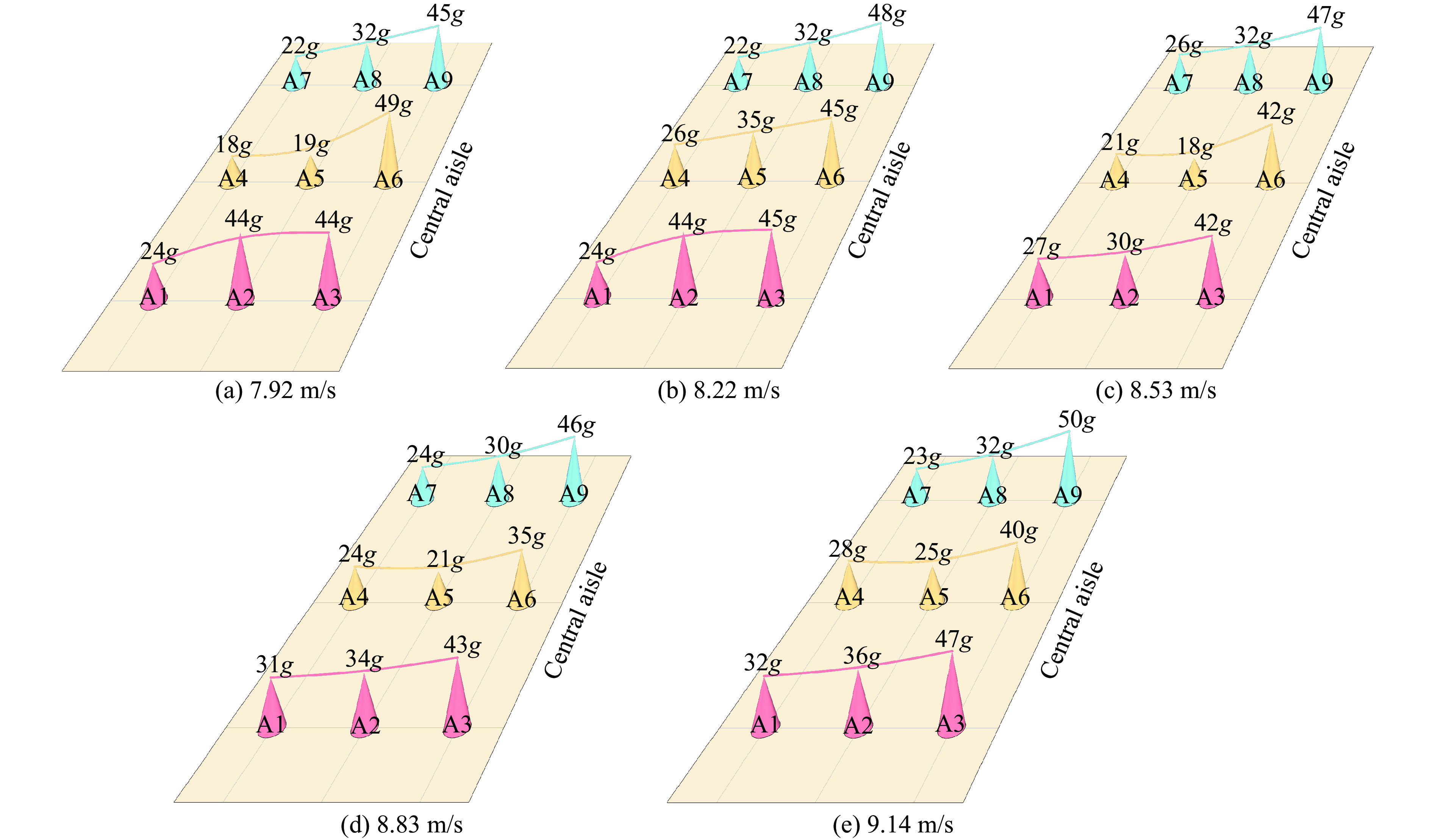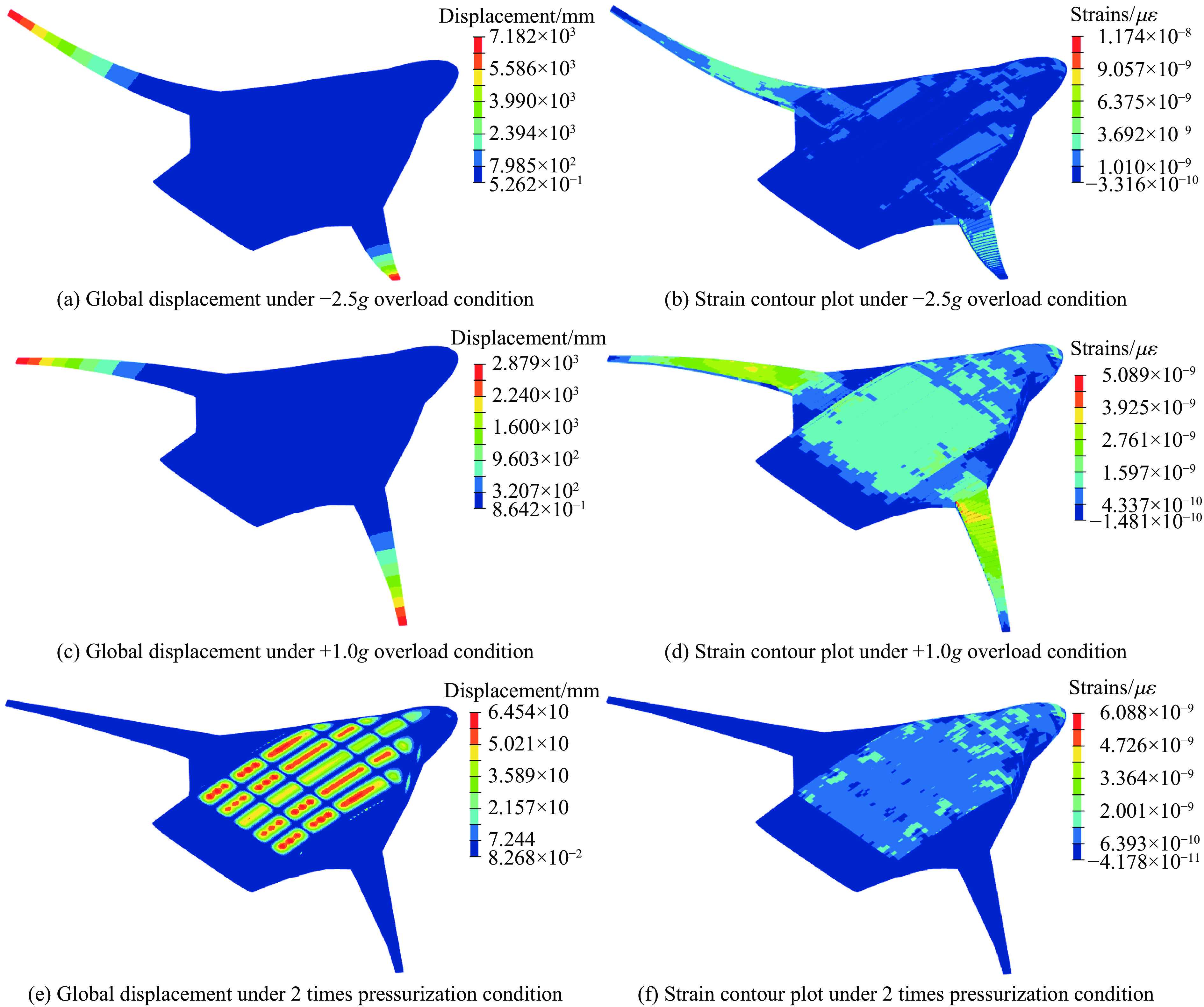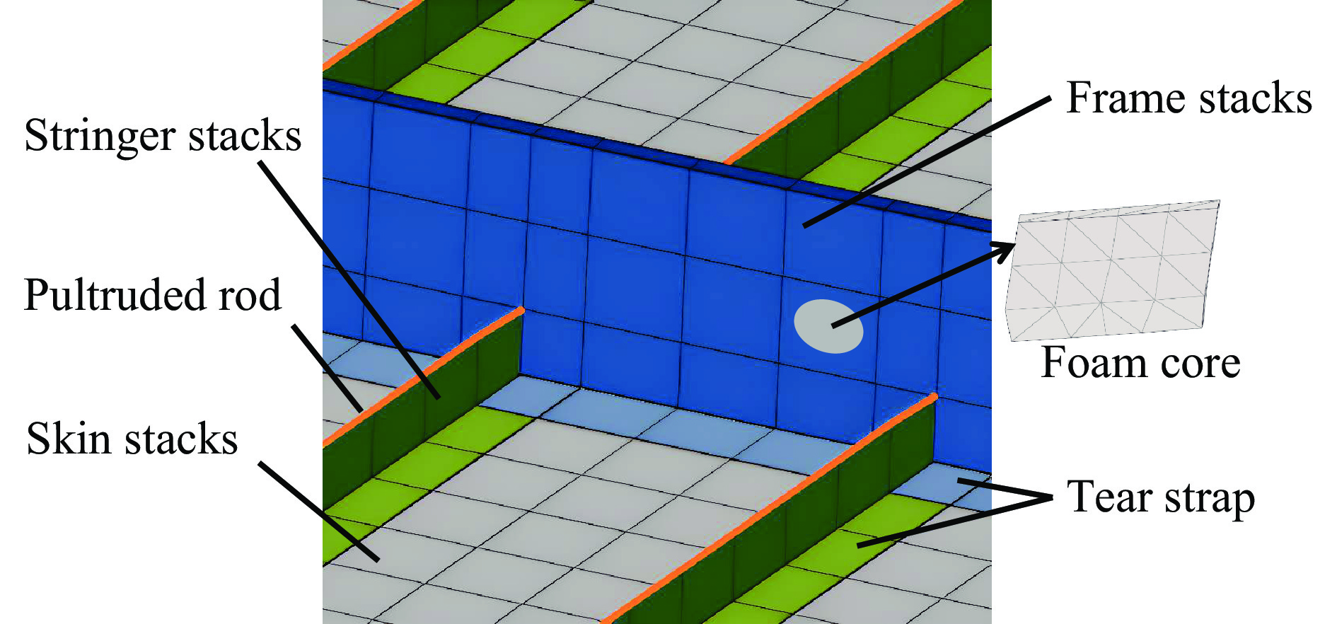 Significant structural and layout disparities exist between the blended wing body (BWB) civil aircraft and conventional cylindrical fuselage metal aircraft. These differences render the impact resistance characteristics of the non-circular fuselage structure and the injury mechanisms for occupants unclear. To address this, a 460-seat BWB aircraft model was developed based on the pultruded rod stitched efficient unitized structure (PRSEUS) proposed by the National Aeronautics and Space Administration (NASA). The aircraft features a wingspan of 80 meters, a range of approximately 16,000 km, a cruising Mach number of 0.85, and a cruising altitude of 11 000 m. Three typical loading conditions were employed to evaluate the strength and stiffness of the BWB structure: critical maneuvering loads (2.5g positive overload and −1.0g negative overload) and cabin pressurization loads (double the cabin pressurization load). Through iterative structural design optimization, the model was confirmed to meet these typical loading requirements while demonstrating sufficient safety margins. The model incorporated all major structural components of the BWB configuration, including skin, frames, stringers, cargo floor, cabin floor, support columns, and fuselage ribs. In the finite element modeling process, elements with minimal influence on the crash response were reasonably simplified to reduce computational complexity. For instance, the outer wings and engines were simplified as concentrated mass points, and the cabin seats and passengers were modeled as concentrated masses fixed to the seat rails. The primary structural components, such as the skin, stringers, floor, and floor beams, were constructed from AS4 carbon fiber composite laminates and modeled using shell elements. The pultruded rods were made of AS4 carbon fiber composite and modeled using beam elements. The foam core of the frames and fuselage ribs were made of Rohacell-110-WF foam material and modeled using solid elements. The remaining structures were made of
