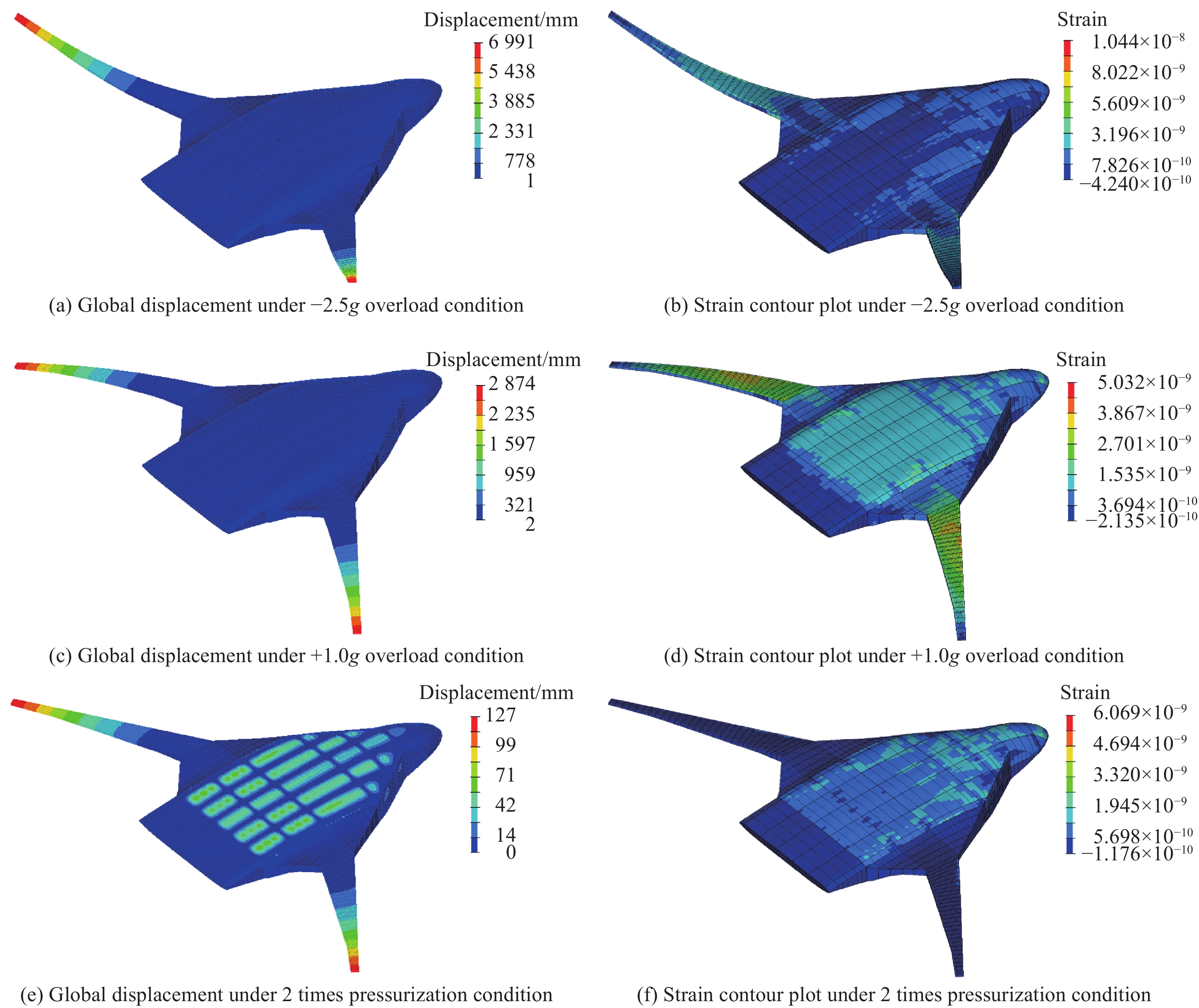 Significant structural and layout disparities exist between the blended wing body (BWB) civil aircraft and conventional cylindrical fuselage metal aircraft. These differences render the impact resistance characteristics of the non-circular fuselage structure and the injury mechanisms for occupants unclear. To address this, a 460-seat BWB aircraft model was developed based on the pultruded rod stitched efficient unitized structure (PRSEUS) proposed by the National Aeronautics and Space Administration (NASA). The aircraft features a wingspan of 80 meters, a range of approximately 16,000 km, a cruising Mach number of 0.85, and a cruising altitude of 11 000 m. Three typical loading conditions were employed to evaluate the strength and stiffness of the BWB structure: critical maneuvering loads (2.5g positive overload and −1.0g negative overload) and cabin pressurization loads (double the cabin pressurization load). Through iterative structural design optimization, the model was confirmed to meet these typical loading requirements while demonstrating sufficient safety margins. The model incorporated all major structural components of the BWB configuration, including skin, frames, stringers, cargo floor, cabin floor, support columns, and fuselage ribs. In the finite element modeling process, elements with minimal influence on the crash response were reasonably simplified to reduce computational complexity. For instance, the outer wings and engines were simplified as concentrated mass points, and the cabin seats and passengers were modeled as concentrated masses fixed to the seat rails. The primary structural components, such as the skin, stringers, floor, and floor beams, were constructed from AS4 carbon fiber composite laminates and modeled using shell elements. The pultruded rods were made of AS4 carbon fiber composite and modeled using beam elements. The foam core of the frames and fuselage ribs were made of Rohacell-110-WF foam material and modeled using solid elements. The remaining structures were made of7075 aluminum alloy and modeled using shell elements. The final model had a total mass of 162.87 tons and consisted of 2 679 991 elements. Five vertical impact velocities ranging from 7.92 to 9.14 m/s were selected to analyze the cabin space integrity, acceleration response of the cabin floor, and the impact characteristics of the primary load-bearing structures. The results indicate that the cabin area of the lift-body fuselage remains largely intact under the different impact velocities. The primary damage occurs below the cabin floor, with compressive damage concentrated in the lower structures of the middle and aft fuselage. The survivable space is preserved. Compared to a round-section fuselage, the deformation of the BWB frames is relatively small, and upward bulging is not significant, making it challenging to form effective plastic hinges. During the crash, the acceleration load distribution of the blended wing body-integrated aircraft exhibits a decreasing trend from the central aisle to the sides of the fuselage, with peak acceleration loads being higher at the central aisle. Under all five crash conditions, passenger injury levels at various cabin positions fall within the serious but acceptable and safe regions. Regarding structural energy absorption, the frames are identified as the primary energy-absorbing structures, followed by the fuselage ribs. However, the cargo pillars do not effectively crush and absorb energy. For future crashworthiness design of BWB civil aircraft, the cargo structure should be a key consideration.