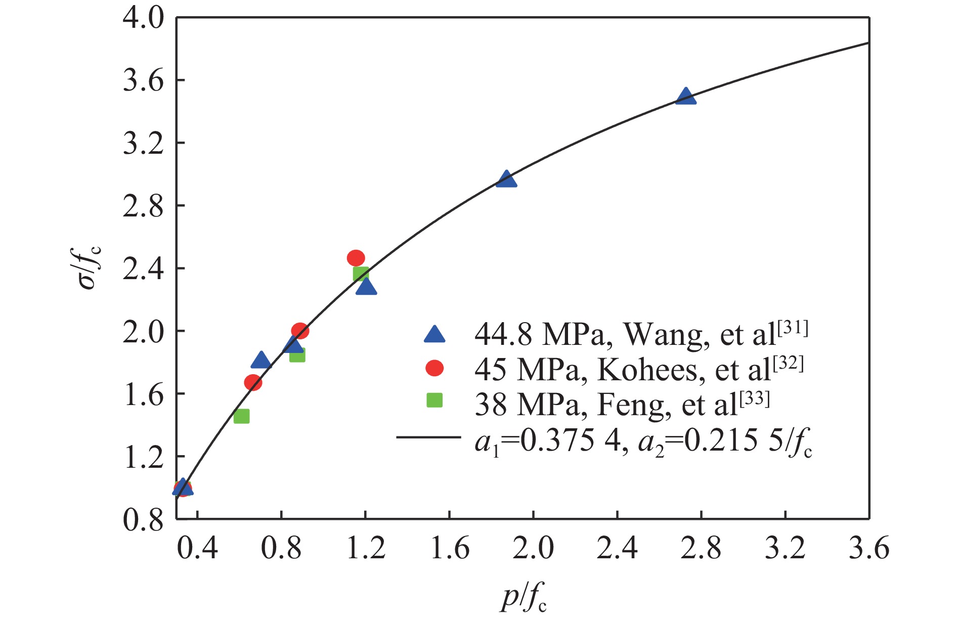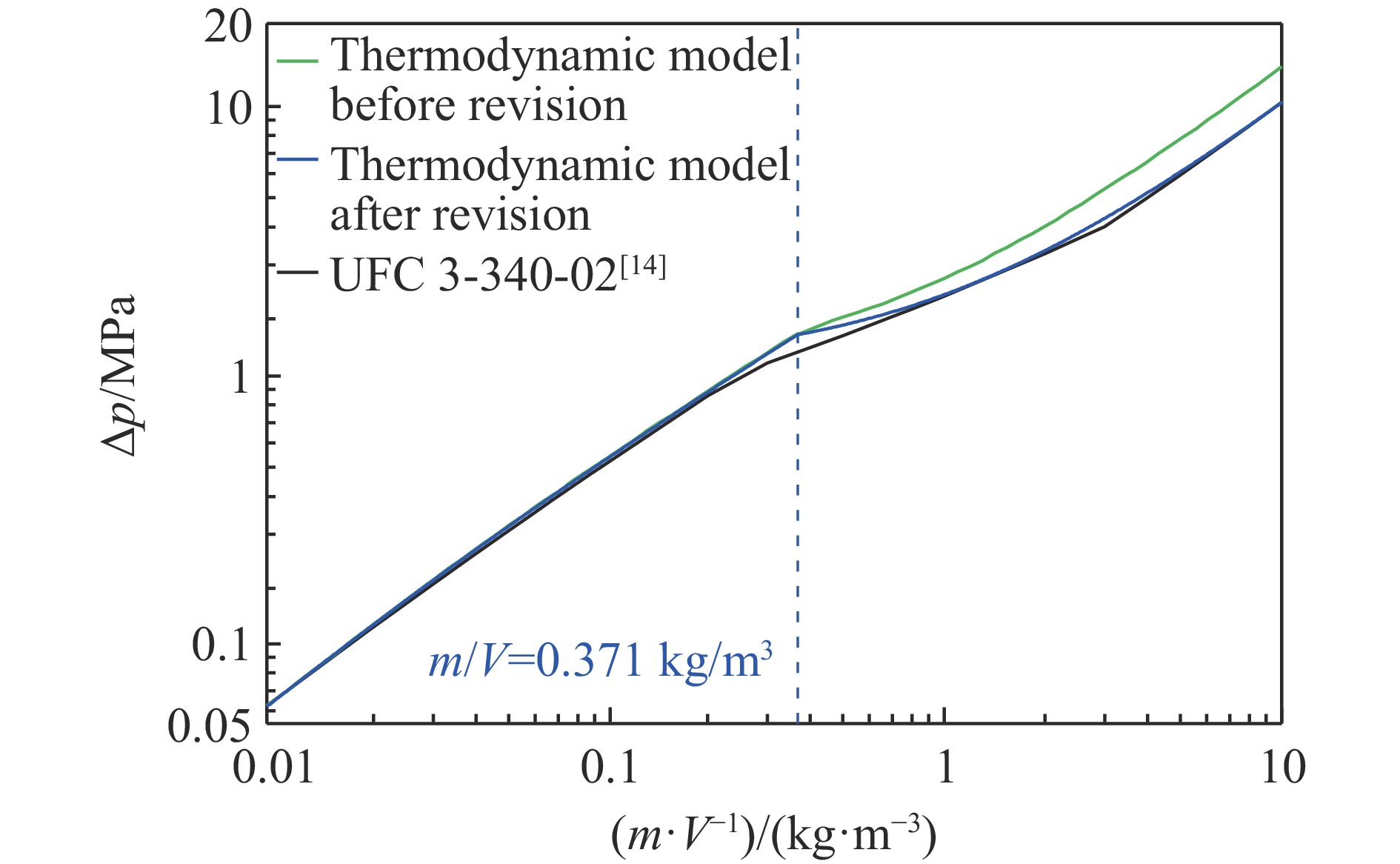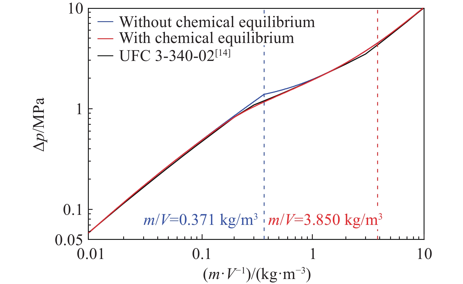 The quasi-static pressure thermodynamic model for confined explosions provides an effective characterization of pressure evolution with mass-to-volume ratio m/V, and derivation of physical quantities such as gas adiabatic index from products and temperature. However, the thermodynamic model based on detonation and combustion equations that neglects reaction equilibrium demonstrates growing deviations from the quasi-static pressure curve in UFC 3-340-02 blast-resistant design standard after carbon precipitates in detonation products, and existing research inadequately addresses the necessity of incorporating reaction equilibrium for various physical quantities in TNT confined explosion thermodynamic models. In order to investigate the influence of reaction equilibrium on thermodynamic calculation results, the model neglecting reaction equilibrium was modified based on the energy conservation equation of isochoric processes and the solid carbon precipitation phenomenon. The modified model has a consistency with the UFC curve for m/V≥0.371 kg/m3. Then, a comparative analysis was conducted on the results of thermodynamic models considering and not considering the reaction equilibrium based on the unified solution framework. The results indicate that incorporating chemical equilibrium into quasi-static pressure calculation introduces a maximum relative deviation below 20%, and critical thresholds alters, i.e., the m/V for carbon precipitation shifts from 0.371 to 3.850 kg/m3, and peak temperature transitions from 0.371 to 0.680 kg/m3. Significant divergence in mole numbers of product composition emerges progressively when m/V exceeds 0.1 kg/m3. Therefore, the reaction equilibrium-based thermodynamic model is a more rational choice for calculating quantities related to components and temperature in TNT confined explosions with m/V>0.1 kg/m3. Finally, a simplified calculation method for products, temperature, and pressure during the quasi-static phase of TNT confined explosions considering reaction equilibrium is proposed based on symbolic regression algorithm. The research contributes to a theoretical understanding of equilibrium effects on thermodynamic model results and the practical implementation of rapid parameter estimation in TNT confined explosion scenarios.