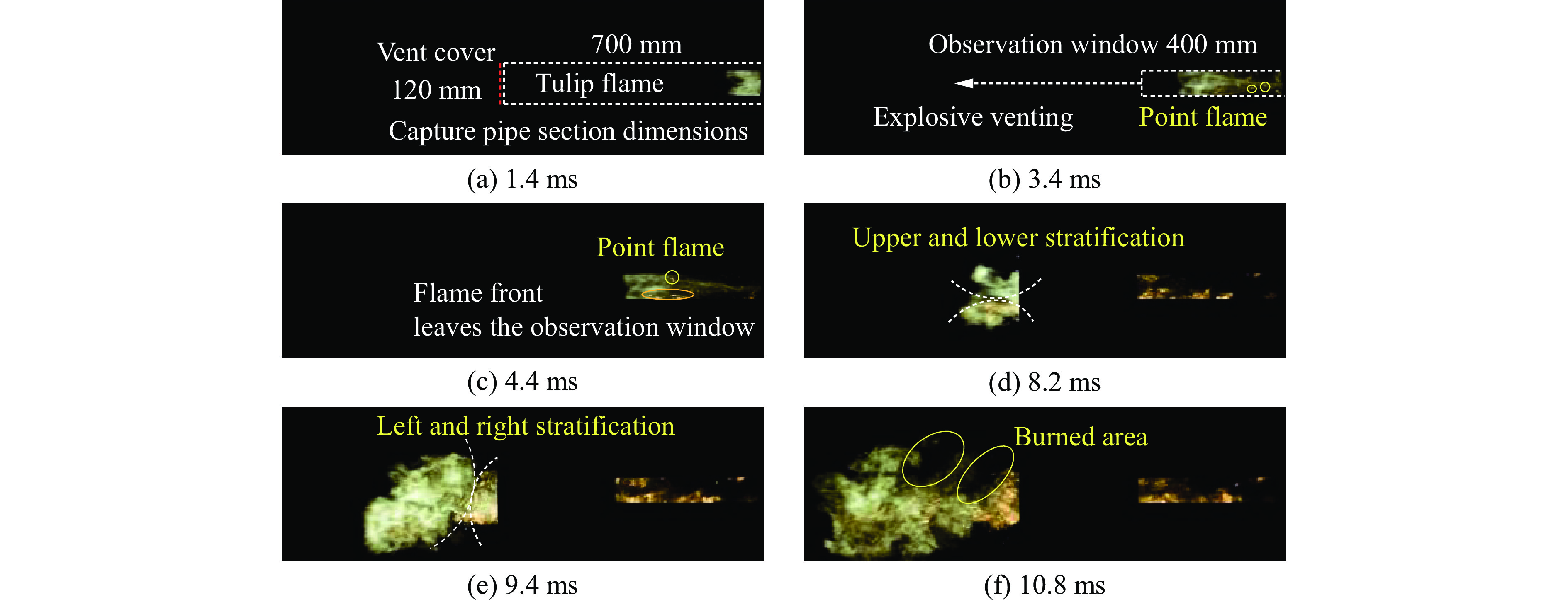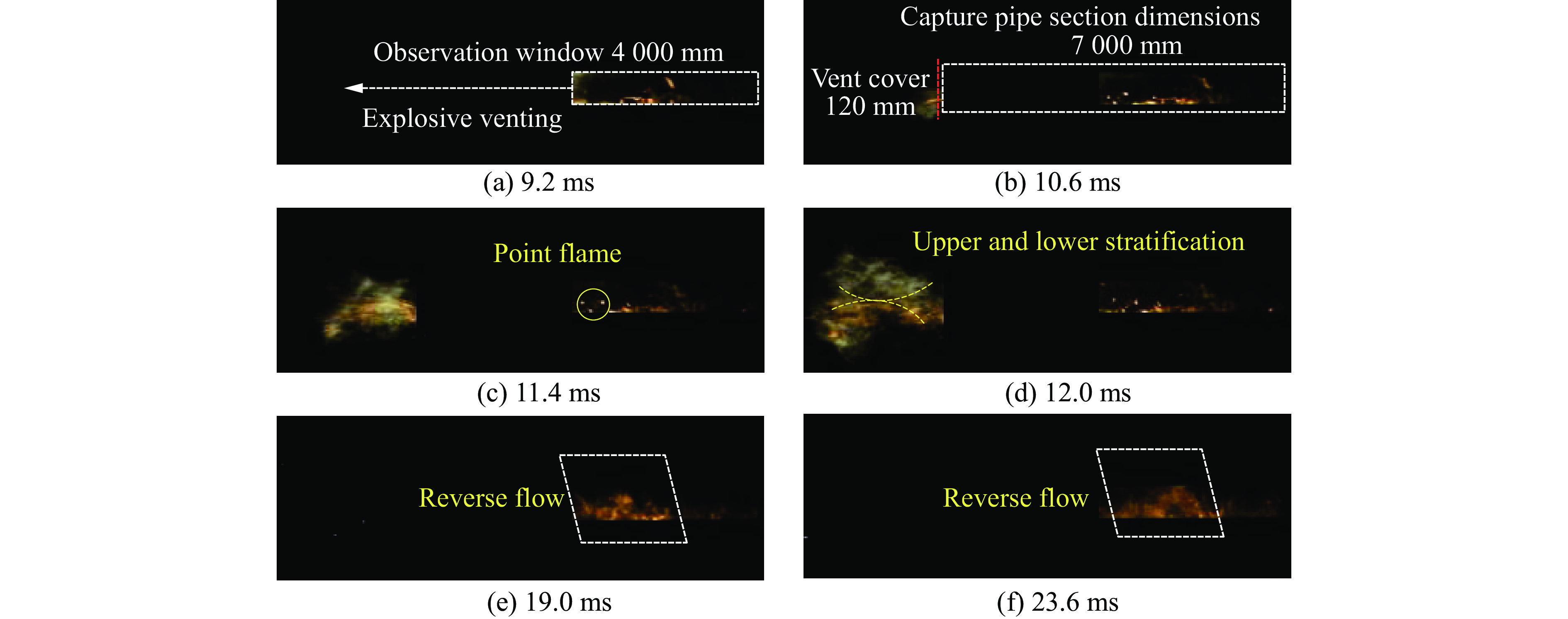 Renewable energy is addressing some of the key challenges facing global society today, and zero-carbon energy systems are the fundamental way to achieve carbon neutrality. Therefore, hydrogen and ammonia have gained great attention as zero-carbon energy sources. To further study the combustion characteristics of ammonia-hydrogen-air premixed gas flame inside and outside the duct, the influence of ammonia doped amount (φ) on the flame morphology and the evolution of pressure inside and outside the duct under stoichiometric ratio was explored with the help of high-speed photography and pressure sensor in the2000 -mm-long stainless steel duct with a 400-mm-long and 70-mm-wide observation window. The results show that φ significantly affects the pressure inside and outside the duct, and the time to reach the reverse flow phenomenon caused by the secondary explosion also increases. The pressure measuring point PS1 is set at 400 mm away from the explosion vent in the duct to collect data. The pressure curves in the duct under each working condition are presented as a three-peak structure, named p1, p2, and p3. The three pressure peaks are caused by the rupture of the explosion vent film, the gas venting in the duct, and the gas reverse generated by the secondary explosion outside the duct. The size of p1 depends on the tensile strength of the explosion venting membrane, and its amplitude is almost independent of the φ. p2 and p3 both increase with the increase of φ, and the p3 increase rate is the largest when φ is in 50%–65%. p2 changes from a single peak to a fluctuating pressure platform in the pressure curve diagram, and the time of the platform extends with the increase of φ. The pressure measurement point PS2 is set at the horizontal central axis, 500mm away from the explosion vent outside the duct, to collect data. And the peak pressure of the secondary explosion outside the duct (pout) decreases with the increase of the φ, and the time to reach pout increases. This study provides a theoretical basis for the utilization of ammonia and hydrogen energy.