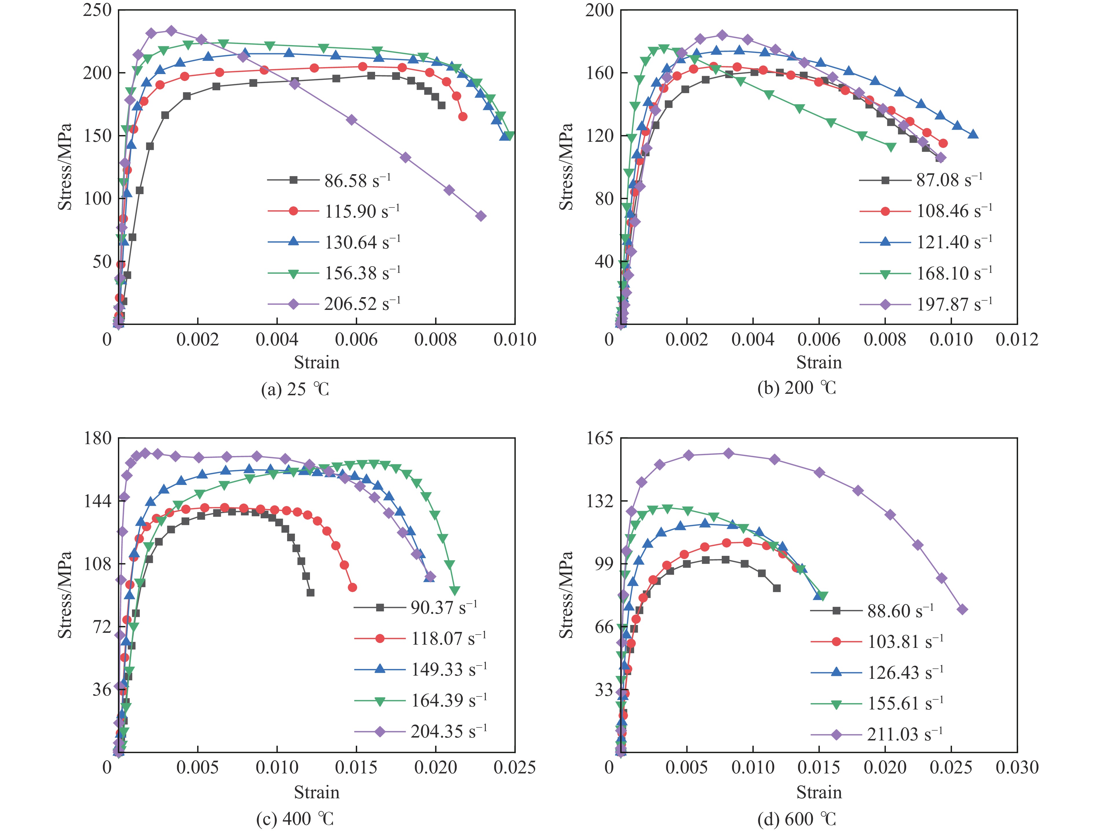 In order to investigate the dynamic mechanical properties of ultra-high performance concrete (UHPC) under coupled high-temperature and explosive impact effects, a 75 mm-diameter high-temperature split Hopkinson pressure bar (SHPB) apparatus was employed. Uniaxial compression tests were conducted on C140 UHPC specimens in the temperatures ranging from 25 ℃ to 600 ℃ and the strain rate ranging from 90 s−1 to 200 s−1. A systematic analysis was performed on the strength, strain, toughness, stress-strain relationship, and failure modes of the material under the combined condition of high temperature and impact loading. The influence of temperature and strain rate on the dynamic mechanical properties was revealed, and the yield surface of the Holmquist-Johnson-Cook (HJC) constitutive model was modified by incorporating thermal effects. The results indicate that UHPC exhibits a significant strain rate strengthening effect under high-temperature dynamic compression, while elevated temperatures simultaneously degrade its mechanical properties. The evolution of material strain capacity and toughness stems from the synergistic interaction between thermal and strain rate effects. At identical temperatures, increased strain rates exacerbate the damage of UHPC. When temperatures exceed 400 ℃, matrix degradation and steel fiber oxidation cause the material to exhibit overall brittle failure characteristics; however, its local core region remains integrity and retains notable residual load-bearing capacity. The modified HJC yield surface is suitable for describing the dynamic mechanical behavior of this material under coupled high-temperature and impact conditions. These findings provide theoretical foundations and data support for the safety design and evaluation of military and civil protective engineering.