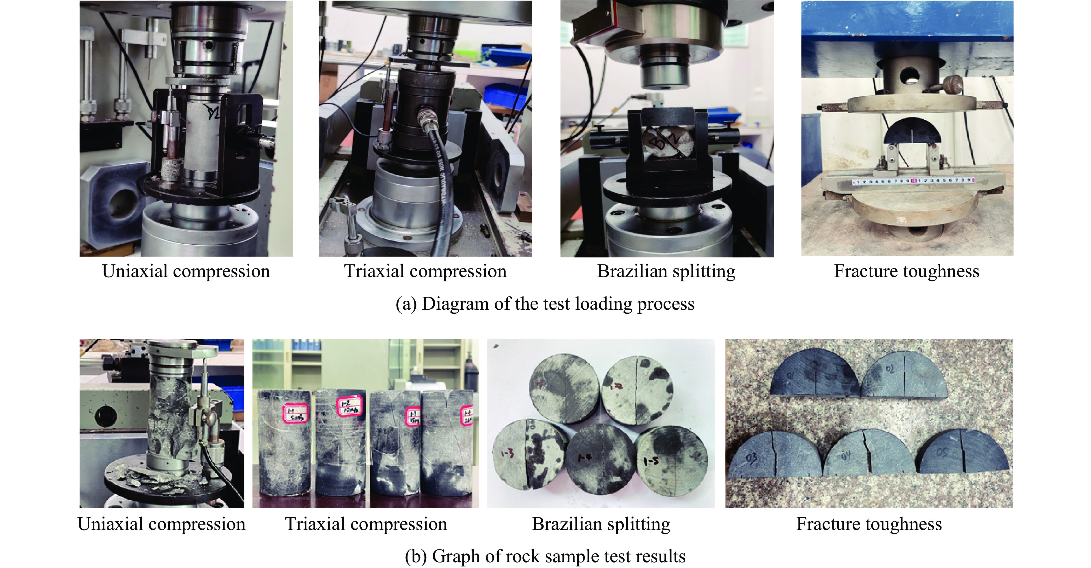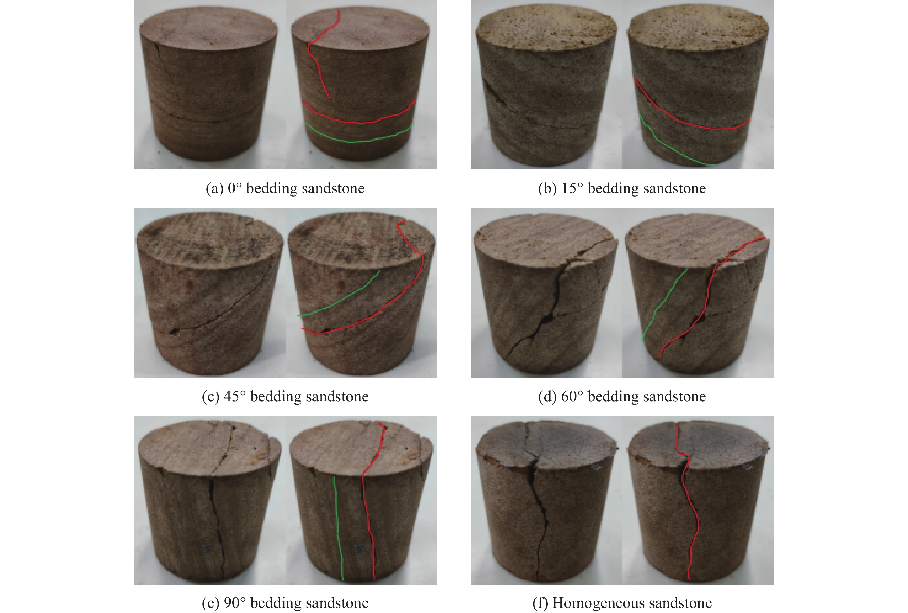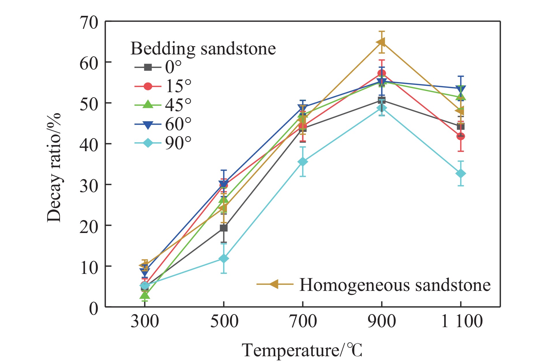 To investigate the dynamic characteristics and dynamic damage constitutive model of high-temperature bedding sandstone under cyclic impact, the physical properties of bedding sandstone after exposure to 300−1100 ℃ were first examined, and the influence of temperature on the color, mineral composition, mass and wave velocity of the specimens was recorded. Second, the dynamic characteristics of high-temperature bedding sandstone under cyclic impact were studied with a split Hopkinson pressure bar (SHPB) apparatus, and the dynamic responses of bedding sandstone at different strain rates and impact numbers were analyzed. Finally, on the basis of the visco-elastic damage element model for bedding rock, a dynamic constitutive model that accounts for high-temperature-impact-load coupling damage was established and verified against experimental data. The results show that the crystallization temperature of the dominant mineral quartz lies between 500 ℃ and 700 ℃; the higher the temperature, the darker the apparent color of the rock and the lower its mass. With increasing temperature, the wave velocity and peak stress first decrease and then increase. Temperature inflicts greater damage on 0° and 45° bedding sandstone, and the damage is most pronounced at 900 ℃. Under an impact voltage of 1300 V, the peak stress of bedding sandstone increases and then decreases with increasing impact number. Impact loading renders 0° bedding sandstone more susceptible to failure after high-temperature exposure, whereas 45° and 60° bedding sandstone exhibit strong impact resistance. The difference between the predicted and experimental curves is small, indicating that the model satisfactorily describes the cyclic-impact mechanical behavior of high-temperature bedding sandstone. The findings provide a valuable theoretical reference for the prevention and control of rock dynamic disasters in complex deep geothermal engineering environments.