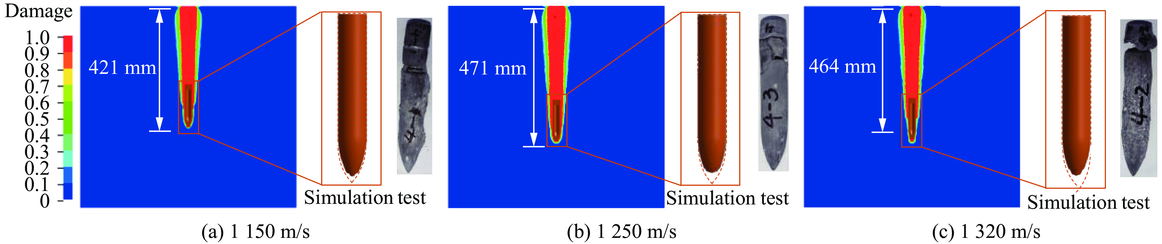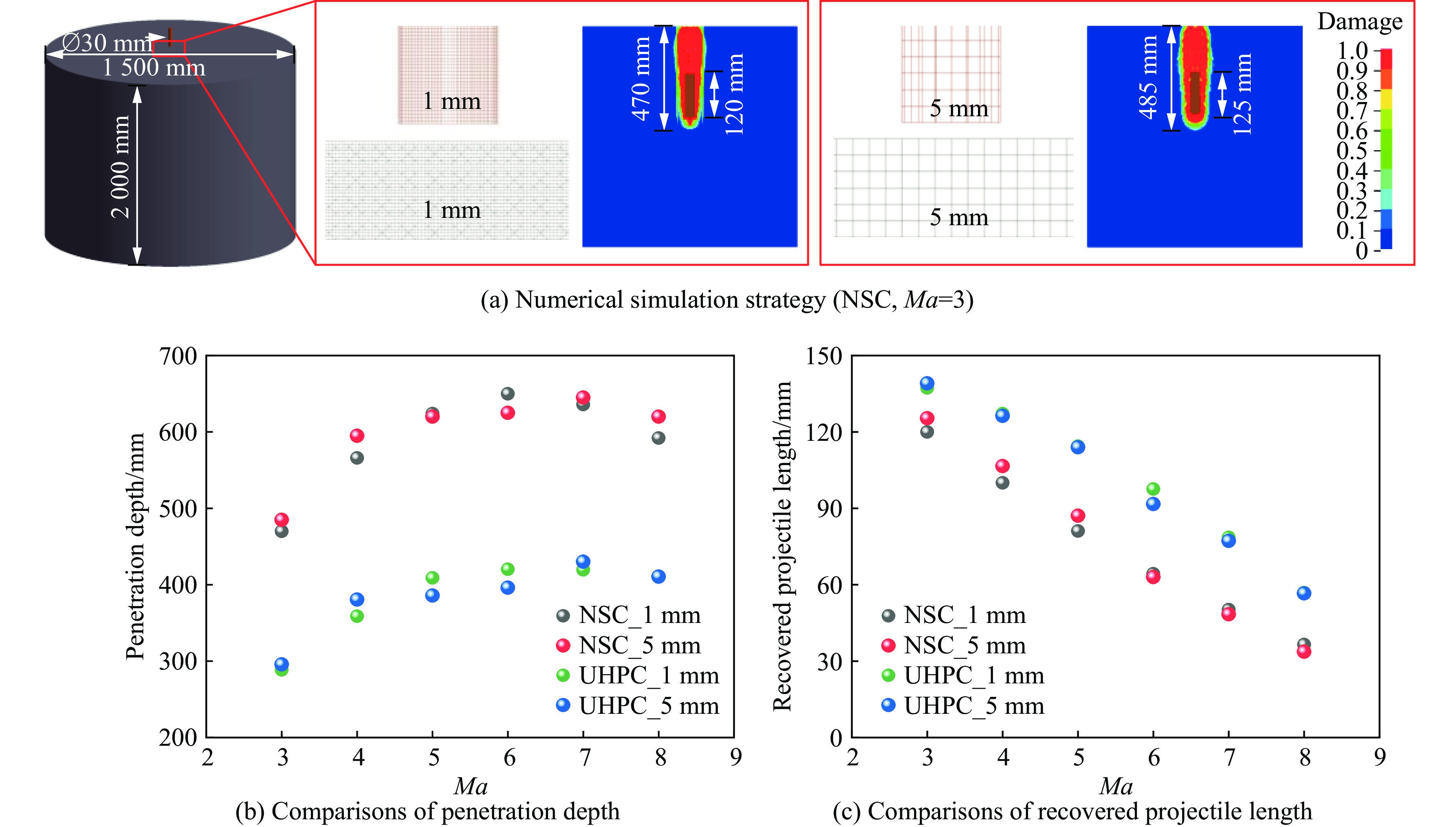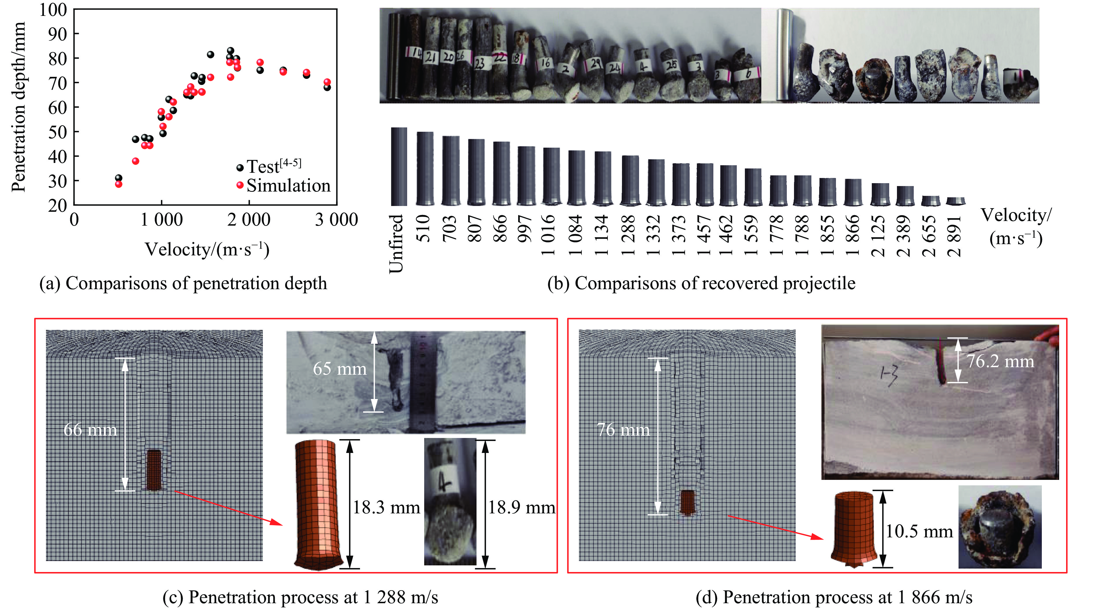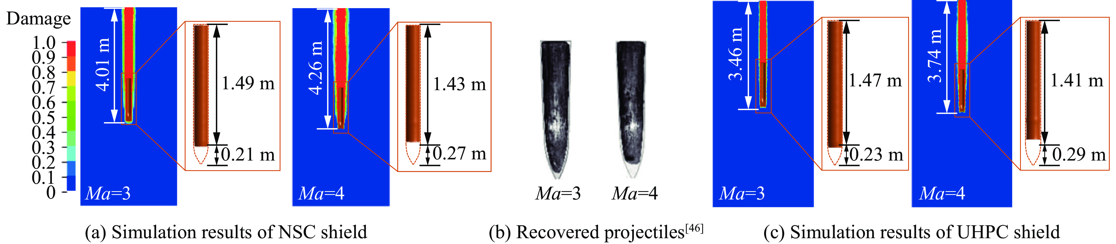 With the rapid development of hypervelocity weapons, analyzing the penetration effectiveness of hypervelocity weapon warheads on concrete shields is significant for the design of newly-built protective structures and the safety evaluation of as-built protective structures. Focusing on the penetration performance of AGM-183A hypervelocity weapon warhead against three typical shields: normal strength concrete (NSC), ultra-high performance concrete (UHPC), and corundum rubble concrete (CRC), firstly, the reliability of the numerical algorithms, mesh size, and material model parameters used in the finite element analysis method was fully validated by comparing the experimental and simulation results of three types of target subjected to penetration of steel/tungsten alloy projectiles. Subsequently, a numerical analysis method for the prototype scenario was established based on a mesh transition strategy equivalent to penetration depth and recovered projectile length. Finally, a series of simulations were conducted for the AGM-183A hypervelocity weapon warhead penetrating the aforementioned three shields at Ma ranging from 3 to 8. The results indicate that: (1) the AGM-183A hypervelocity weapon warhead reaches maximum penetration depth when NSC, UHPC, and CRC shields subjected to penetration at Ma=4, Ma=4, and Ma=3, respectively, with depths of 4.26, 3.74, and 1.00 m. Due to instability phenomena of projectiles, such as fractures at the junction between the head and body caused by local stress concentration, further increases in penetration velocity lead to a decrease in penetration effectiveness; (2) compared with the combined penetration and explosion damage depths of conventional sound speed penetrating warheads SDB, WDU-43/B, and BLU-109/B, the penetration depths induced by AGM-183A into NSC, UHPC, and CRC shields are 3.2, 1.6, and 1.8 times, 4.7, 2.1, and 2.2 times, and 3.4, 1.3, and 1.5 times higher, respectively; (3) the recommended design thicknesses of the three shields against the AGM-183A hypervelocity weapon warhead are 8.01, 7.03, and 1.88 m, respectively. The UHPC shield shows no significant improvement subjected to hypervelocity penetration compared with the NSC shield. Comparatively, the CRC shield is recommended for shield design, which can be effectively subjected to both conventional subsonic and hypervelocity impacts.