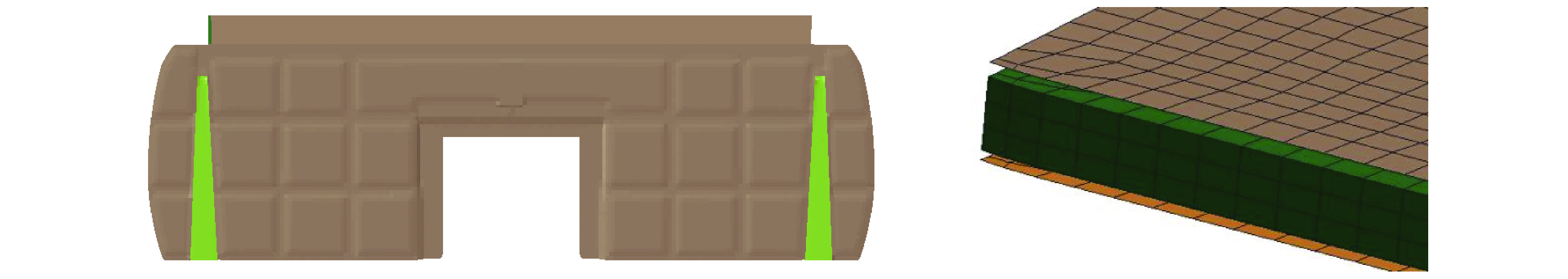 In response to the insufficient lightweight issue of the baffle plate for the nose end frame with an aluminum alloy stiffened structure in active civil aircraft, a new type of aluminum foam sandwich baffle structure is proposed based on an in-depth exploration of the energy absorption mechanism of aluminum foam sandwich structures against bird impact. This innovative design employs an asymmetric panel configuration that includes a highly ductile 2024-T3 aluminum alloy upper face sheet, a high-strength 7075-T6 aluminum alloy lower face sheet, and an aluminum foam core layer in between. It replaces the traditional aluminum alloy stiffened panel, aiming to significantly reduce structural weight while ensuring excellent bird strike resistance. First, the effectiveness of the bird body constitutive model and its contact algorithm was verified by comparing the high-speed bird body impact test on aluminum alloy flat plates with the simulated strain data. Based on previous experimental data, combined with parameter inversion and simulation cases, the simulation data of homogeneous and gradient aluminum foams are in good agreement with the test results, which verifies the accuracy and applicability of the aluminum foam material constitutive model. Furthermore, using the professional Pam-crash software, transient impact dynamics simulations of bird strikes were conducted on both the stiffened panel structure and the aluminum foam sandwich structure end frame. Combined with the damage and deformation conditions of each component and energy absorption data, a comparative analysis was made on the differences in their impact response characteristics and energy absorption mechanisms. The study shows that the stiffened panel mainly absorbs the energy of bird body impact through its plastic deformation, while the aluminum foam sandwich structure absorbs energy synergistically through the compressive collapse failure of the core layer and the large plastic deformation mechanism of the upper face sheet. The optimized aluminum foam sandwich structure is significantly superior to the traditional stiffened panel structure in terms of energy absorption efficiency. Subsequently, a full-coverage optimization design scheme for the baffle was completed based on the energy absorption characteristics of the aluminum foam sandwich structure. According to the full-coverage bird impact simulation results, the proposed aluminum foam sandwich baffle design achieves a structural weight reduction of more than 30% while maintaining the same bird strike resistance performance as the in-service structure. This research provides reliable technical references and innovative ideas for the lightweight bird strike-resistant design of the civil aircraft nose bulkhead.