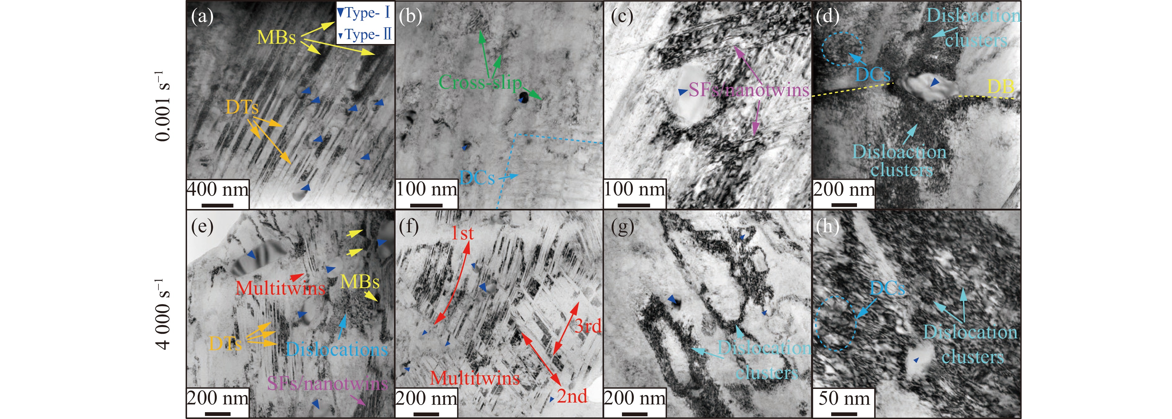 To further explore the influence of interstitial C atom on the strain rate effect and temperature effect of CoCrNi-based medium-entropy alloy, the compression mechanical behavior, microstructure evolution and deformation mechanism of CoCrNiSi0.3C0.048 medium-entropy alloy were systematically studied at a wide temperature and strain rate range. The investigated alloy is composed of face-centered cubic (FCC) matrix and three-level precipitate microstructure, i.e. the primary Cr23C6 carbides (2−10 μm), the secondary SiC precipitates (200−500 nm), and the tertiary SiC precipitates (~50 nm). The results show that the serrated flow phenomenon is observed on the true stress-strain curve of the alloy at 400 ℃, and the amplitude of the serrations decreases gradually with the increase of strain and ultimately vanishes. In addition, the abnormal stress peak (the 3rd-type strain aging phenomenon) appears on the curve of the quasi-static flow stress with temperature, but at high strain rate, the abnormal stress peak disappears. Through the analysis of the characterization of the deformed microstructure, it is speculated that the main reason for the phenomenon of 3rd-type strain aging under quasi-static conditions may be the existence of interstitial C atoms. During the process of continuous plastic deformation and development, a series of mixed structures similar to heterogeneous structures are generated, which are composed of dense dislocation cells, micro bands, stack faults, dislocation clusters and deformation twins. These mixed structures intensify the interaction between interstitial atoms and moving dislocation, and then pin the dislocation, which results in dynamic strain aging phenomenon occurs. The reason why the 3rd-type strain aging does not appear under dynamic conditions may be that the solute atoms move slower than the dislocation. The dislocation cannot be pinned in time. In addition, the precipitation of a large number of nanoscale SiC precipitates weakens the "pinning" effect of interstitial atoms under dynamic loading.