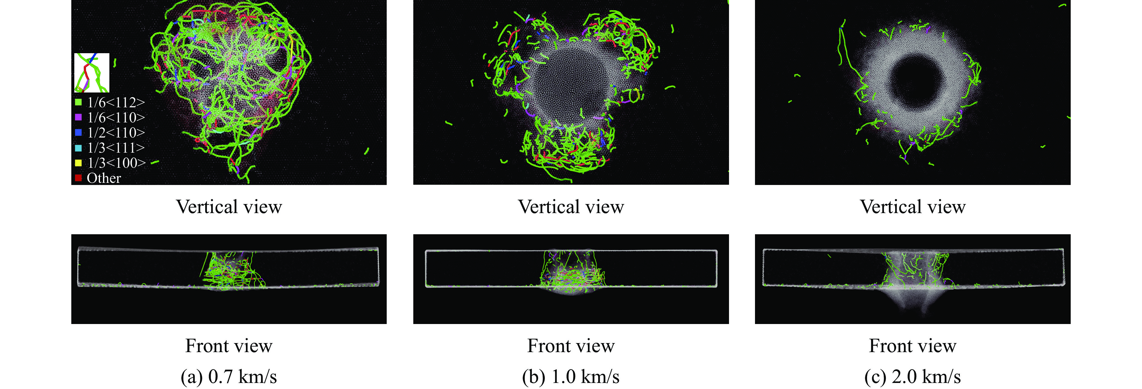 To investigate the evolution of phase structure, dislocation distribution, energy absorption capacity, and impact accumulation effect of high-entropy alloys (HEA) under shock loading, molecular dynamics simulations were employed to systematically analyze the dynamic response behavior of Al0.3CoCrFeNi HEA plate subjected to single and secondary impact load. The results show that under the first impact, the phase structure evolution and energy absorption mode of the plastic region of Al0.3CoCrFeNi HEA plate exhibits significant velocity dependence. As the velocity increases, the proportion of face-centered cubic structure shows a three-stage downward trend, while the disordered structure increases accordingly. Under low velocity impact (0.5-1.0 km/s), energy is mainly absorbed by dislocation network; at medium velocity impact (1.0-2.0 km/s), both dislocations and disordered atoms contribute; under high velocity impact (2.0-3.0 km/s), disordered atoms dominate energy absorption. Within the velocity range of 0.5-0.8 km/s of the rigid sphere, the dislocation line length increases linearly with the impact velocity. However, at higher impact velocities, the dislocation line length decreases due to the limitation of the plate thickness. The stress analysis shows that when the impact velocity increases, both the maximum stress and the boundary stress of the plastic zone exhibit nonlinear variations characterized by a quadratic relationship. Under the secondary impact, the Al0.3CoCrFeNi HEA plate forms a damage zone resembling a trapezoidal shape after impact. The radius of the pit within this damage zone exhibits a quadratic relationship with the impact velocity. Additionally, the minimum affected area resulting from the secondary impact also demonstrates a quadratic relationship with the impact velocity. Regarding impact resistance, as the initial impact velocity increases, the residual velocity following the secondary impact also rises, indicating a reduction in the resistance capability of HEA. At a distance of 10 nm from the impact center, the ballistic limit velocity decreases nonlinearly with increasing initial impact velocity. However, an increase in the secondary impact velocity mitigates the effects induced by the initial impact.
