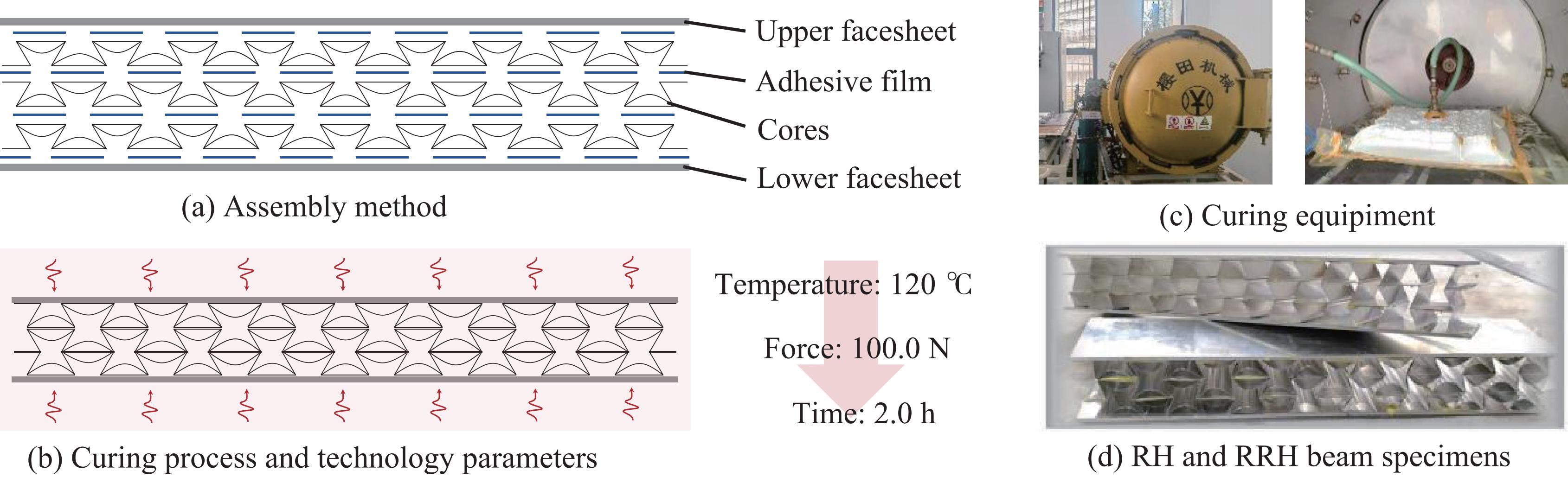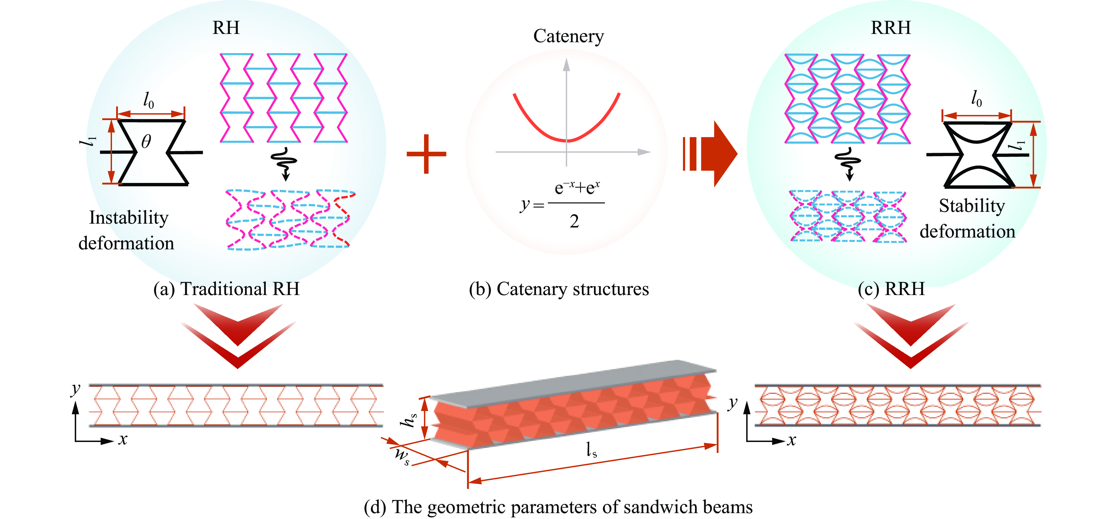 The catenary reinforced method can enhance the crashworthiness of re-entrant honeycomb (RH) by avoiding hollow structural characteristics, strengthening negative Poission’s ratio effect, and utilizing the high load-bearing effectiveness of catenary structures. Based on the above effects the sandwich beam with reinforced RH (RRH) was proposed. The metallic specimens from the proposed structure were fabricated for three-point bending tests. Results show that the introduced catenary structure can limit the rotation deformation of inclined cell walls around vertices, and the drop in load-bearing force after initial plastic deformation is reduced from 29.3% to 6.6%. Compared to classical RH cored beams, the maximum load-bearing force and energy absorption of RRH ones can be improved by 26.7% and 8.9%, respectively. A parametric analysis was conducted to reveal that the thicknesses of front facesheet, back facesheet, and core had a significant effect on deformation behavior and energy absorption of RRH cored sandwich beams. The thickness of front facesheets, cores, and back facesheets was employed as optimization variables, and the mass, maximum load-bearing force, and energy absorption were used as optimization objectives to perform the multi-objective optimization of RRH cored sandwich beams. The optimized sandwich beam exhibits increases of 64.9% in maximum load-bearing capacity and 46.9% in energy absorption. The impact resistance of conventional honeycomb sandwich beams under in-plane and out-of-plane loading was compared at identical wall thickness and mass, respectively. Analysis demonstrated the superior energy-absorbing protective performance of the proposed RRH sandwich beams. The research results can provide useful guidance for the reinforcement design of honeycomb cored sandwich beams.