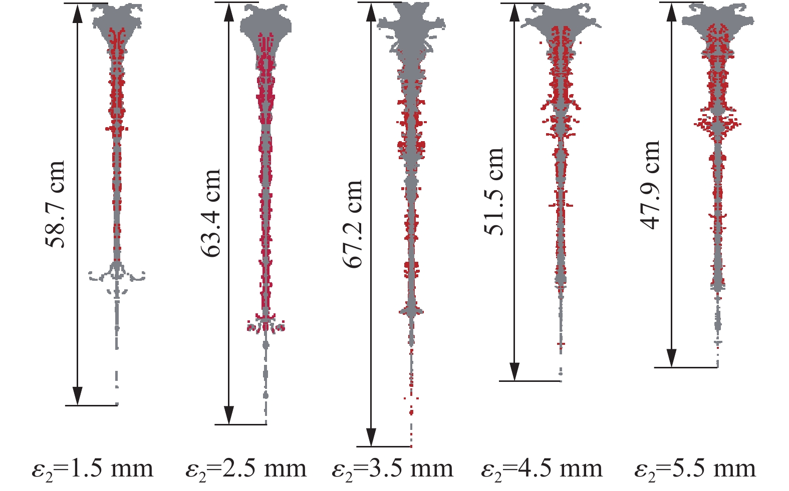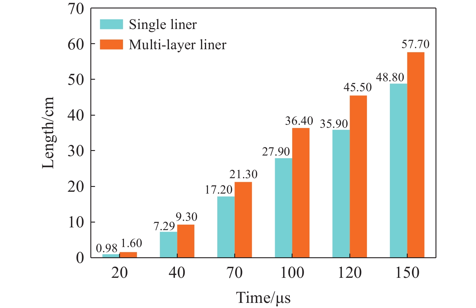 Aiming at the limitations of traditional metal jets in penetrating concrete targets, such as limited damage range and insufficient dynamic response, a novel double-layer energetic composite liner structure with a truncated inner layer made of high-entropy alloys/aluminum/polytetrafluoroethylene (HEA/Al/PTFE) was proposed for the first time. The hemispherical composite liner’s HEA layer was prepared using vacuum arc melting, while the Al/PTFE inner layer was formed through powder compaction and sintering. To thoroughly verify the performance advantages of the composite liner, two types of shaped charge structures were fabricated during the experimental phase for comparison: one with the composite liner and the other with a single-layer HEA liner. C35 plain concrete cylinders were used as targets, with single-point initiation at the center of the charge top. Additionally, numerical simulations of the jet formation process were conducted using the commercial finite element software ANSYS-LS-DYNA. The explosive and liner were modeled with the Smoothed Particle Hydrodynamics (SPH) algorithm to accurately capture the dispersal behavior during jet formation, while the casing was simulated with the Lagrangian algorithm to describe the expansion and fragmentation process of the outer shell. In the simulation, the high-temperature and high-strain-rate mechanical behaviors of HEA, Al/PTFE, and 45 steel were described using the Johnson-Cook constitutive model. The explosive was modeled with the classical JWL equation of state, and air was treated as an ideal gas. All relevant parameters were sourced from published literature. Based on the axisymmetric curvature characteristics of the hemispherical liner and the material discontinuity introduced by truncation, a partitioned formation theoretical model was further established. An energy loss coefficient η (η=0.2) was introduced to modify the detonation energy transfer process. According to the truncation angle, the composite liner was divided into two regions with different physical mechanisms. The jet radius and slug radius for each region were derived using mass and momentum conservation. Experimental results show that both the composite liner and the single-layer HEA liner can form stable penetrating jets, achieving complete penetration of the concrete targets. Compared to the single-layer HEA liner, the composite structure significantly enhances the fragmentation and crack propagation capabilities inside the concrete. Numerical simulation results indicate that the Al/PTFE inner layer exhibits a “coating and cohesive” effect on the HEA jet, effectively suppressing radial dispersion and improving the continuity of the mid-section of the jet. However, multiple collision-following-separation behaviors between the inner layer and the main jet delay the system from reaching dynamic equilibrium. The established partitioned formation theoretical model demonstrates good predictive accuracy, with relative errors of less than 15% between the predicted jet and slug radii and the numerical simulation results. Further parametric analysis reveals that the thickness and height of the inner layer significantly influence jet formation. The optimal parameter combination is a thickness of 3.5 mm and a height of 12 mm, which achieves the best balance between suppressing radial dispersion, maintaining jet length, and enhancing mid-section cohesion. This composite liner effectively integrates the excellent mechanical properties of HEA with the high energy release characteristics of Al/PTFE. The established partitioned formation theoretical model provides a reliable theoretical basis for the design of hemispherical composite liners. The research findings offer important theoretical and experimental support for the optimized design and engineering application of novel energetic composite liners.