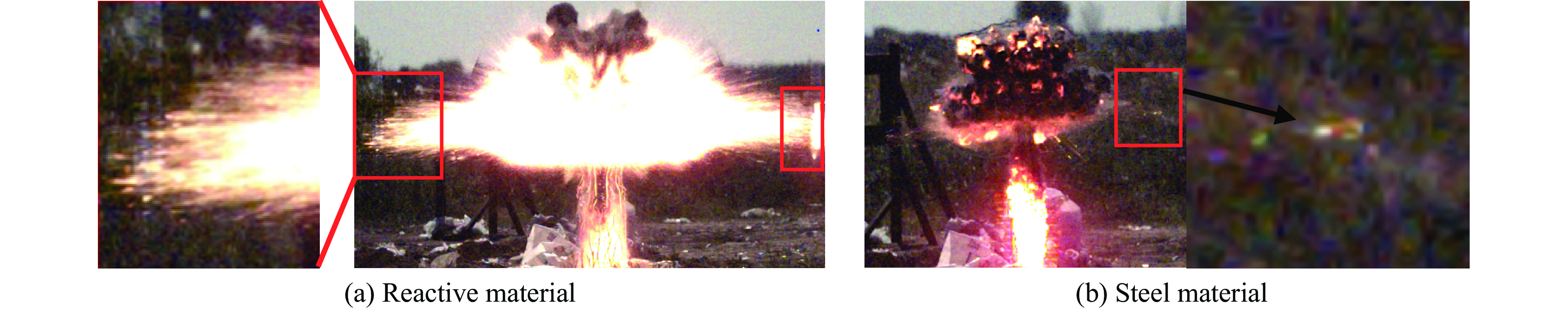 To investigate the explosive energy release of Zr-based reactive material (Zr-RM) casings and the ignition effect of fragments driven by the explosion on fuel, casings composed primarily of zirconium (Zr), copper (Cu), nickel (Ni), aluminum (Al), and ytterbium (Y) were fabricated using alloy melting and casting techniques. The casings mentioned above had an outer diameter of 40 mm, a height of 80 mm, and a wall thickness of 5 mm. For comparison of subsequent damage effects, steel casings made of 45 steel with the same dimensions and mass were also prepared. Both types of casings were filled with JH-2 explosive charges. The charged structures were placed on a polyvinyl chloride pipe stand 1.5 m above the ground, and a fuel box containing 2.5 L of gasoline was positioned 2.0 m away from the explosion center. During the explosion-driven tests, a high-speed camera was utilized to capture the formation and propagation of the explosion fireball, the shockwave, and the impact process of casing fragments on the fuel tank. The fireball duration, shockwave velocity, and fragment impact effects were measured and analyzed. Additionally, the ignition and destruction effects of the fragments on the fuel were observed and recorded. The experimental results demonstrate that, when compared to steel casings of equal mass, Zr-RM casings under explosion-driven conditions exhibit a longer duration of firelight and faster shockwave velocities. Specifically, the fireball duration of Zr-RM casings is approximately 25.84 times that of steel casings, and the shockwave velocity is roughly 1.17 times faster. Zr-RM casings exhibit an enhancement effect on air shockwaves under explosion-driven conditions. Fragments of different materials cause structural damage to fuel tanks, including perforation and plastic deformation. After piercing the fuel tank, the reactive material ignites the fuel inside, demonstrating the ability to ignite gasoline. On the contrary, steel casings of equal mass do not ignite the fuel within the tank. This research provides a reference for the application of Zr-RM casing warheads.