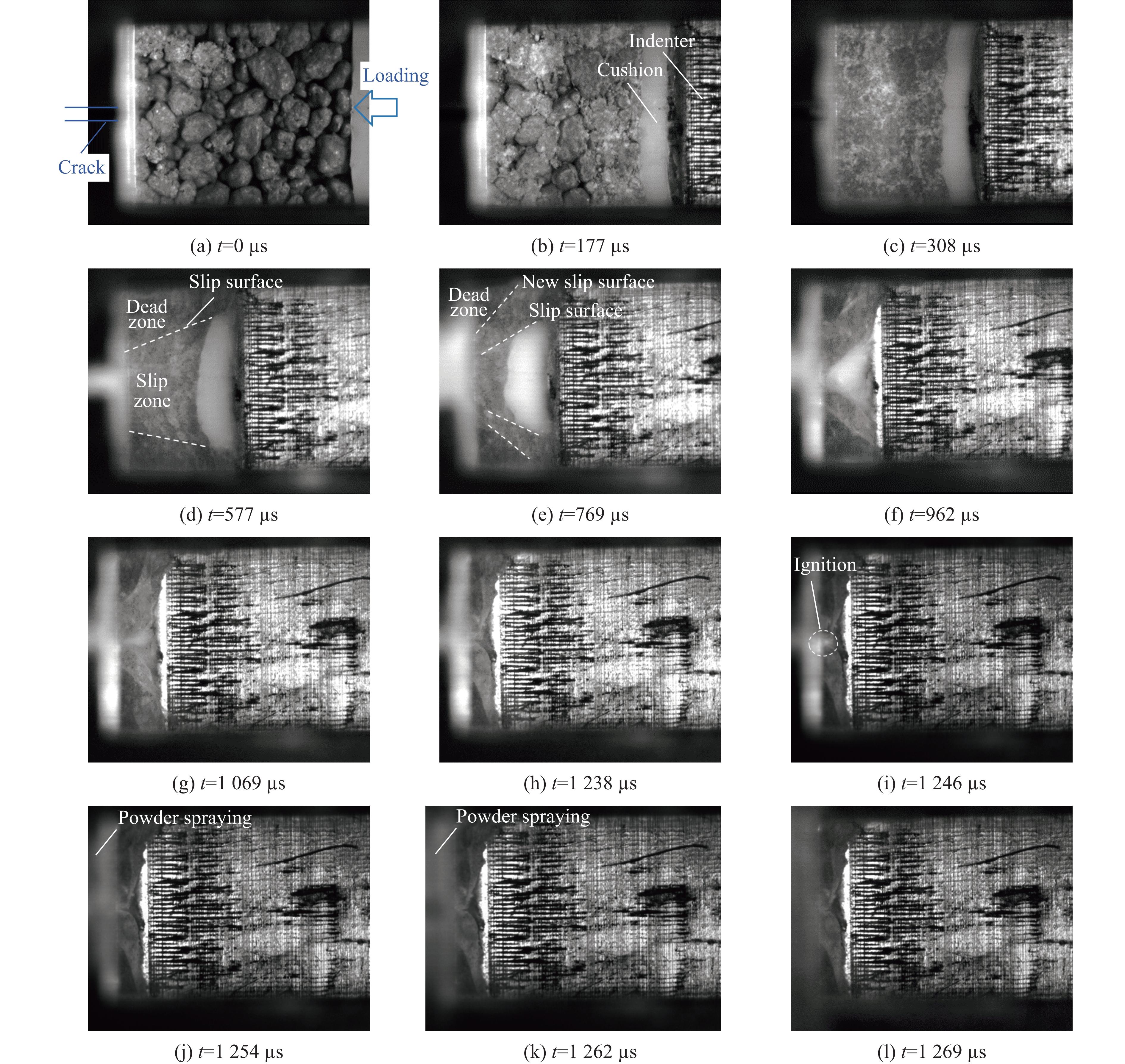 Modeling powder is used to simulate the highly fragmented state of pressed explosives resulting from collisions, and the gap extrusion ignition behavior of PBX modeling powder is studied. Experiments were designed based on the way of projectile impact method. To ensure that no flow space exists except the designed gap, the surface of the sample was covered with cushion and coated with grease for sealing. The movement and reaction of molding powder squeezing into the gap were recorded by high-speed photography. By changing the ratio of gap area to sample cross-sectional area, the influence of compaction on ignition was studied. The results show that in the absence of grease seal, PBX molding powder undergoes particle crushing and compaction, and then the compacted molding powder is extruded from the clearance near the cushion, and ignition occurs in the extrusion process. The ignition position is at the interface between explosive and cushion. In the case of grease seal, PBX molding powder does not ignite for a period of time after compaction. When the indenter moves halfway, a wedge-shaped slip zone is formed, and a slip-dead zone interface could be seen in high-speed camera photos. Then the deformation mode evolves from single-wedge slip zone to double-wedge slip zone, and the shear effect of slip-dead zone interface does not cause ignition. At the later stage of loading, the indenter travels close to the gap surface, and the wedge-shaped slip zone disappears. Before and after the collision between the indenter and the gap, the explosive ignites once in each instance. Compaction effect has an important influence on ignition behavior. After compaction, the threshold value of ignition speed is obviously reduced, with the impact speed required to cause ignition being merely 4.5 m/s.