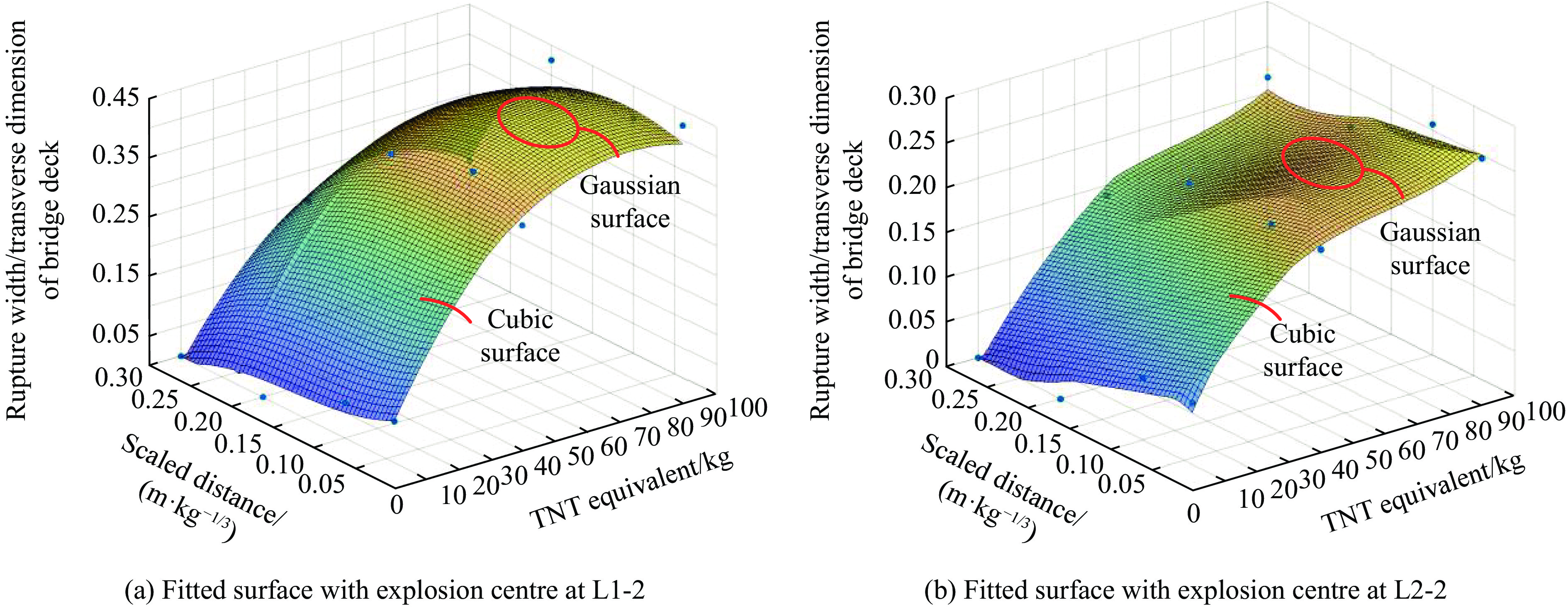 Prestressed reinforced concrete (RC) T-beam bridges are commonly employed in highway bridges construction. After explosive attacks, the deck damage mostly exists in the form of breaches and affects its traffic capacity. While significant attention has been devoted to evaluating post-blast residual capacity of RC beam bridge piers and girders in existing blast damage assessment studies, there remains a critical gap in methodologies enabling intuitive and rapid damage assessment method for bridge serviceability. Therefore, the rapid assessment of bridge deck damage is investigated in this study by combining numerical simulation with multivariate nonlinear regression analysis, in which the breach size of the prestressed RC T-beam bridge deck subjected to explosive loading is taken as the damage index. Through comparative analysis of the transverse size of the deck breach under blast loading, it was revealed that concrete strength exhibits relatively minor influence, whereas parameters including explosion location, deck thickness, diaphragm spacing, TNT equivalent, and scaled distance demonstrate more pronounced effects. Owing to the pronounced reinforcing and constraining effects of webs and diaphragms on the bridge deck, comparative analyses under identical conditions demonstrate that transverse size of the breach caused by explosion above deck areas between webs and diaphragms is significantly smaller than that by explosion directly above the web, while on-bridge explosion exhibit lower damage compared to under-bridge explosion. Based upon the aforementioned parameters with significant influence, utilizing transverse size of the breach as the damage index, a rapid blast damage assessment formula is proposed for predicting the post-blast traffic capacity of bridges.