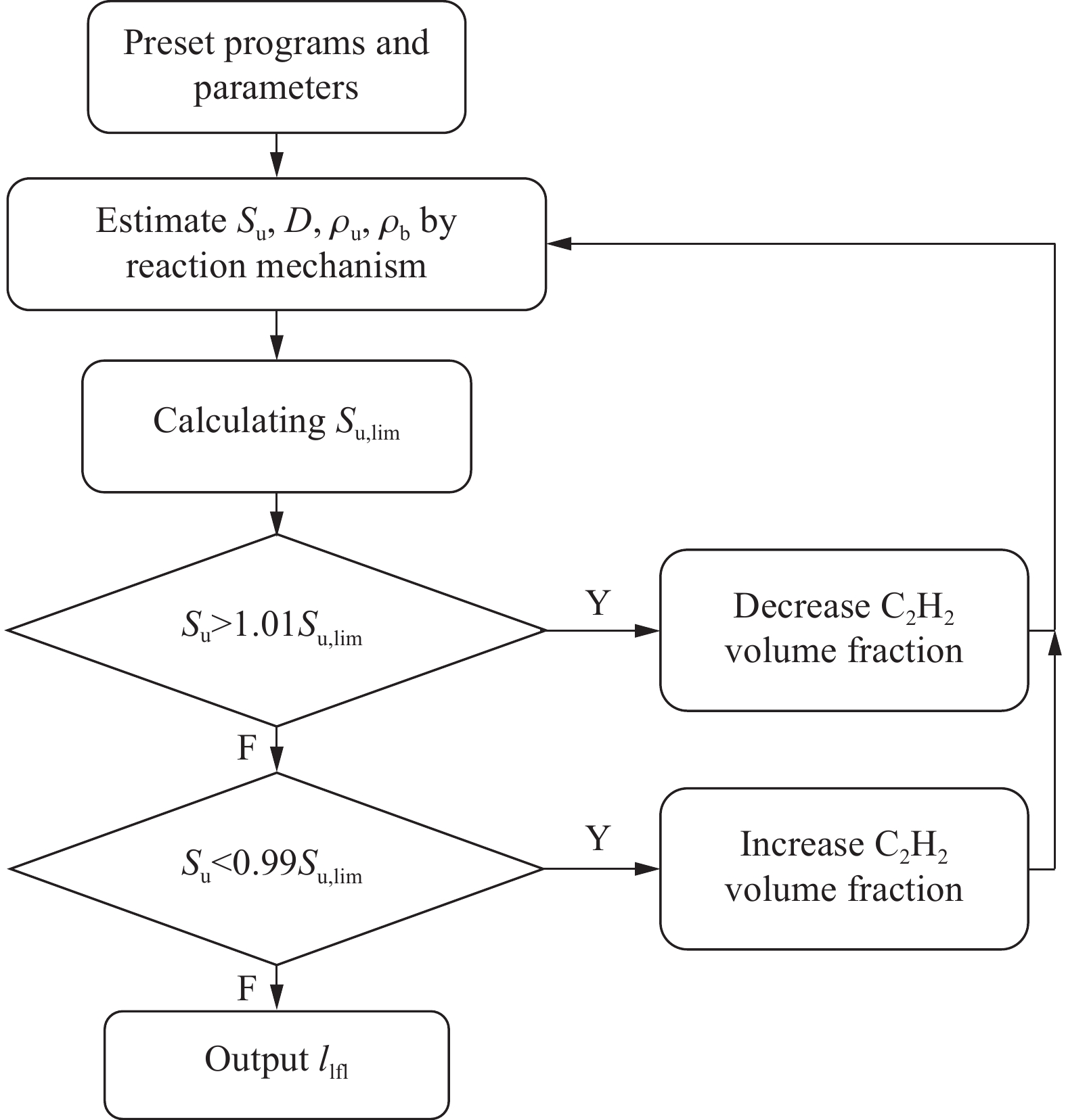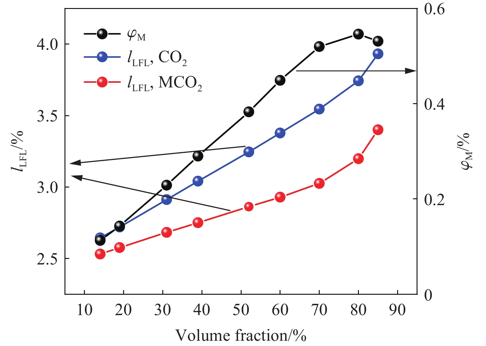 Oxy-fuel combustion is one of the effective means to reduce greenhouse gases. To grasp the combustion characteristics of the clean fuel acetylene in O2/CO2 atmosphere and to investigate the effect of different CO2 volume fraction on the lower flammable limit of acetylene, the lower flammable limit of acetylene was experimentally measured in a 5 L cylindrical explosive reaction device. With the increase of CO2 volume fraction from 14% to 85%, the experimental value of the lower flammable limit of acetylene increased from 2.64% to 3.93%, which was linearly increased in a small range. Compared with hydrocarbon fuels such as ethylene, ethane, and propylene, the lower flammability limit of alkanes, olefins, alkynes decrease sequentially, indicating that alkynes have a larger combustion range and a higher hazard factor. Based on the calculation model of limiting laminar burning velocity method, a prediction model applicable to the lower flammability limit of acetylene was established. Through the verification of experimental data, the average absolute error of this prediction model using the USC Ⅱ combustion reaction mechanism is at 0.52%, and the model is accurate and reliable. To explain the reason for the existence of the lower flammability limit from the perspective of the competition between the temperature rise of the heat generation from fuel consumption and the temperature drop of the heat dissipation from the expansion of the fuel body, this study examines the thermodynamic, chemical, and transport effects of CO2 on the lower flammability limit. The combustion reaction mechanism of USC Ⅱ is modified to incorporate the virtual substances FCO2, TCO2, and MCO2, and comparing the flammability limits of the three virtual substances as well as those of the five atmospheres of N2 and CO2. The thermodynamic, chemical and transport effects of CO2 on the lower flammability limit were discussed. The results show that the average proportion of thermodynamic effect is 64%, chemical effect is 35% and transportation effect is 1%.