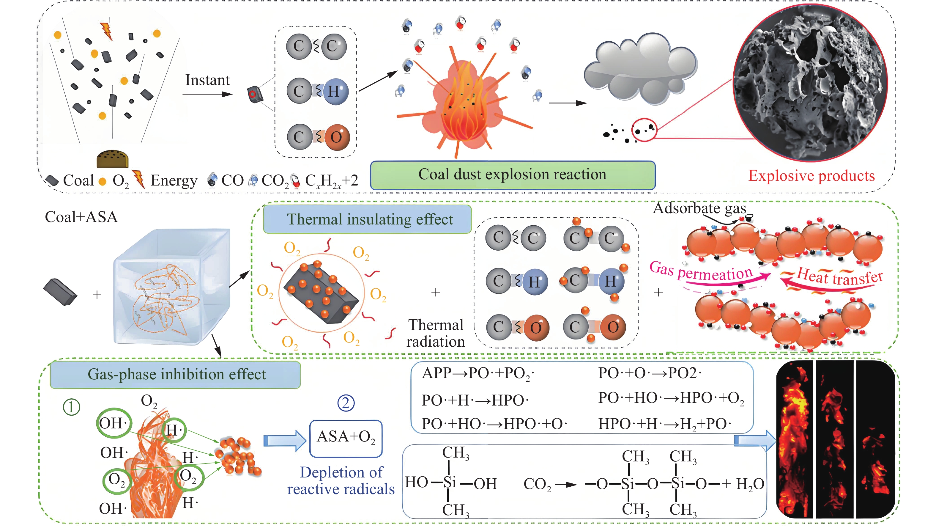 Polypropylene (PP) is widely utilized in industrial production, yet PP dust generated during its production and transportation can form explosive dust clouds, leading to severe dust explosion accidents that threaten personnel and equipment safety. To address this issue, a novel explosion suppressant, NiP@Fe-SBA-15, was synthesized to inhibit the propagation of PP dust combustion flames. The synthesis involved modifying SBA-15 mesoporous silica with Fe ions and subsequently loading NiP, resulting in a composite powder with uniformly dispersed active components and a well-preserved mesoporous structure. Characterization via SEM-Mapping and N2 adsorption-desorption experiments revealed that NiP@Fe-SBA-15 maintains a high specific surface area, exhibits a regulated pore structure, and shows no significant particle agglomeration. The Hartman tube explosive testing system was employed to evaluate the effect of NiP@Fe-SBA-15 on PP dust deflagration. Results indicated that as the NiP@Fe-SBA-15 additive increased, the flame propagation speed, brightness, and flame length of PP deflagration decreased significantly, with flame propagation almost completely inhibited by a suppressant dosage with the mass fraction of 70 %. The dual explosion suppression mechanism of NiP@Fe-SBA-15 was analyzed. Physically, NiP@Fe-SBA-15 occupies reaction space, reducing oxygen and combustible volatile concentrations, while the SBA-15 molecular sieve, exposed by thermal decomposition of the suppressant, absorbs heat and forms a physical barrier, thereby reducing combustion intensity. Chemically, NiP decomposition releases Ni· and P· radicals that consume key free radicals (H·, O·, OH·) in combustion reactions, interrupting explosion chain reactions. Meanwhile, Fe-based species rapidly oxidize to Fe3O4, reducing oxygen availability and further weakening combustion intensity. In summary, NiP@Fe-SBA-15 was proven to be an effective explosion suppressant for PP dust explosions, reducing combustion intensity through combined physicochemical synergies. This research provides a new approach to enhancing polypropylene industry safety. Future work will focus on optimizing the industrial application of NiP@Fe-SBA-15 explosion suppressants while addressing cost, environmental sustainability, and stability issues to further advance dust explosion prevention technology.
