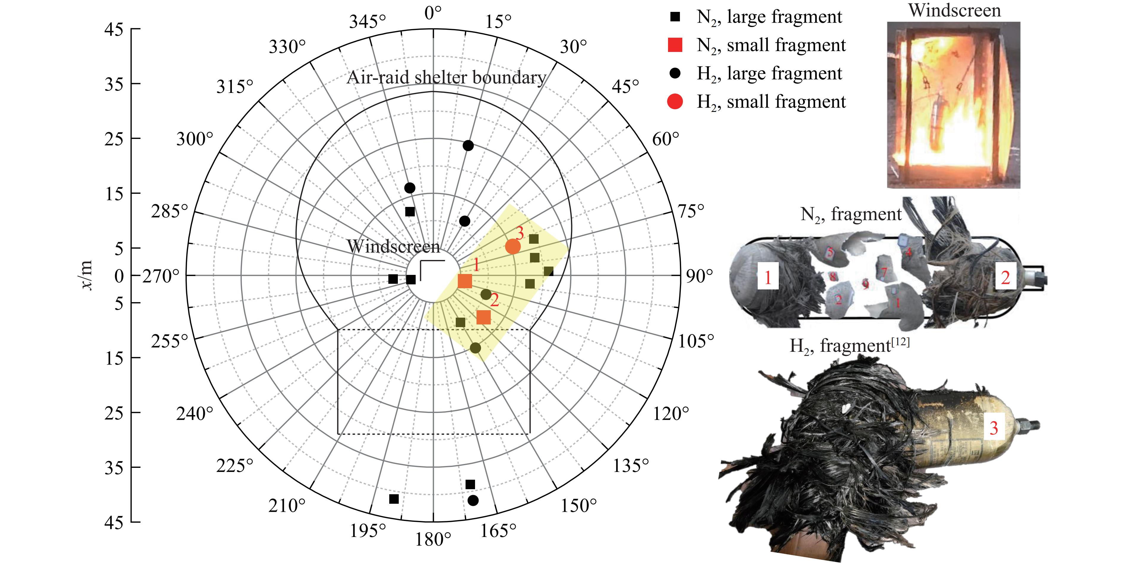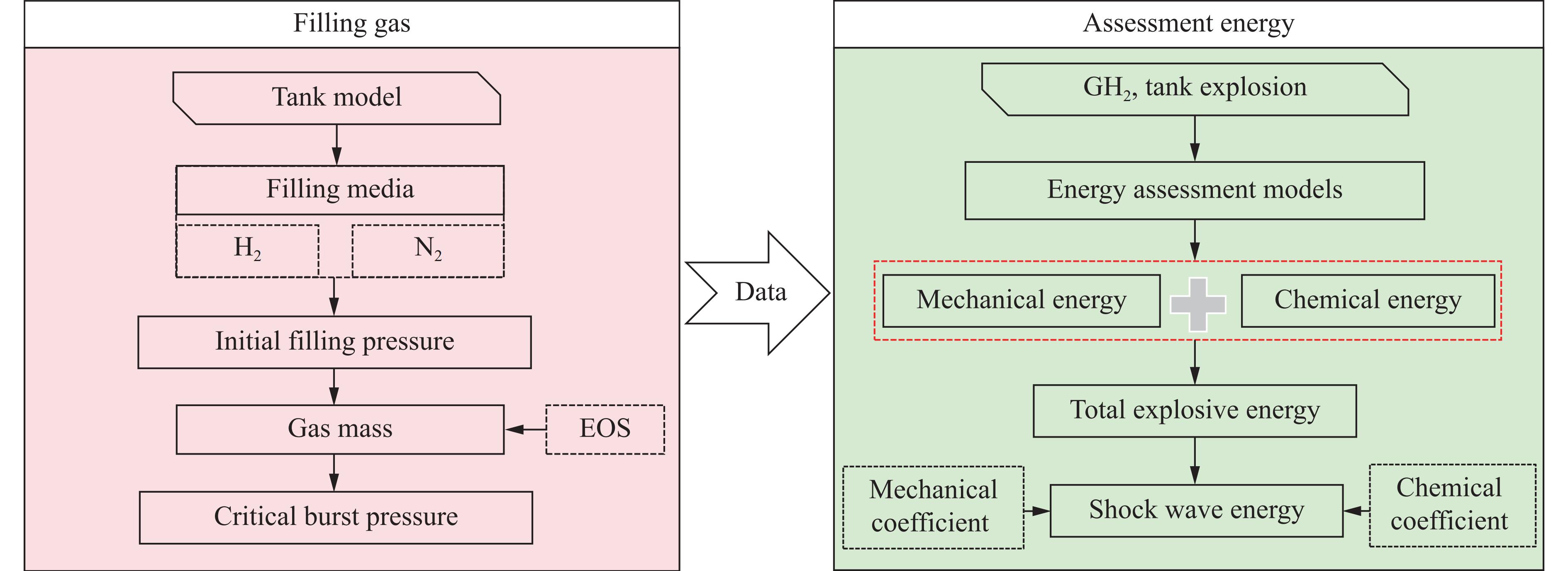 Understanding the generation, transformation, and dissipation mechanisms of energy in high-pressure tanks during fire scenarios is of critical significance for the consequence assessment of explosion accidents. This study investigates the differences in properties between high-pressure hydrogen storage tanks and nitrogen tanks under fire conditions through comparative experiments. Fire tests were conducted using 6.8L-30MPa type Ⅲ tanks. The results indicate that fire exposure can significantly impair the pressure-bearing capacity of the tanks. Specifically, the critical bursting pressure decreased from 125.1 MPa at room temperature to 46.8 MPa under fire conditions, representing a reduction of 62.6%. The explosion dynamics of hydrogen tanks were characterized by typical physical-chemical composite features. A fireball with a diameter of 9 m was formed during the explosion. The peak shockwave pressure measured at a distance of 2 m reached 882.47 kPa, with a positive pressure duration of 168.11 ms. In contrast, nitrogen tanks experienced only physical explosions, with a peak shockwave pressure of 59.42 kPa and a positive pressure duration of merely 2.17 ms. This study analyzed the energy conversion pathways during explosions of high-compressed gas tanks (H2 and N2) in open environments. A novel method for assessing the blast power of hydrogen storage cylinder explosions in unconfined spaces was developed. Initially, the physical explosion energy was calculated based on fundamental parameters such as critical burst pressure, nominal volume, and initial filling pressure of the high-pressure tanks. The applicability of five mechanical energy calculation models was compared. Subsequently, the mass of hydrogen was determined using the actual gas equation, and the total chemical explosion energy was derived by integrating the heat of combustion of hydrogen. Finally, considering the contributions of mechanical and chemical energy to the shock wave intensity, the total explosion energy was converted into shock wave energy using an open space energy correction factor. Quantitative analysis and error verification were conducted in conjunction with measured data. The findings of this research provide essential support for enhancing risk assessment of explosion accidents involving high-pressure hydrogen storage devices.
