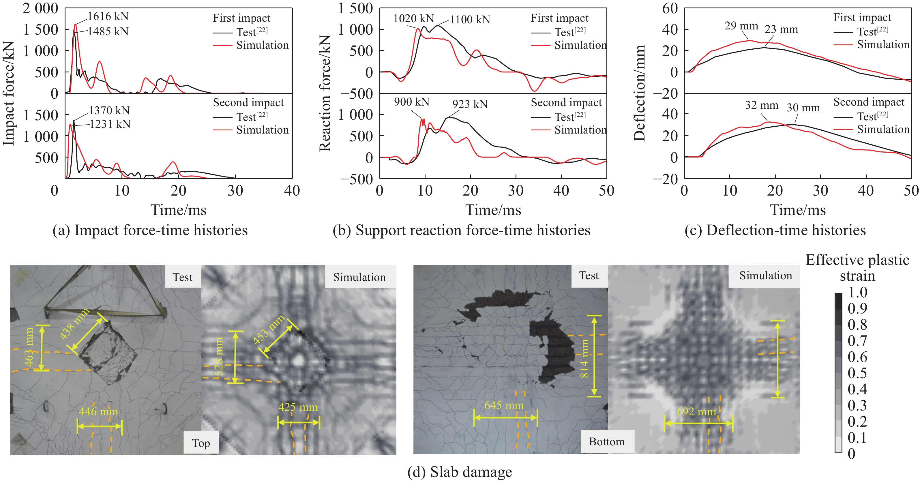 为评估超高性能混凝土(UHPC)板在中远距离爆炸载荷下的抗爆性能,本研究开展了系列场地爆炸试验,系统分析了不同比例爆距对试件破坏模式的影响,并通过四点弯试验探讨了爆后残余承载力变化规律。试验结果表明,UHPC板在中远距离爆炸下整体结构保持完整,呈现典型弯曲损伤模式,背爆面损伤集中于跨中区域。其中,比例爆距为1.0的靶板残余承载力甚至超过未爆试件,表现出优异的抗爆性能。为深入揭示UHPC板的动力响应机理,建立了等效单自由度(SDOF)理论分析模型,对不同比例爆距下靶板的跨中峰值挠度进行了预测。理论分析表明,SDOF方法在预测跨中峰值挠度方面精度较高,但在损伤较轻时存在一定高估。为进一步研究UHPC板破坏机理,采用连续面帽盖模型(CSC)本构模型对UHPC板的爆炸响应进行了有限元模拟。模拟结果与试验结果高度吻合,验证了有限元模型的准确性。考虑到材料力学性能的不确定性,引入高斯自相关空间随机场建立随机有限元模型,当自相关长度为10-20 mm时,预测的损伤特征与实际高度一致。本研究验证了UHPC在中远距离爆炸下的优异抗爆性能,证明了随机有限元模型的高保真性和有效性,并揭示了材料变异性对UHPC结构抗爆性能评估的重要影响。