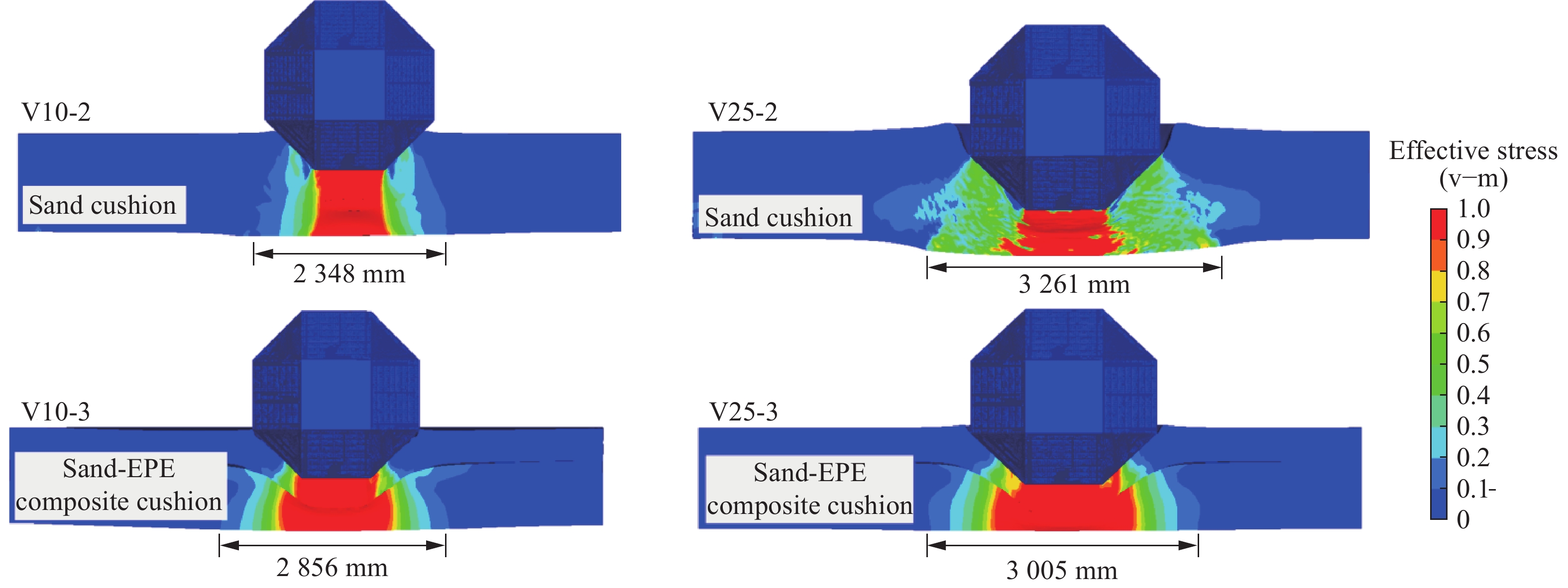 随着超高速武器的飞速发展,开展超高速武器战斗部侵彻混凝土遮弹层效能分析对于新建和已建防护结构的设计与安全评估具有重要意义。针对超高速武器战斗部打击普通强度混凝土(normal strength concrete, NSC)、超高性能混凝土(ultra-high performance concrete, UHPC)和刚玉块石混凝土(corundum rubble concrete, CRC)3种典型遮弹层问题,首先,通过对比钢/钨合金弹体侵彻3种靶体试验和数值仿真结果,验证有限元仿真分析方法中数值算法、网格尺寸和材料模型参数取值等的可靠性;然后,基于侵彻深度和弹体残余长度等效的网格过渡策略,建立了适用于原型工况分析的数值仿真分析方法;最后,在Ma为3~8工况下,开展了对AGM-183A超高速武器战斗部侵彻3种遮弹层的数值模拟。结果表明:AGM-183A超高速武器战斗部分别以Ma=4、Ma=4和Ma=3侵彻NSC、UHPC和CRC遮弹层的极限侵彻深度分别为4.26、3.74和1.00 m,侵彻速度继续增大时,弹体弧柱交接处因局部应力集中发生断裂等结构失稳现象,导致侵彻效能下降。与常规声速钻地武器战斗部SDB、WDU-43/B和BLU-109/B侵彻爆炸破坏深度相比,AGM-183A侵彻NSC遮弹层的深度分别达到3.2、1.6和1.8倍,侵彻UHPC遮弹层的深度分别达到4.7、2.1和2.2倍,侵彻CRC遮弹层的深度分别达到3.4、1.3和1.5倍。3种遮弹层抗AGM-183A超高速武器战斗部侵彻的建议设计厚度分别为8.01、7.03和1.88 m,UHPC相对NSC遮弹层的抗超高速侵彻能力提升不明显,CRC遮弹层可以有效兼顾抵抗常规声速和超高速战斗部打击,建议设计时优先采用。