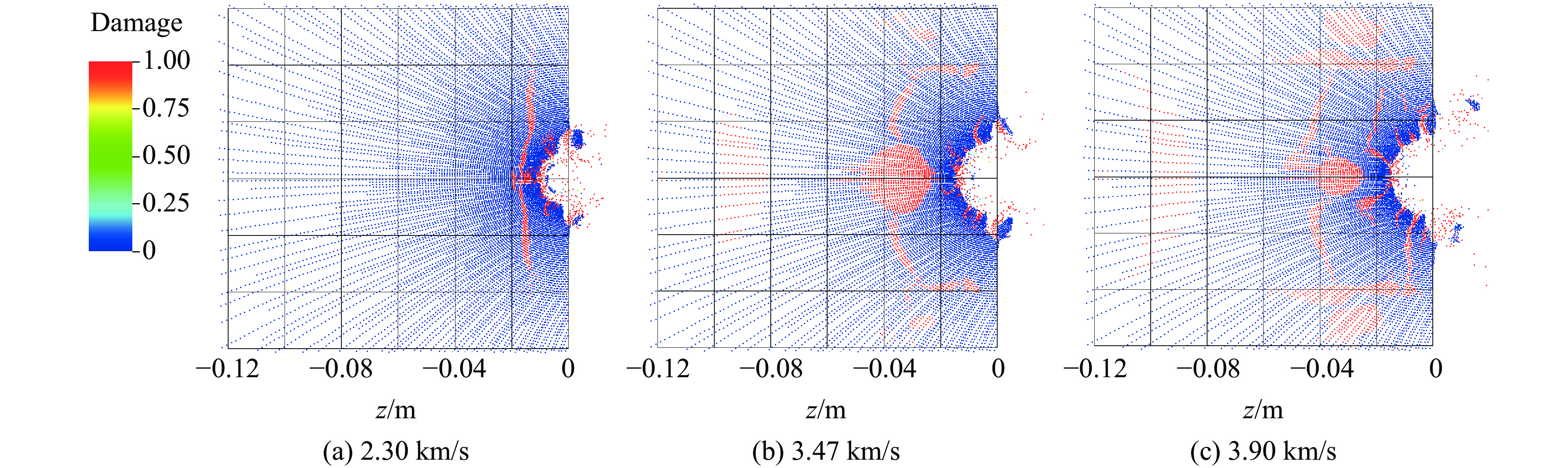 When a high-velocity fragment impacted the fuel tank, hydrodynamic ram occurred. The fuel spurt caused by hydrodynamic ram may result in the ignition or even explosion of the fuel tank, thus threatening the survivability of the high-value target. To study the characteristics of fuel spurt caused by the hydrodynamic ram event, an experiment of a high-velocity fragment impacting a simulated fuel tank was conducted, and the characteristics of velocity and spatial distribution of the fuel spurt were tested and analyzed. In order to quantitatively describe the initial motion velocity of the fuel spurt and the attenuation process of its movement in the air, the specific volume unit within the fuel was defined as fuel mass. The concepts of initial motion velocity v0 and dispersion velocity of the fuel mass were proposed. The process of fuel mass spurting from the penetration orifices was simplified into three stages: (1) the fuel mass was about to spurt out, (2) the fuel mass spurted from the penetration orifices; (3) the fuel mass was moving in the air and gradually became atomized. On this basis, the theoretical model of the distribution of fuel spurt was established. According to the cracks at the penetration orifices and the shape change of the material at the edge of the orifices, the value of the coefficient of discharge was classified, and the influence of the distribution of pressure in the fuel was also taken into account during the calculation. When v0≤737 m/s, the range of Cv is from 0.60 to 0.70. When 737 m/s<v0<906 m/s, Cv ranges from 0.25 to 0.55. When v0≥906 m/s, Cv ranges from 0.75 to 0.95. The research showed that the average error between the calculation results of the fuel spurt axial distance and the experimental results was less than 15%. The error between the calculation results of the corrected theoretical model of radial distance and the experimental results was about 5%. The calculated results of the theoretical model were in good agreement with the experimental results.